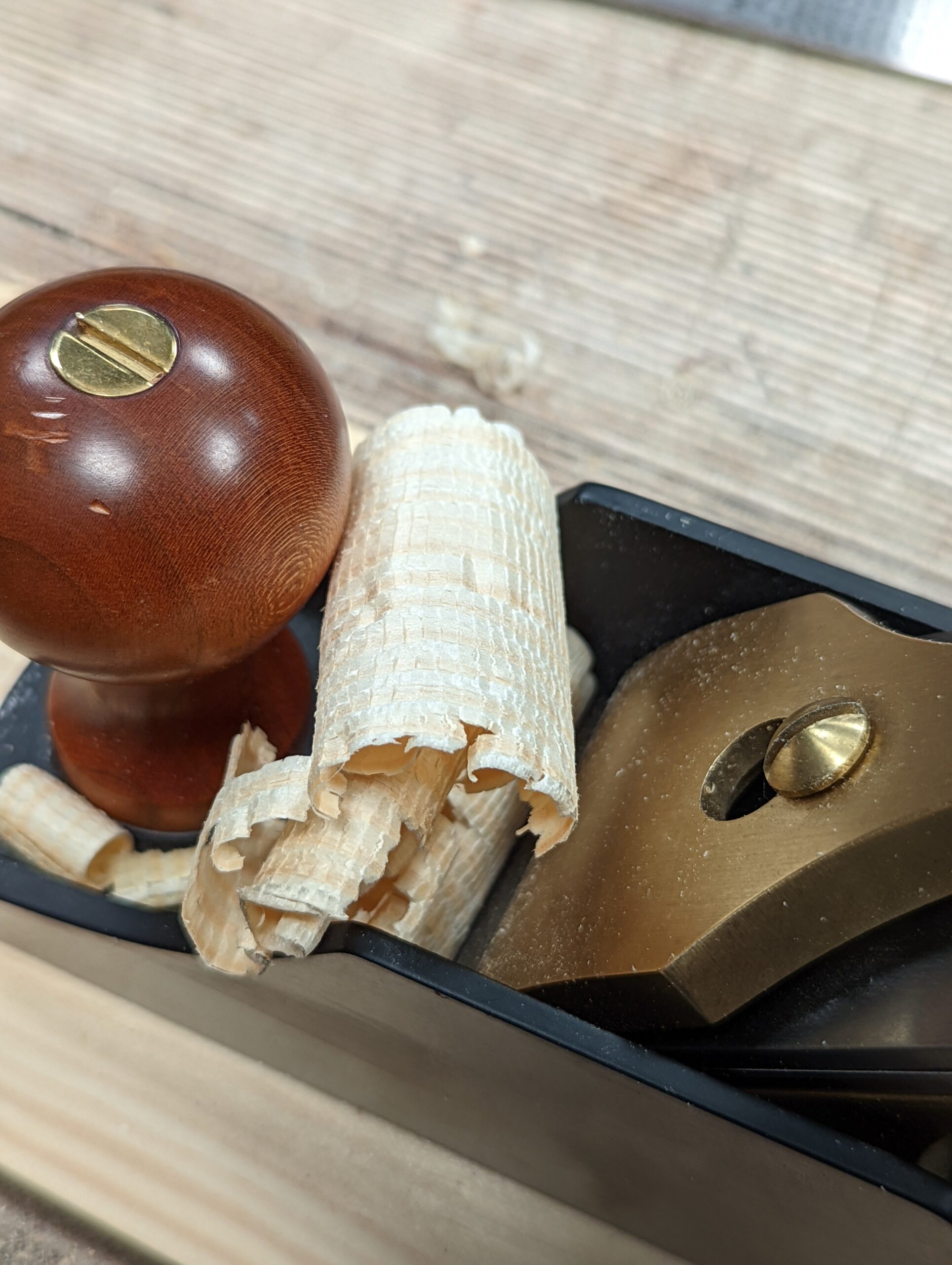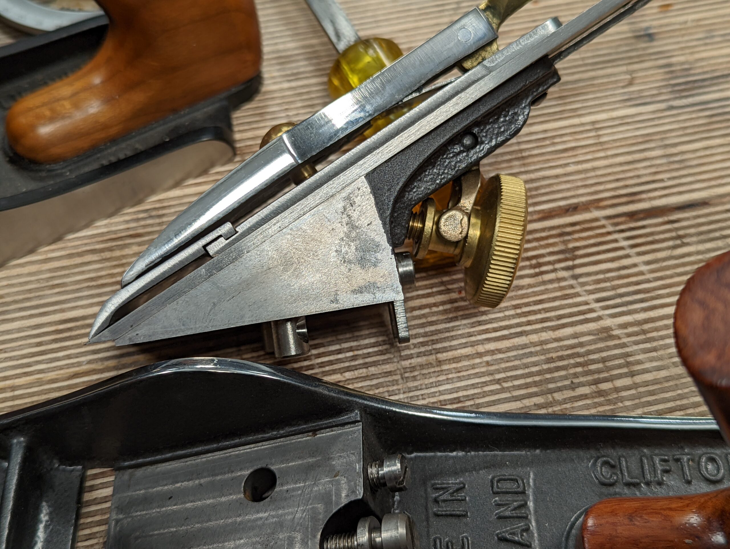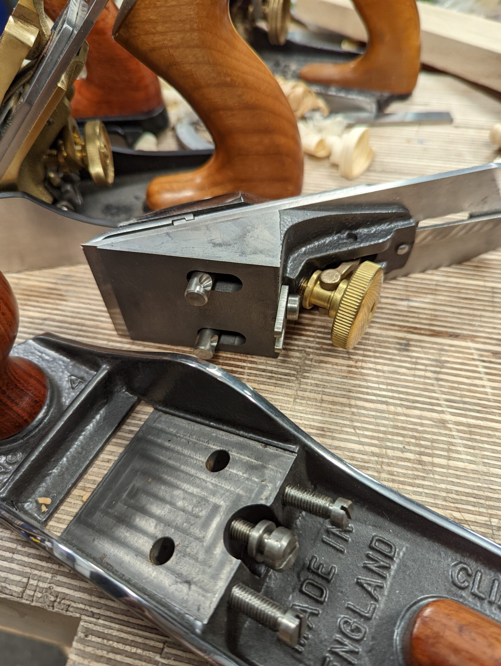 In my tests on the BedRock high-end planes, the shavings went from a near and, for me, immeasurable thinness to an impossible stroke because of the vastly increased depth of cut resulting in excessively thick shavings. This is without changing the setting of the depth via the usual way using the adjustment wheel. We should perhaps talk about this first. I initially recognised this at a US travelling woodworking show where a demonstrator showcased the ease with which he changed the setting of the throat opening to an audience of a half a dozen men. This feature seemed to fascinate the cluster of people surrounding the planing demonstrator yet he never told the audience that you rarely and in many cases never actually use the feature at all. They smiled and marvelled at the efficiency and the engineering, the weight of the plane and its fine feel and combined with an explanation of how this had improved over "ordinary planes such as the Bailey-planes" I became more interested. Just what was this about it being easy to change the throat opening?