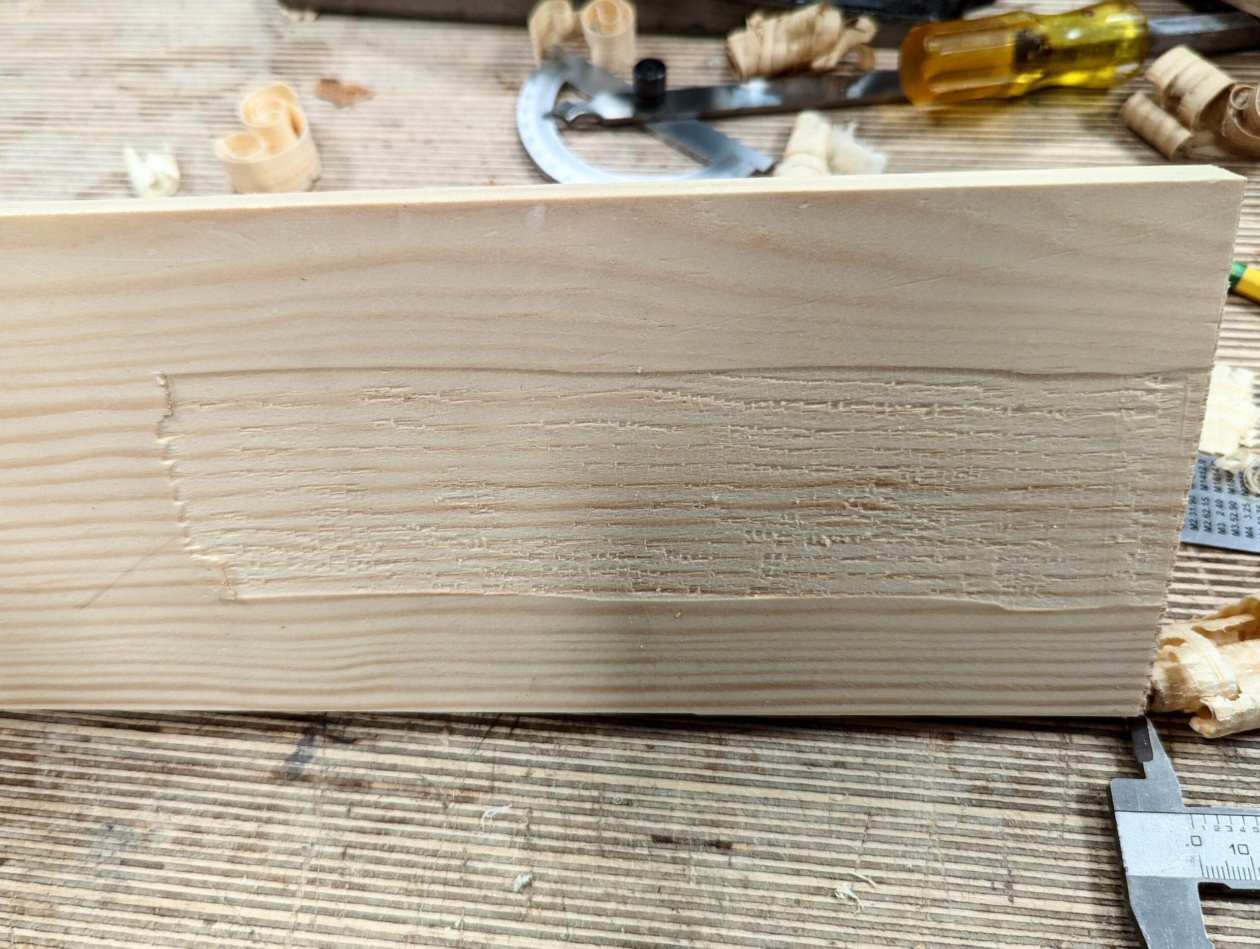 Turning the centre setscrew that shunts the frog up or down its inclined platform on the insides of the soles of any and all BedRock planes one full revolution from the zero point, the point of taking the most minutely thin shaving off the wood, closes down the mouth opening from about 2mm to somewhere close to give or take 1mm. It's a small but necessary gap, not much of an opening at all, but one you might go to to tackle something really wild and difficult on a special hardwood you needed for something you are making. But here is the real issue. The depth of cut achieved by any turn large or small to close down the throat some also markedly alters the depth of cut and takes the blade down through the throat of the sole by about as deep as you can set the plane depth to using the wheel depth adjuster. In other words, the cutter will not take a shaving so much as gouge deeply into the wood and most likely scar it irreparably as shown above. The chief and significant point in this is that this change always happens and cannot not happen. On standard Leonard Bailey pattern planes, on the other hand, this never happens with changing the position of the frog on the much-dissed Bailey-pattern plane because it cannot happen. Why? The frog is set paraplanar to the face of the sole on two levels but without any incline so moving the frog backwards and forward is a parallel motion along fixed-height points.