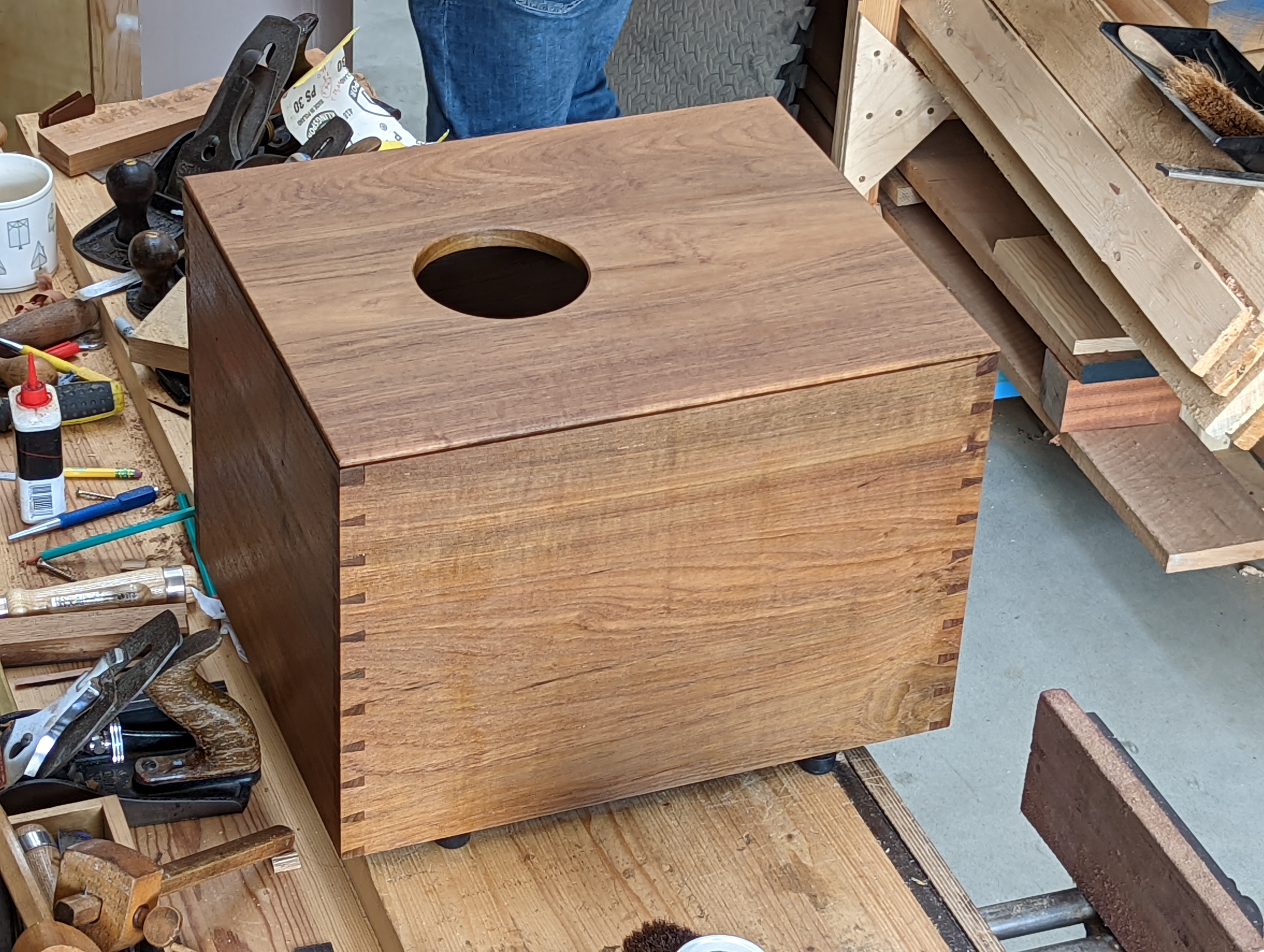 John just completed a cahon, a simple Peruvian drum slapped and tapped to a rhythm by the user who sits on it to play it. As I watched it come together from a 1950s teak desk he dismantled for the wood. As I watched him take the desk apart he showed me many things the maker had done to make the wood wider and longer and work for him. I am sure he'll blog on this at some point. He made this in celebration of his becoming an uncle to a new niece for the mother of the baby. These are things we makers do. It's nice and you can't buy it off of a conveyor belt. Watching the dovetails come together I could see myself in the making of it. The techniques passed on in simple things like multiple glue-ups of a dozen dovetails all at once so the risk of glue-freeze is minimised is my reward. The joints go together and are taken apart for good reasons. I remind myself of George asking me, "What are you doing? and me saying testing the joints to see if they fit and him saying back to me, "Why do you need to do that? meaning the joints should only go together the one time: when the glue up comes is the first and last time!