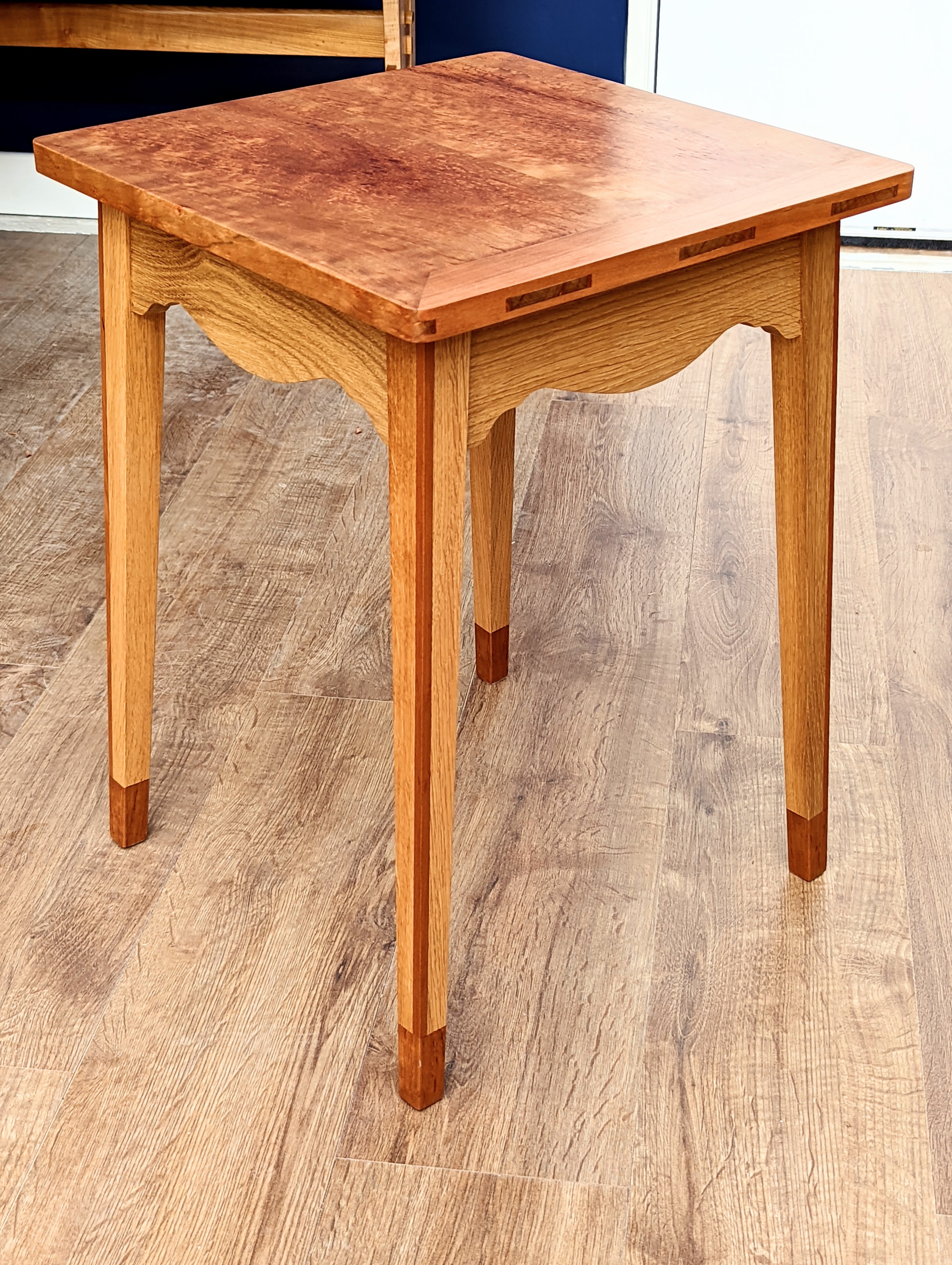 I can't even begin to tell you how many pieces Hannah makes in her workspace here at the shop. It always includes presents for friends and family, anything from turned bowls to carved dishes engraved with the names of bride and groom. Or it could be a dining table, brooches, necklaces and other things conjured up in her mind for making. She's inventively creative, empowered by skilled ability you only see rarely in a lifetime and in no more than a handful of people these days. Why do I say that? Her ideas always create an awkwardness that stretches her. She pushes herself by never accepting the ordinary knowing that because she has hand skill she is not restrained or constrained by what a machine will replace her skills with. The freedom of hand work has opened doors no other method of making can. Her inventiveness builds on this inventive and creative knowledge and takes her into realms few people can go to. She's the extraordinary I speak of that comes purely from her owning skill and skillfulness. The only rotary cut in her woodworking is when she uses the lathe -- the rest is always handwork. Why? Because she chose skill over ease. Simple! I turn around one minute and there is the most beautiful picture from angular segments of well-orchestrated wood, the next a pristine table flawlessly executed using techniques we taught in a video years ago but with the added detail only she could come up with. Look at the feet to the tapered legs, the corners neatly trimmed with a contrasting wood. She's a gifted maker and designer!