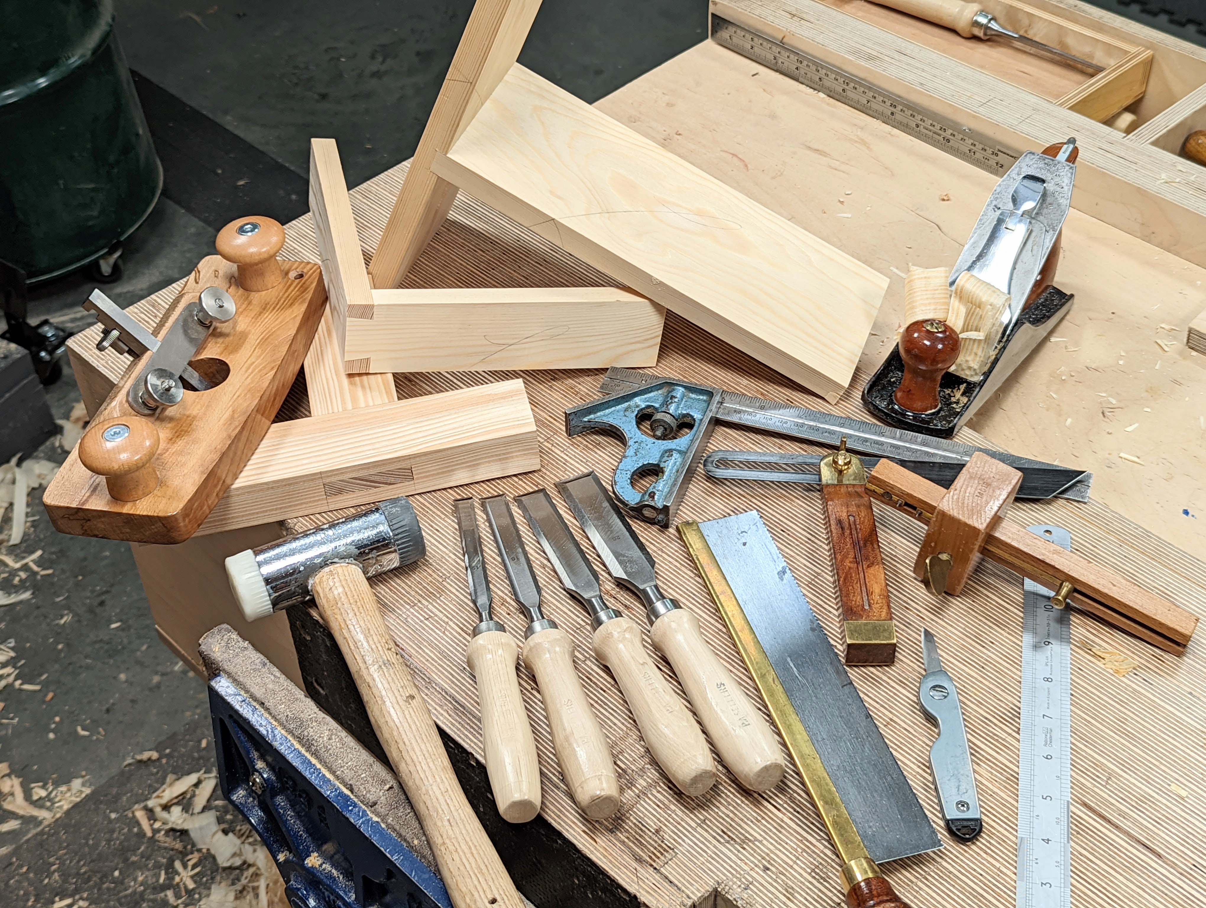 Glimpsing over the stair rail of the metal stairs as I pass the workbenches of three makers is the treat I love most. I never know what I will see. A chisel takes a series of mallet blows and a mortise chopped by a steady rhythm gapes openly as the chips clear beneath the sweep of a hand. It takes a year or two for rhythms and beats to register a synchrony made individually by a maker. From my workshop, I can tell who it is that's chopping by such rhythms and sounds. Even pare cutting gives off sounds by one maker that cannot be replicated by another. The opening and closing of a vise, the placing of the planes on the benchtop. I remember first knowing such things as a boy maker in the early days of my apprenticeship. Other apprentices seemed not to care so much for woodworking as was the case with some of the men. There was no rhythm you see. Of course, the rhythm of craftsmanship isn't formed in the first days, but you get a feel as you watch someone emerging in their working. I saw this once in an Israeli car mechanic once. His tools aligned, rarely thrown, perhaps gently tossed and never dropped. There was an exactness that somehow defied mere mechanics but elevated him above the mere nuts-and-bolts fitting of parts into the multidimensional harmony I speak of.