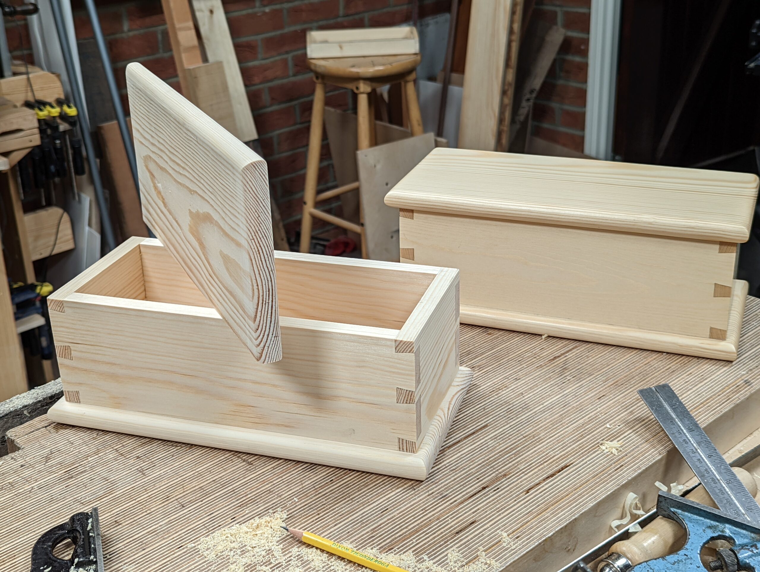 John's workbench was the simple kind I encourage everyone to work from after making their own. In woodworking, we make choices good and bad and often we make the bad choice work for us. Hand tools should be simple and uncomplicated. The Stanley #4 and 5, 4 1/2 and 5 1/2 pretty well replaced the complexities of day's making of single wooden versions of the plane to well-suit a world emerging from world warring. The craftsmen of Britain and the USA made them work as they adapted and adopted the new. Eventually, they grew to work them as well as the wooden ones despite the weight. Where and why massive workbenches came into being I will never know. Mostly an article here and another there. Woodworkers seem to like big for benches even though they are really unnecessary for 99% of woodworkers. It's a luxury most woodworkers could never afford in money, time to make, size and then the no small event of finding somewhere to keep it and work at it. I downsized from my eight-foot by 40" workbench, a two-person bench, to the ones work from now which are roughly five feet long and 24" deep. I've never had any issue in anything `i have made and it stays put even when made from lighter-weight woods like spruce or pine.