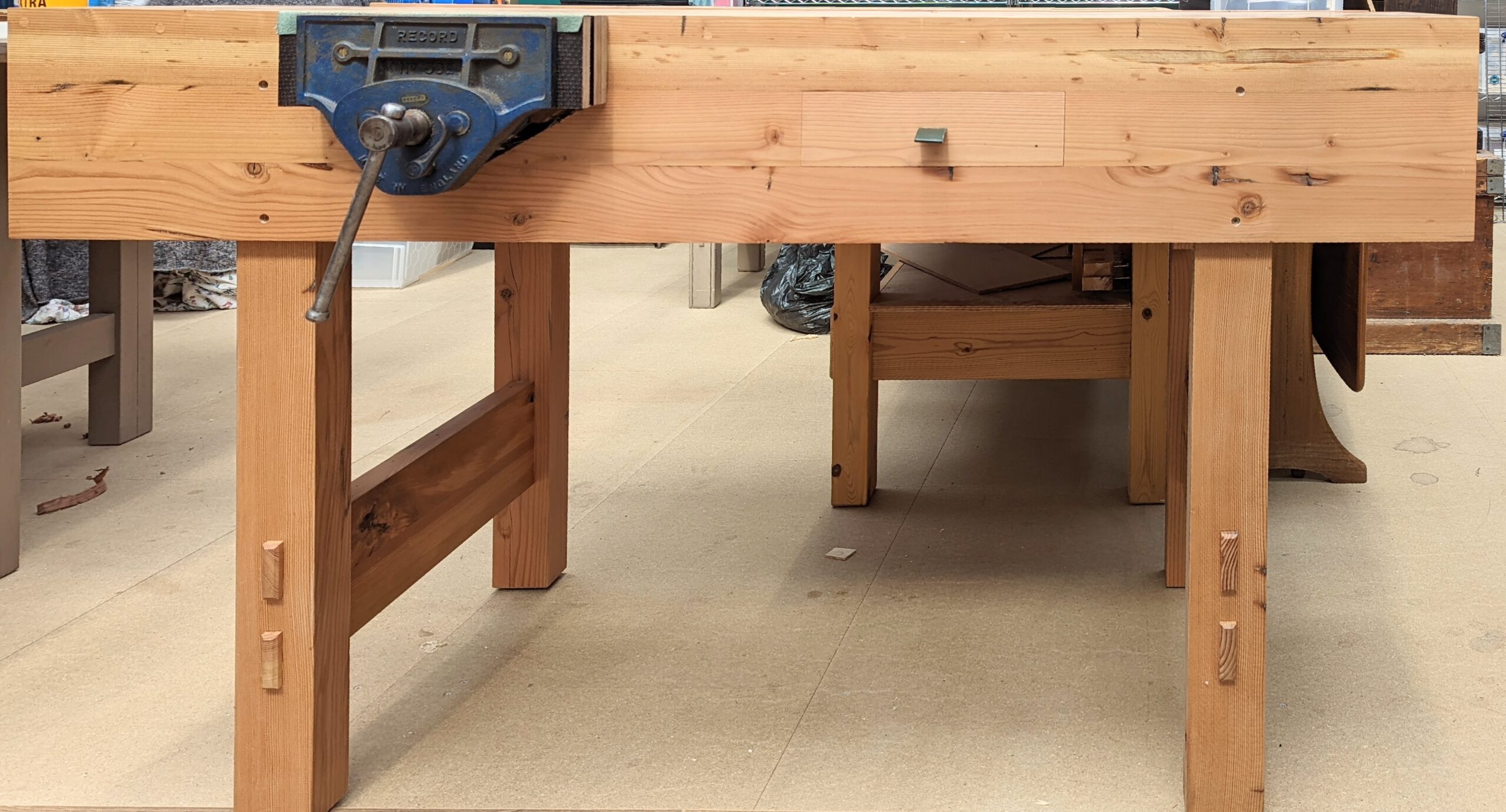 My design can be turned end for end or placed against a garage wall in a heartbeat. But, anyway, simplicity is the key to peace and I found it in a workbench everyone anywhere can build for a modest sum and I could make mine in a ten-hour day plus some extra for the vise fitting and making a drawer. The one in my plywood workbench, the drawer, took me two hours to make and another two hours to create the enclosure for. Not too shabby.