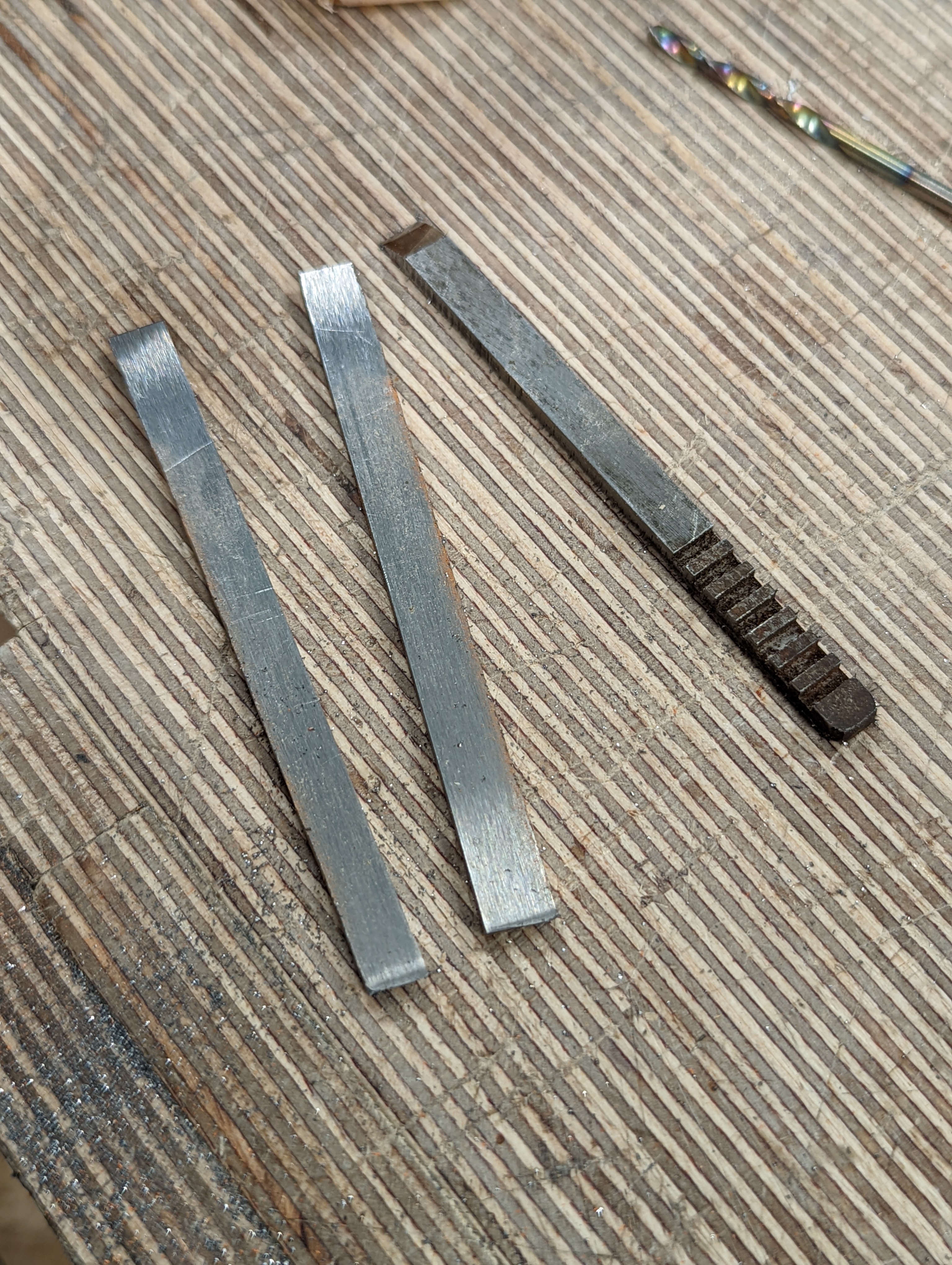 I ordered in a piece of O1 flatstock 3mm (⅛”) by 15mm (⅝”) by 500mm (19 ⅝”) just in case. That way, when I need a piece of tool steel it's there ready. Today, I needed it. You never know when you might need a new cutter, customised 1/16" chisel or maybe a small knife blade you can’t buy off the shelf or on eBay, do you?