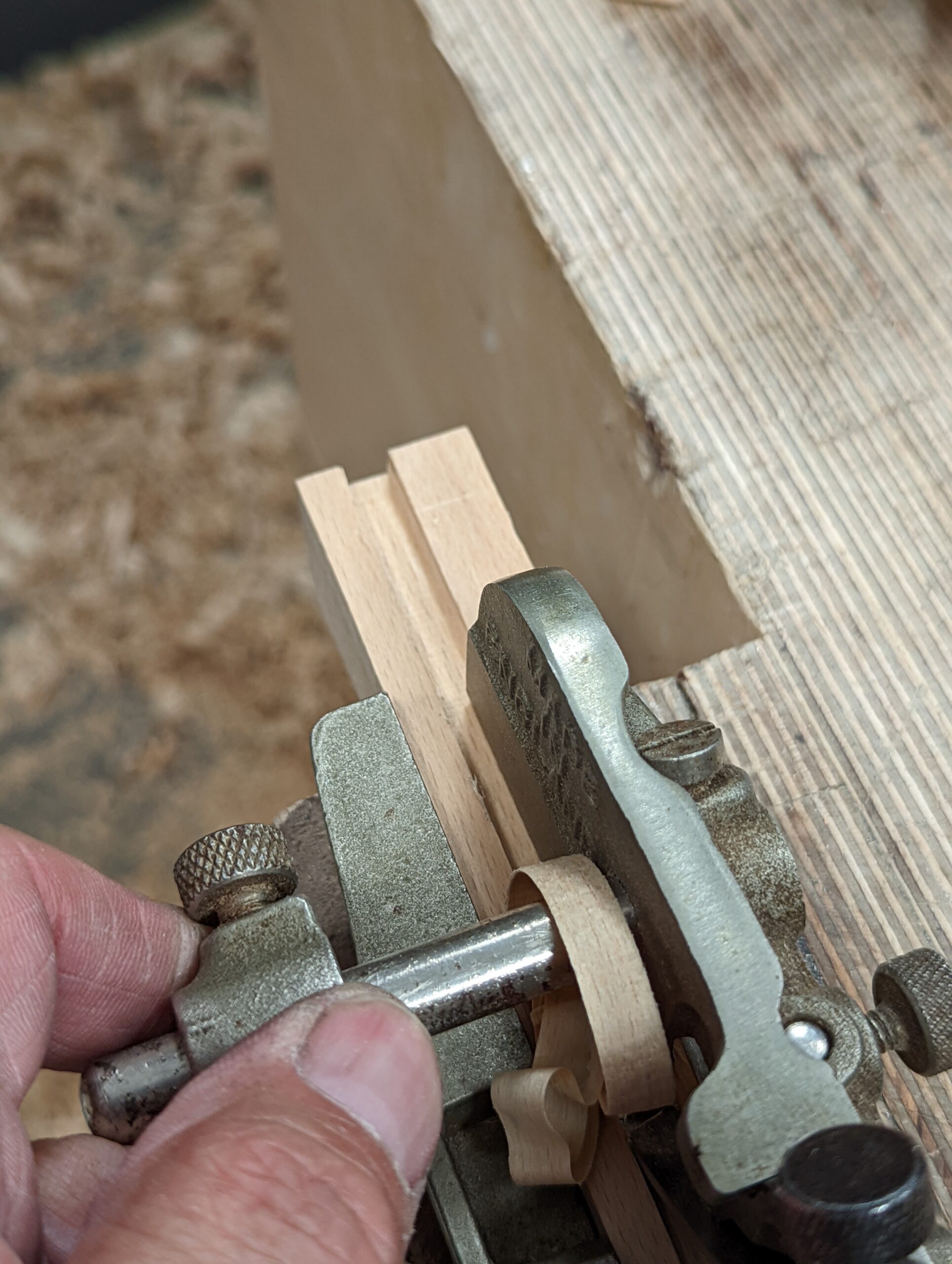 The plough plane cutter of 9/32” didn’t exist for my Record #044 so I took a hacksaw to the steel, cut the width plus a bit and then filed the rough side straight and true and then trapezoidal just a hair. To cut the steel with the hacksaw took three and a half minutes. To file the 25º bevel took 50 file strokes with a 10" flat file so about a minute and then to double up two hacksaw blades in the hacksaw and slide out the grooves for the adjuster was a minute a piece, no more. Technically, I only needed the one groove, remember, but I went ahead anticipating I’ve got at least 30 more years of woodworking in me as I am only 72 years old yet. Joking!