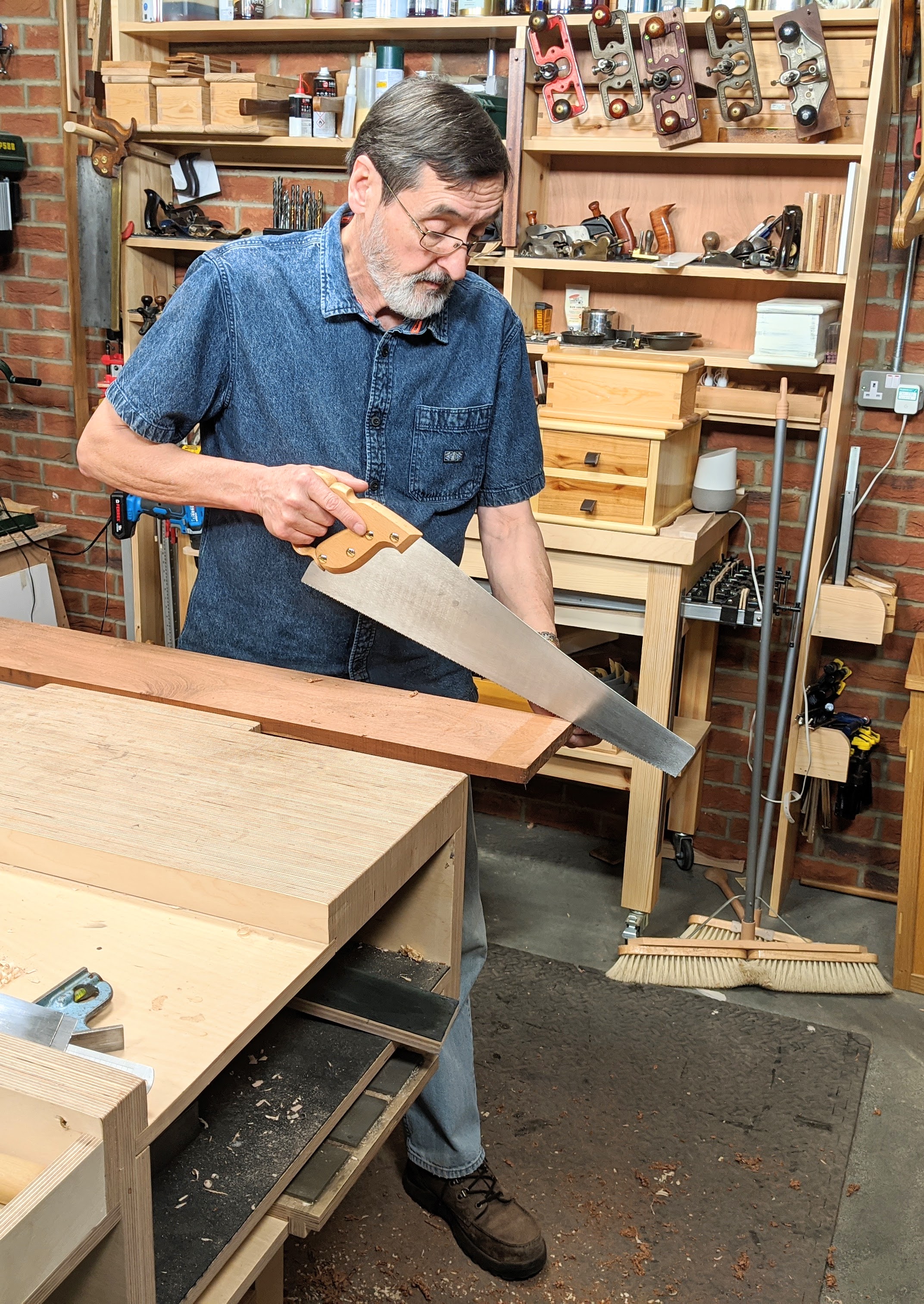 Relaxing and easing into the cuts is a different and separate issue even though the two seem connected by the task. Defining the power of the saw hold as less of a fisted grab and more of a firm grip only tells us how the hand engages the saw with a type of accuracy that translates into both accuracy of cut alignment and then too pressures according to feedback from the wood through the tools as they perform their cuts. These things are not written of. To deny the writing of them and the speaking of them is to deny or at least perhaps fail a next generation by undiscussed detail. Relaxing in the cuts is a more difficult consideration and concept to convey because the watcher cannot see how the hand, body and brain are working and what energy is being expended in terms of effort and direction. The relaxed hand moves a saw that more simply encourages the saw into and through each cut but the relaxed hand in no way means a limp hand There should still be a firmness in the same way we lift an unhandled glass to drink from or lift a small child to our shoulders. My confident cuts can be mistakenly translated by others in the minds as something fast and strong with rapidly repeated manoeuvres. In reality, it's quite simply the expressed confidence that comes with any mastery that requires repeated moves in succession; any expert always delivers his hand work accurately and with delivery. I don't ever use my tools for speed. I simply do it quickly because early on in any task at the bench I always establish a rhythm that matches my body and that then establishes synchronised power in a measured and controllable way.