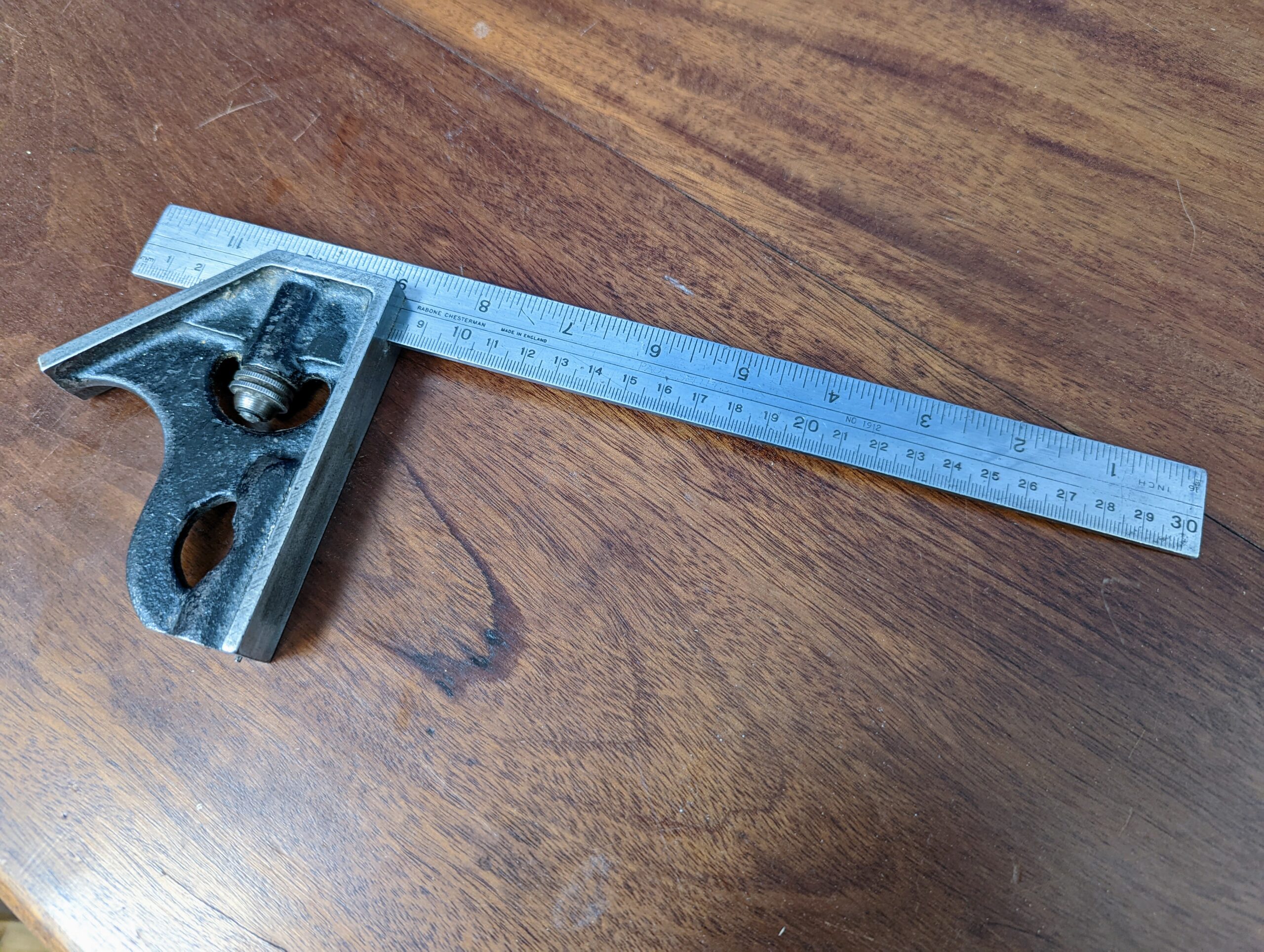 I bought my first square, a combination square, in 1965, 90 or so years after Laroy S Starrett invented the tool for engineering machinists. My combination square was made by Rabone Chesterman here in England. I still have it, use it daily, and it is still fully working and accurate despite its daily use of around 17,000 days. I doubt you know many hand tool woodworkers who have used this tool, with a knife running along the blade edges several times every hour, as much as this. You would think after this length of time in daily use the blade (rule) would be well under 1" wide, but it is measured as shown in the photo and it's the same from one end to the other. Actually, I have two measuring the same. If you do know others with that much time in their square, they will be the rarity, as I am.