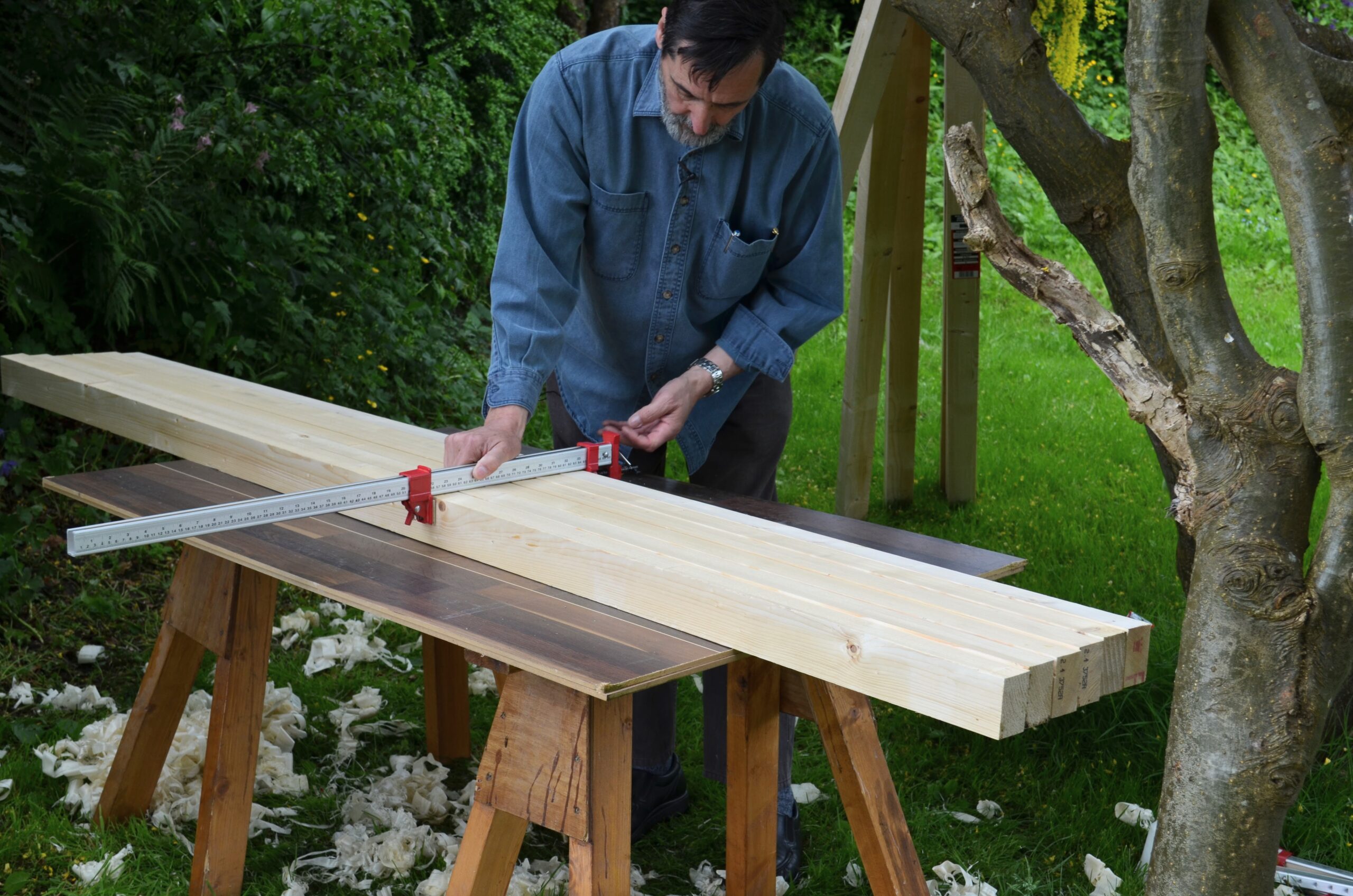 So, wood from the lumber store (US term) or from the builder's timber merchants, building supply is graded differently. It will be kiln-dried but it's not likely to be low moisture content so expect or plan for considerable shrinkage. I still work from a workbench that is now 13 years old and it shows no signs of any deterioration at all. It's a wide-topped bench which I will never build or work from again. A complete waste of space with no place to keep tools out of the way. A bench with a well is worth two or three of a wide topped bench. Best thing to do is to stack studs on end against a wall with free airspace around them for a few days. Studs will dry down remarkably quickly. You can make the top as thick as you like but you really don't need anything thicker than 60mm (2 3/8"). If you can only get US stud size 90mm (3 1/2") and don't want to rip just use that width. It will work fine. Legs and rails as per my original design should come easily enough. You do not need to plane wood dead true, just take a whisker off the face to create a good glueing surface. Studs are often rammed through the machines leaving uneven surfaces that don't mate too well, or they have been saturated stacked out in rain for days and then dry unevenly. A surface skimming creates a good surface and clamping will take out curves and such and the glue will indeed hold forever.