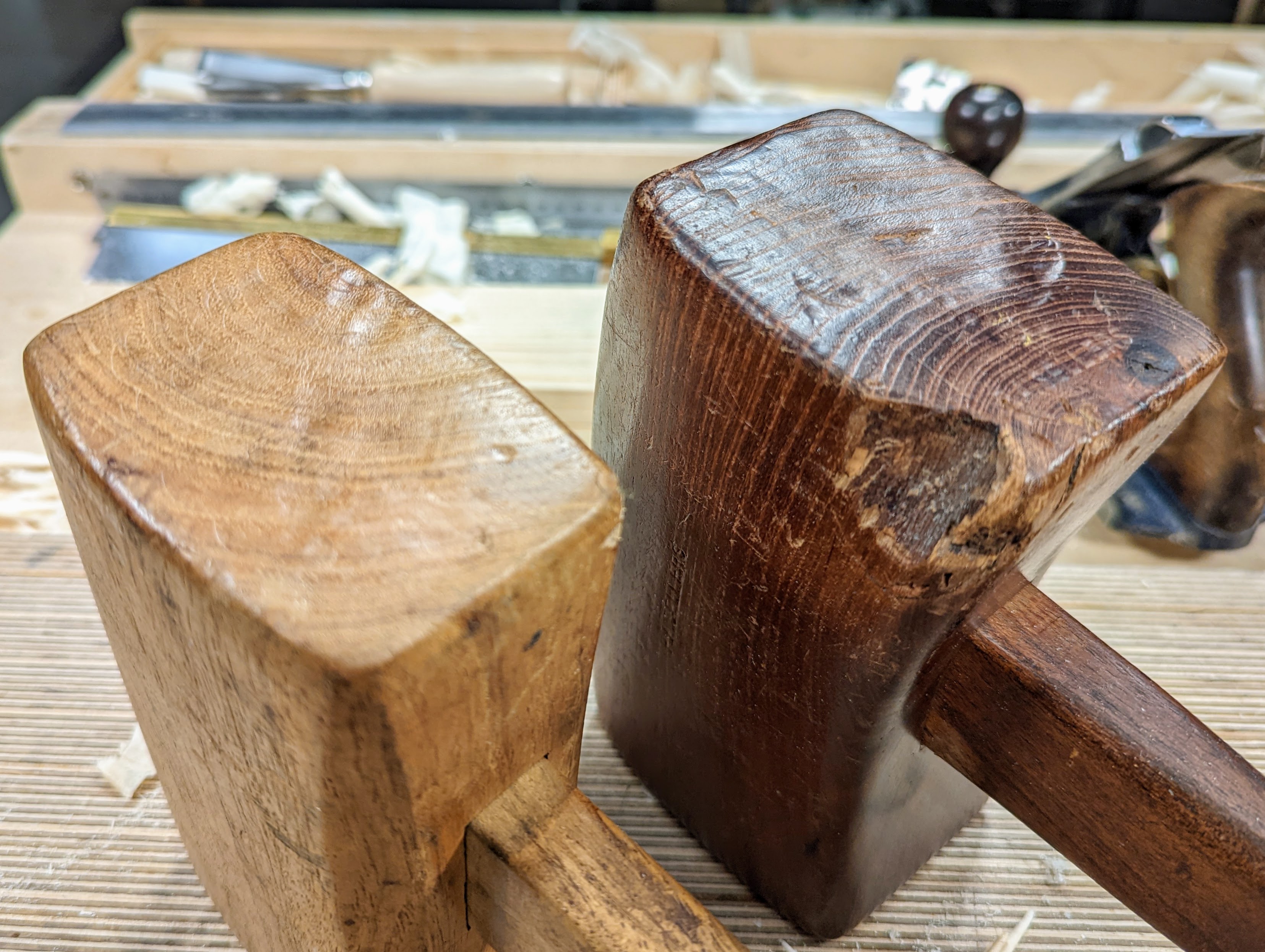 When something is revealed to you in the outcome of your trial and error, your experiment and whatever, you suddenly own it; as experiential knowledge, it becomes yours for life and you can then rely on it. It is always good to recognise the limitations of all we call work and to then acknowledge those limitations by working within those limits. Knots in many species result either in weakness or strength. When a man I worked with in my apprentice years sought out the knottiest piece of cherry from which to make his mallet head it needed but few words for me to understand his reasoning. Some knots work and some don't. In his case, it was the interlocking grain surrounding the knot and extending well into the adjacent wood that he sought. Cherry on its own is not the best wood for a mallet because of its lack of density and its lack of resistance to splitting as well as density. The wood surrounding knots is almost always denser and indeed omnidirectional too. He was prepared to work through the omnidirectional grain when chopping out the mortise to receive the handle. Wood that many might reject can be a good source for a mallet head. Look at turning wood for sale. This wood would one time have been binned but when woodturning came into hobby realms such wood became sought-after "character wood" for bowls and vases. Look for even density though. If there is a central hard spot it needs to be surrounded by support wood. Just an added point: some woods fracture internally under malleting blows and some woods consolidate. My cedar elm mallet from a Texas tree is hard and dense and evenly so throughout. It's the perfect mallet wood but not at all readily available. Using it through two decades plus five years it has become denser. Bois d'arc has given me a couple of mallets of even density weight and hardness too. Mesquite is twice as hard as oak but not a particularly good choice for a mallet as the grain collapses. In this case, I would look for something with dense, interlocking grain and within the branch range of the stem where the grain becomes denser during growth.