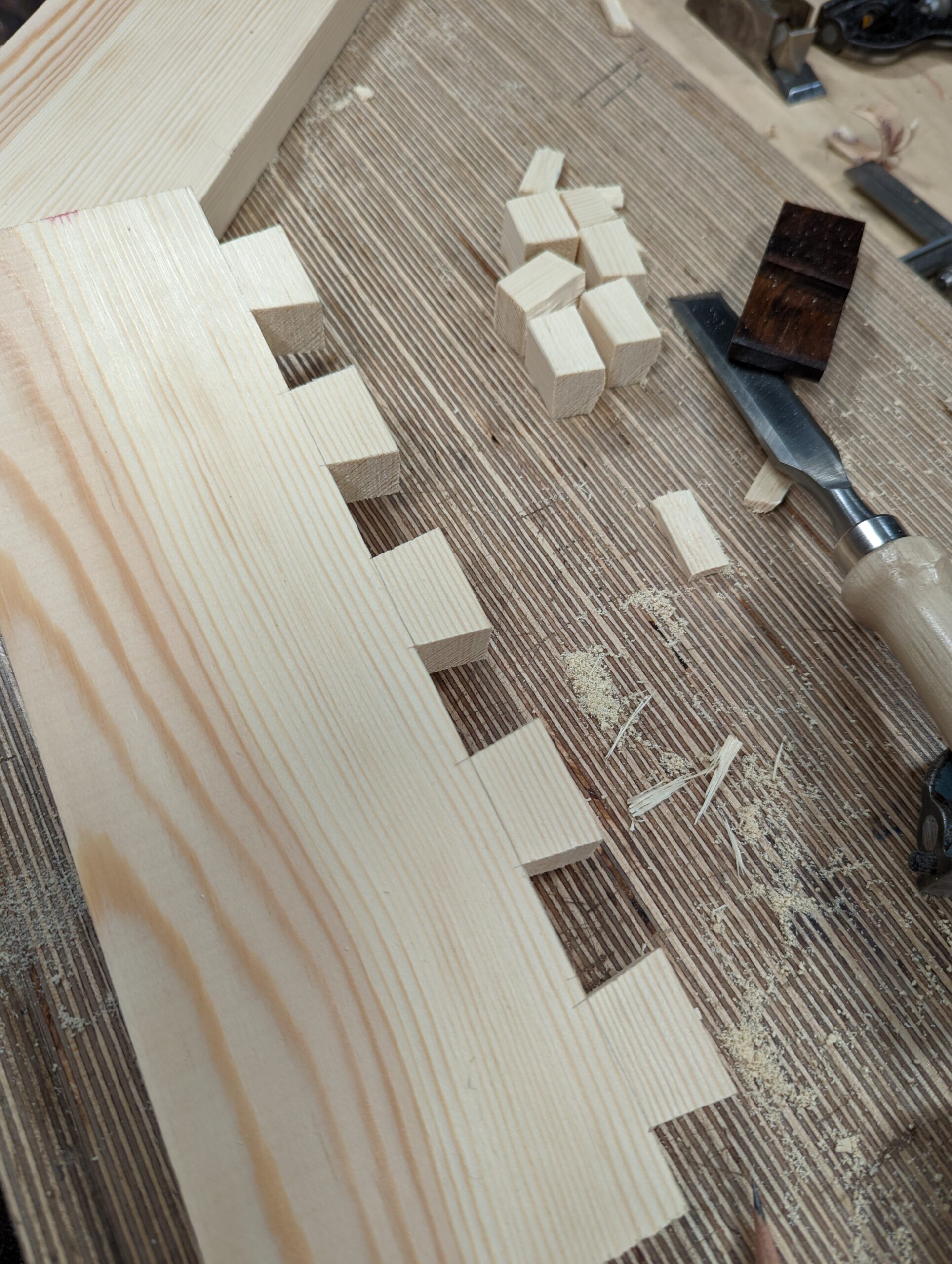 In crunching the alternative dovetailed examples, thinking about how it felt at the time, in the minute, I did feel a wall of resistance, a reluctance within me that I had to push through knowing that I had created something well intending to destroy it. I found, of course, that it went against the grain in that I am always making for longevity and permanence and never so short a life to intentionally destroy something I had just made. I have only done this handful of times in my 57 years of woodworking. The last time was with the fox-wedged mortise and tenon, you might recall, where after it was done I cut through the whole to see the effect of the spread within the mortise. The fox-wedge is not a common joint but an extremely useful one with specific applications. It at first seems destructive and time-wasting, but the visual impact is far more informative and long-lasting than an explanation alone and so that compensated to make the effort well worthwhile.
