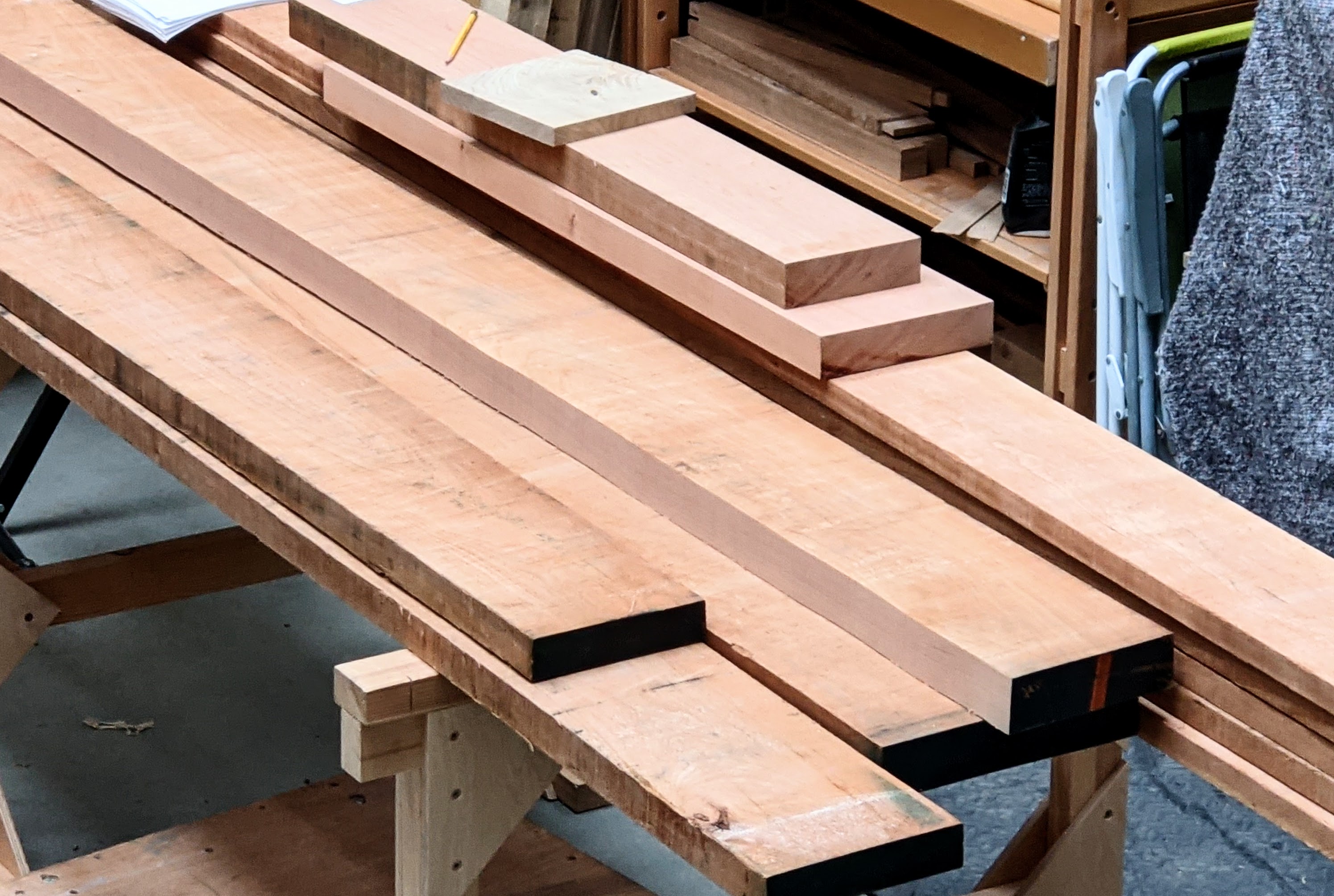 I ripped my full-width boards down somewhere near to and along the pith to part the left side from the right after first crosscutting to near length, an inch or two over, mostly. Will is videoing this work for an upcoming series for Sellers' home and though it might cramp my style just a tad it is so worth it to catch and watch what he captures with the B-roll in the videos. There is waste, of course, but this step minimises and even eliminates the risk of more distortion taking place after the cabinet is in its box form. The lighter pieces are now ready for a straightedge along the wane edge to rip and square up the length. Once planed straight I can rip parallel on the bandsaw or by hand depending on my mood and how much work I have already done.