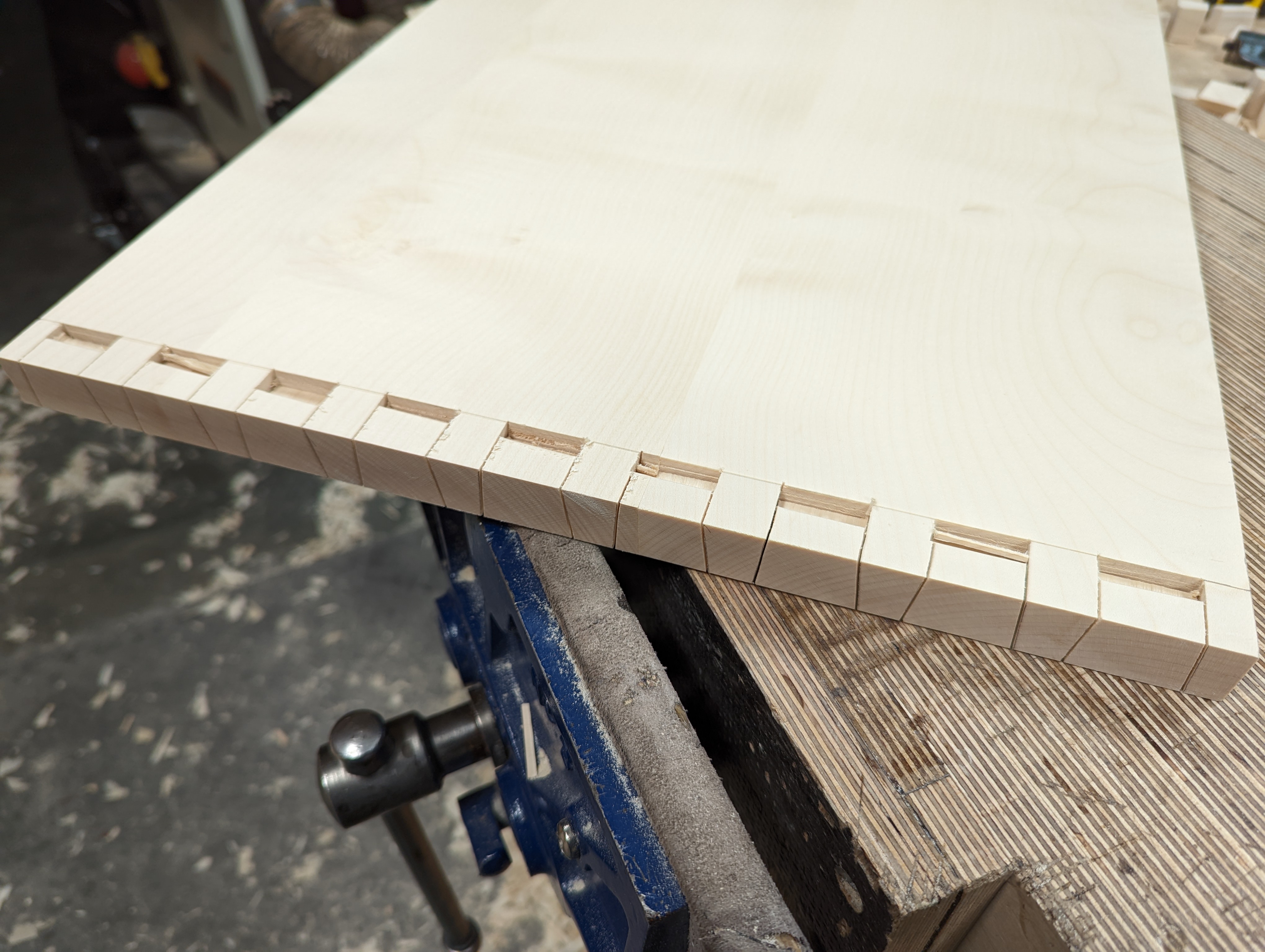 I think it to be more unusual than usual that I need to chisel-pare my dovetails and pins to seat a dovetail joint. In 95% of woods, the joint usually presses firmly together with my thumbs or a side of the fist bump followed by some fairly firm hammer taps to each tail. I have made eight corners to two cabinets across a 16" width. There are nine dovetails per corner so ten pins to correspond to. Now, these extra-wide dovetails are my first in this size specifically in sycamore. I have done enough 2s, 3s, and 4s over narrower widths without any issues. By the time I concluded my eighth corner I had learned a great deal but it wasn't just in the making nor was it at all in the caring to fit. It was in the questioning, in the thinking and in the experimenting and seeing my personal need to shift my thinking and reevaluate all that I knew to be best in guaranteeing a gap-free joint.