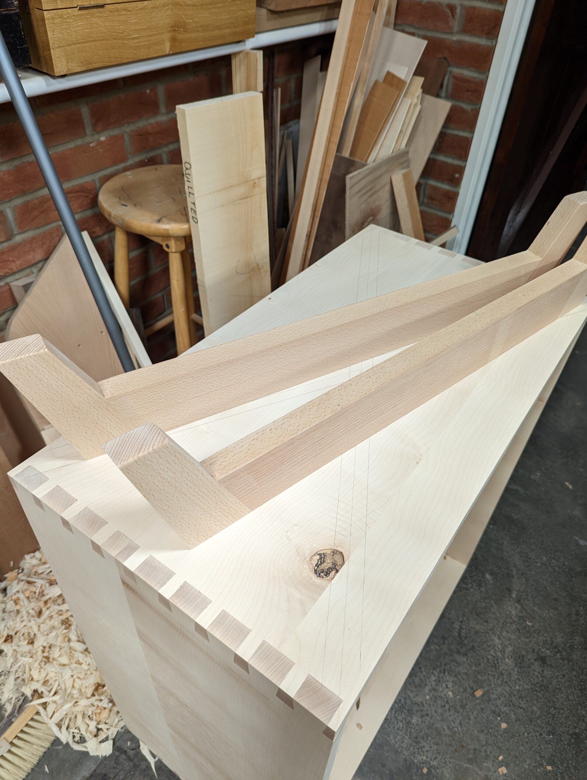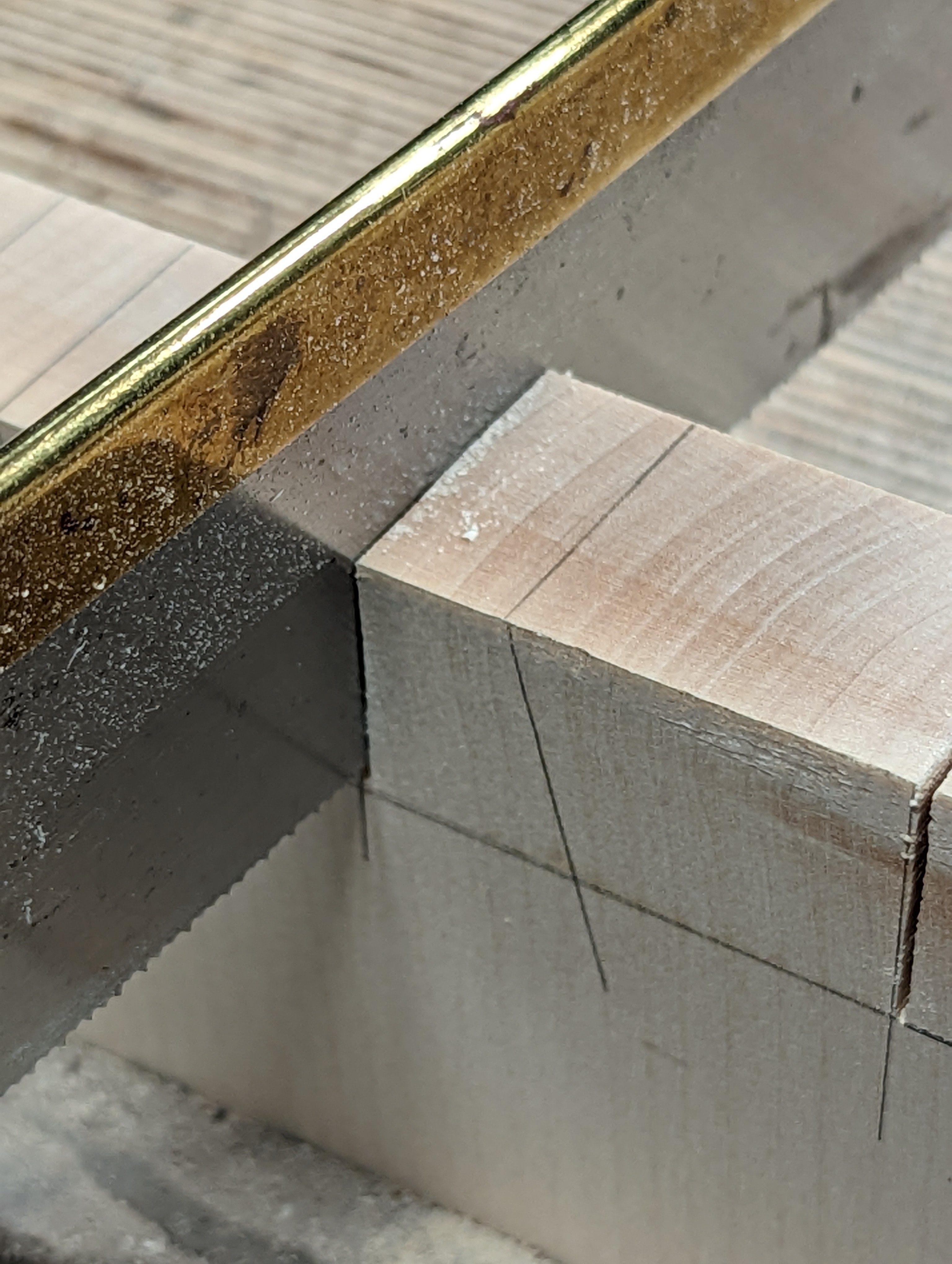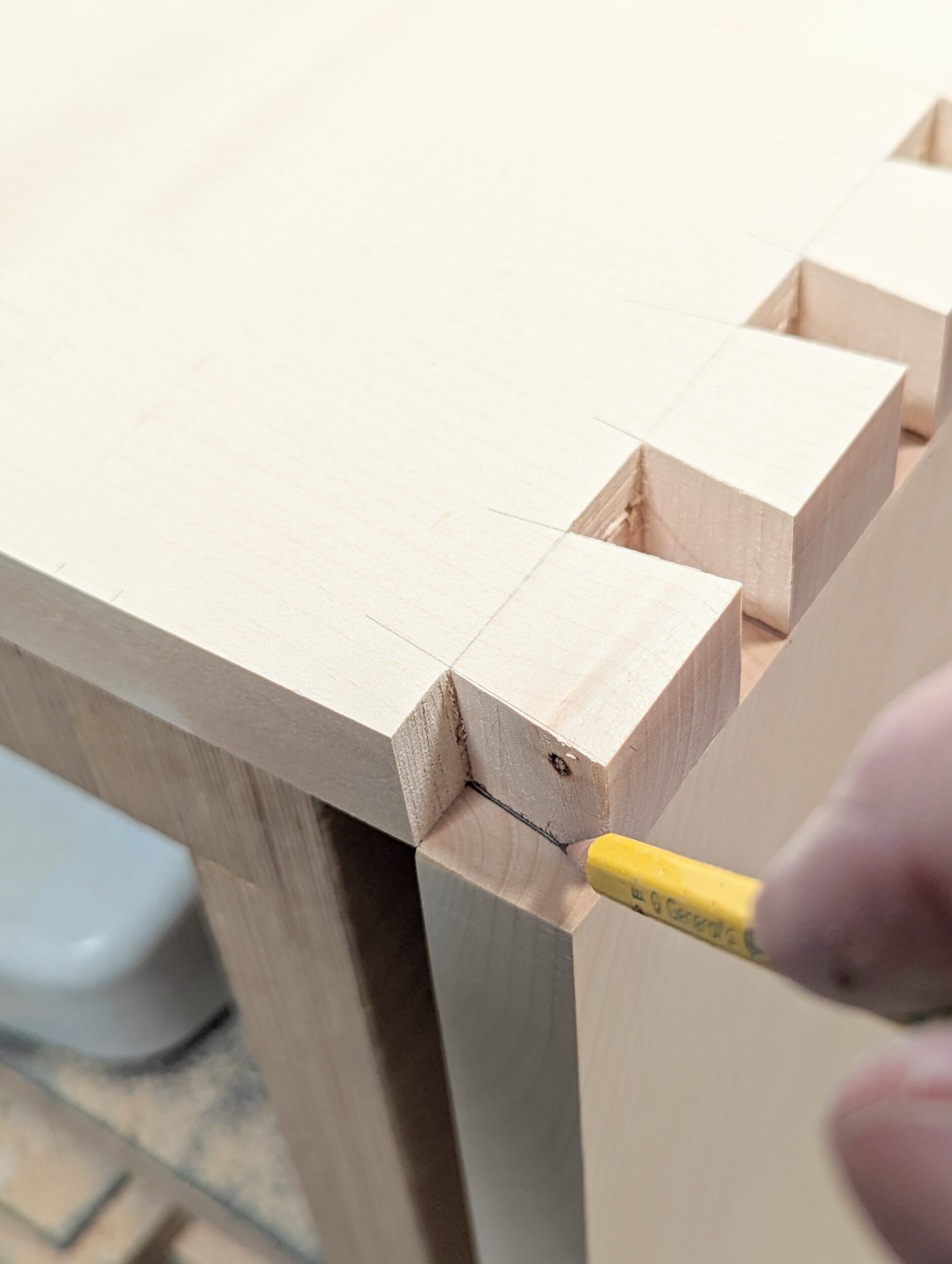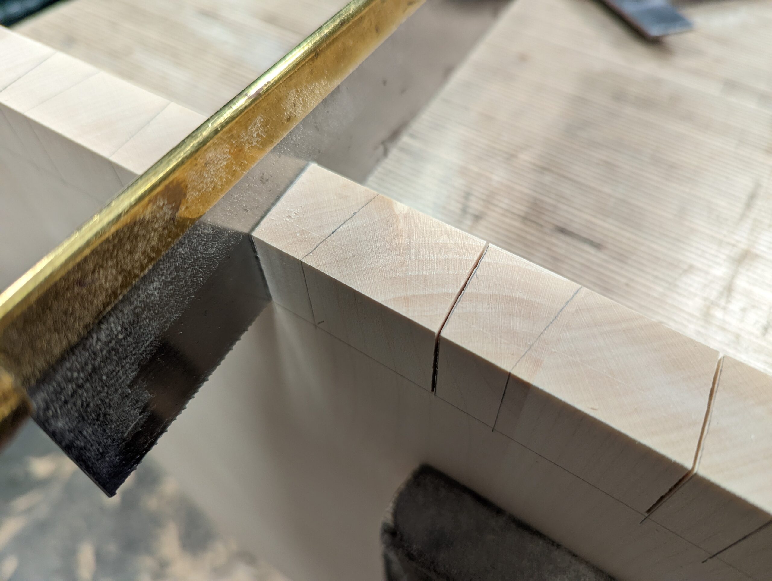 I made my second set of dovetails the same way and then the third. They all needed the same fitting and by the third corner, I understood exactly what was happing. Sycamore has something I can only describe as 'dryness'. It seems to be absolutely resin-free. It seems too to be less compressible than say oak or ash, cherry and then the softwoods and soft woods. On my fourth corner, I resorted to using a pencil instead of the knife. I felt that this would give me a little more licence to vary my positioning of the saw and to rely on a more intuitive, freehand approach.