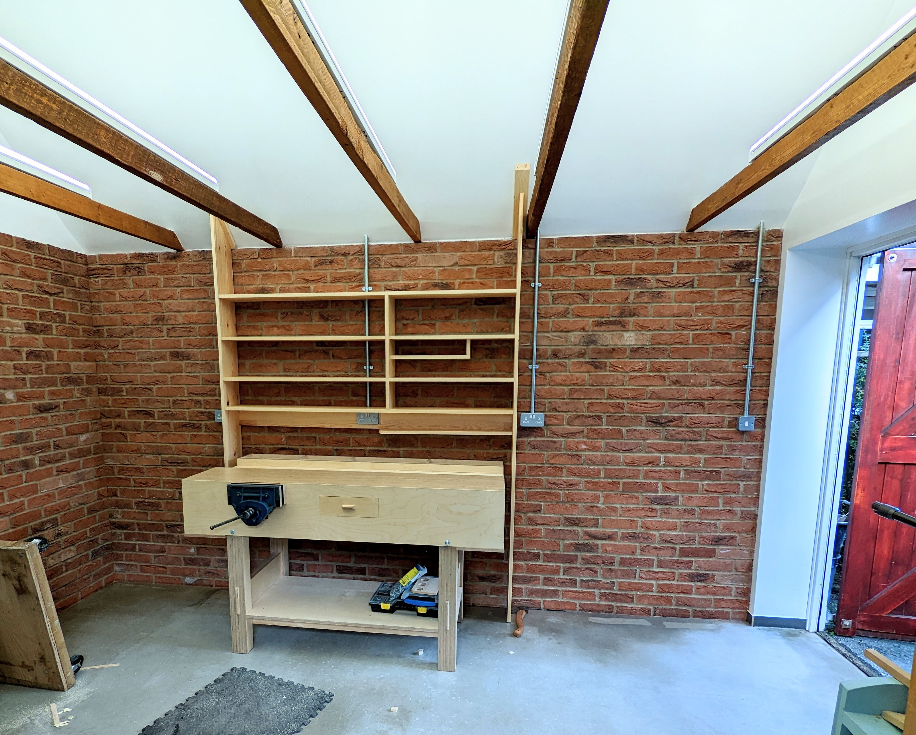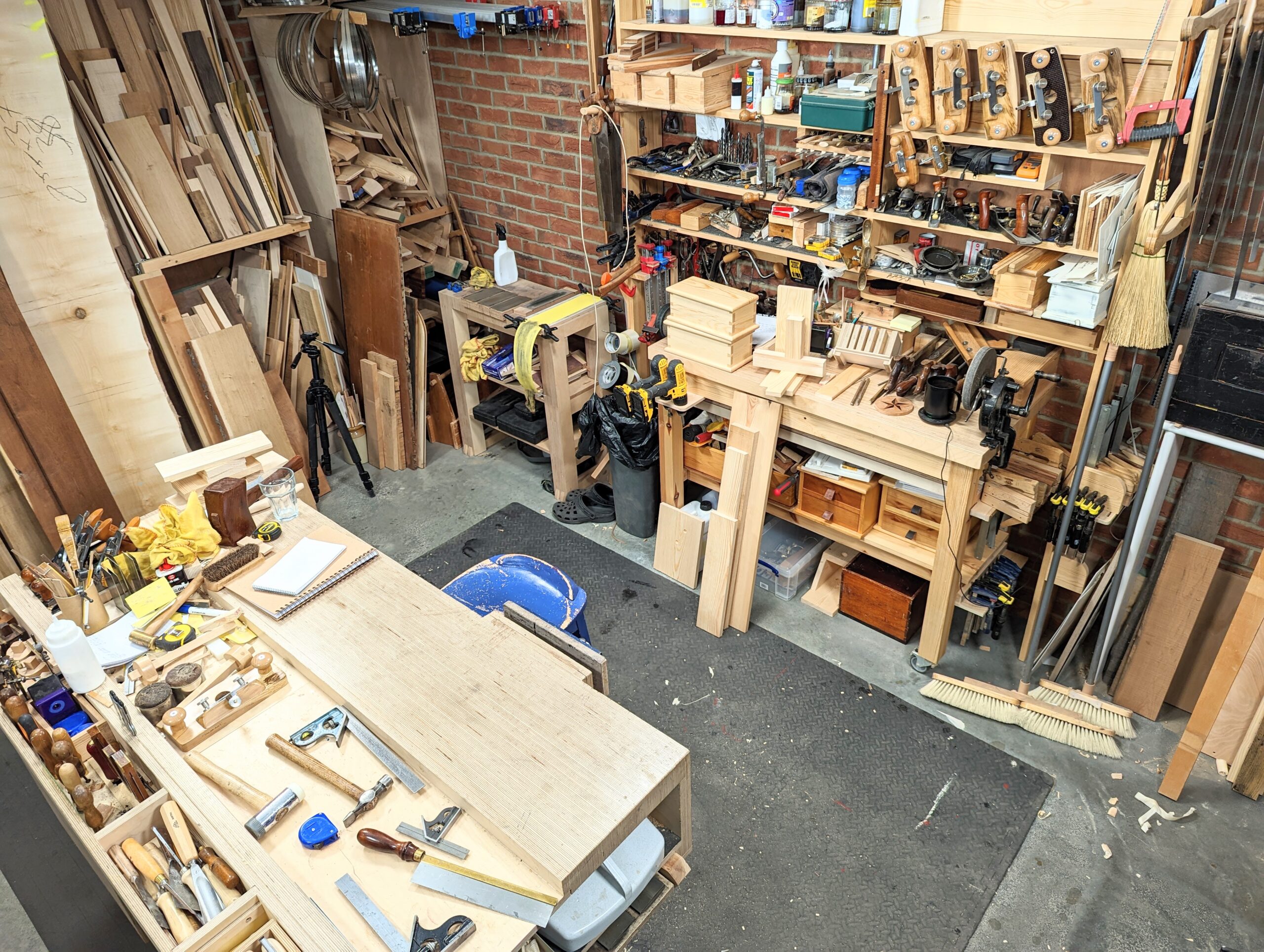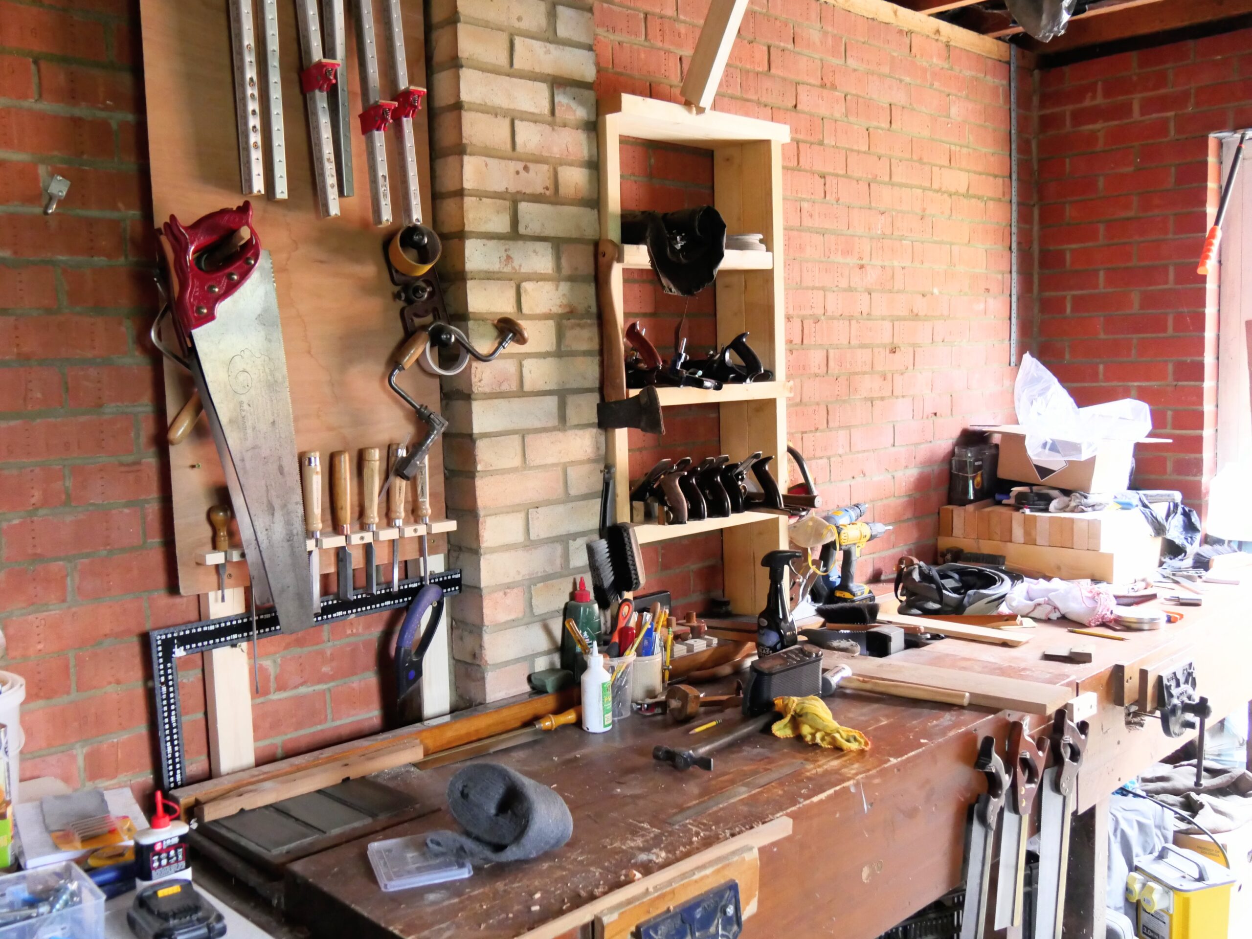 My next garage workshop was when I finally arrived to live in my native England and was based in a rented house in Abingdon. Being able to walk around your bench to work on bigger frames like headboards and tabletops obviously is an advantage but in a small space it becomes a luxury and actually we generally do not need it more than say once a year. Even so, the advantage of having the bench against a facing wall is the space behind you opens up for sawing planks and sheet goods on saw horses and then too assembling larger pieces like beds and dining tables. At the studio garage where we mostly film I have the bench on wheels that elevate via cam-action levers. As it is with many things, the makers dumbed it down in metal thickness to lower costs and ease manufacturing them. For a heavy bench like my plywood version they only just work but not well enough to install them. I just lift and lug one end at a time to move it. So too at my new home garage version. I recently reconstructed what I did three years ago as a temporary fix in my house garage. The shelves above the workbench were for genuine work but I used some recovered plywood and my upcycled softwood bench there. Within a few weeks, I discovered a really deep damp problem. Every surface released water at not quite running but near to. The garage needed gutting! Tearing out the slab and replacing it with membrane and insulation, drylining the walls, roof insulation and installing good drainage to take water away all served to give me the control I wanted. I needed to keep my tools and wood in a good environment.