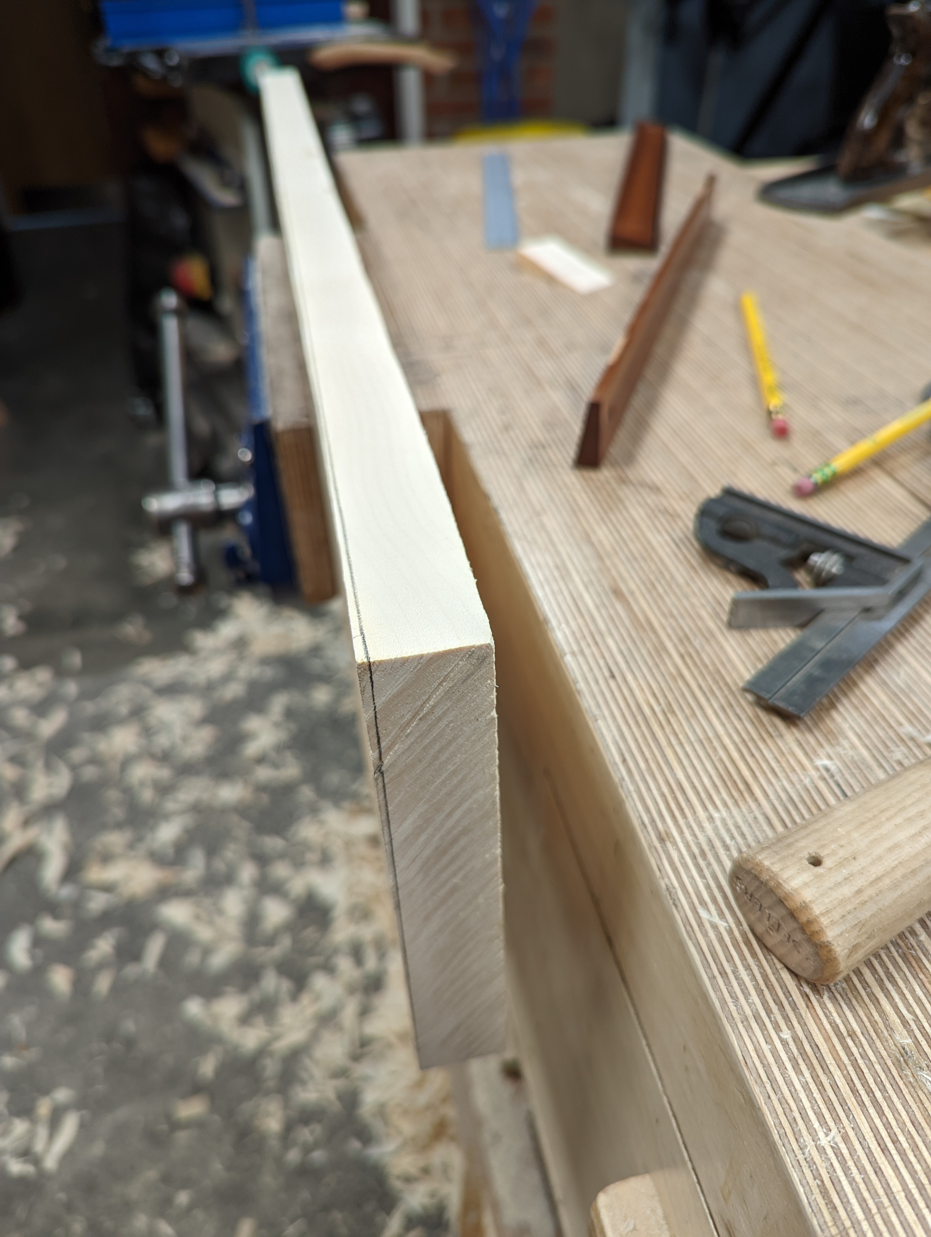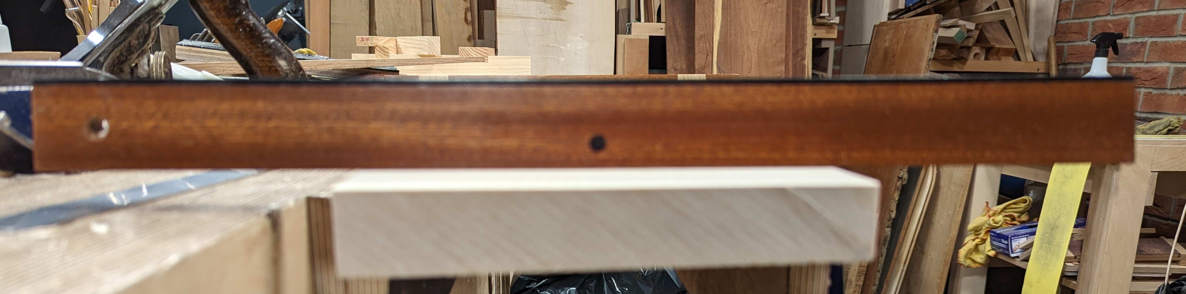 For my current cabinet, there are no pieces longer than 79cm (31 inches). A straightedge, a wedge and winding sticks give me a near-exactness for a measurement I can use to strike straight lines on the edges of my board to plane to. I say near exactness because the winding sticks still depend on how good my eye is at gauging the difference between the front winding stick and the rear one. ````even so, the idea of winding sticks is that that generally magnifies the wind by however many times the width of the board divides into the length of the sticks. A 3" wide piece divides into a 12" winding stick four times, so the exaggeration of twist equals four times. That's the end of the maths.