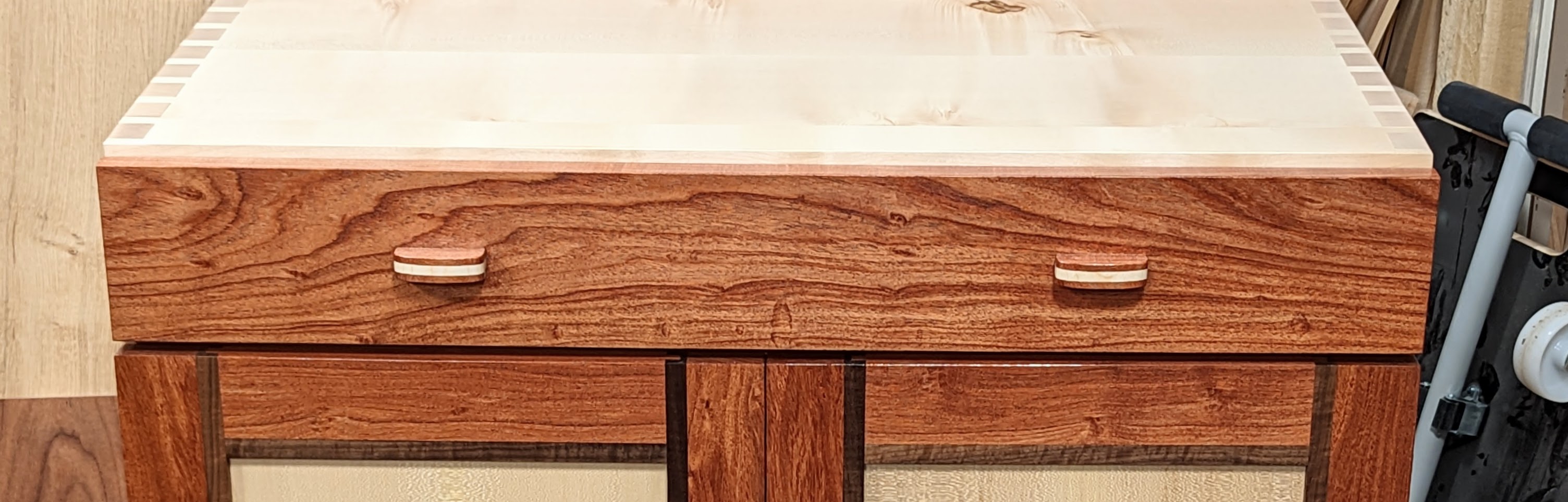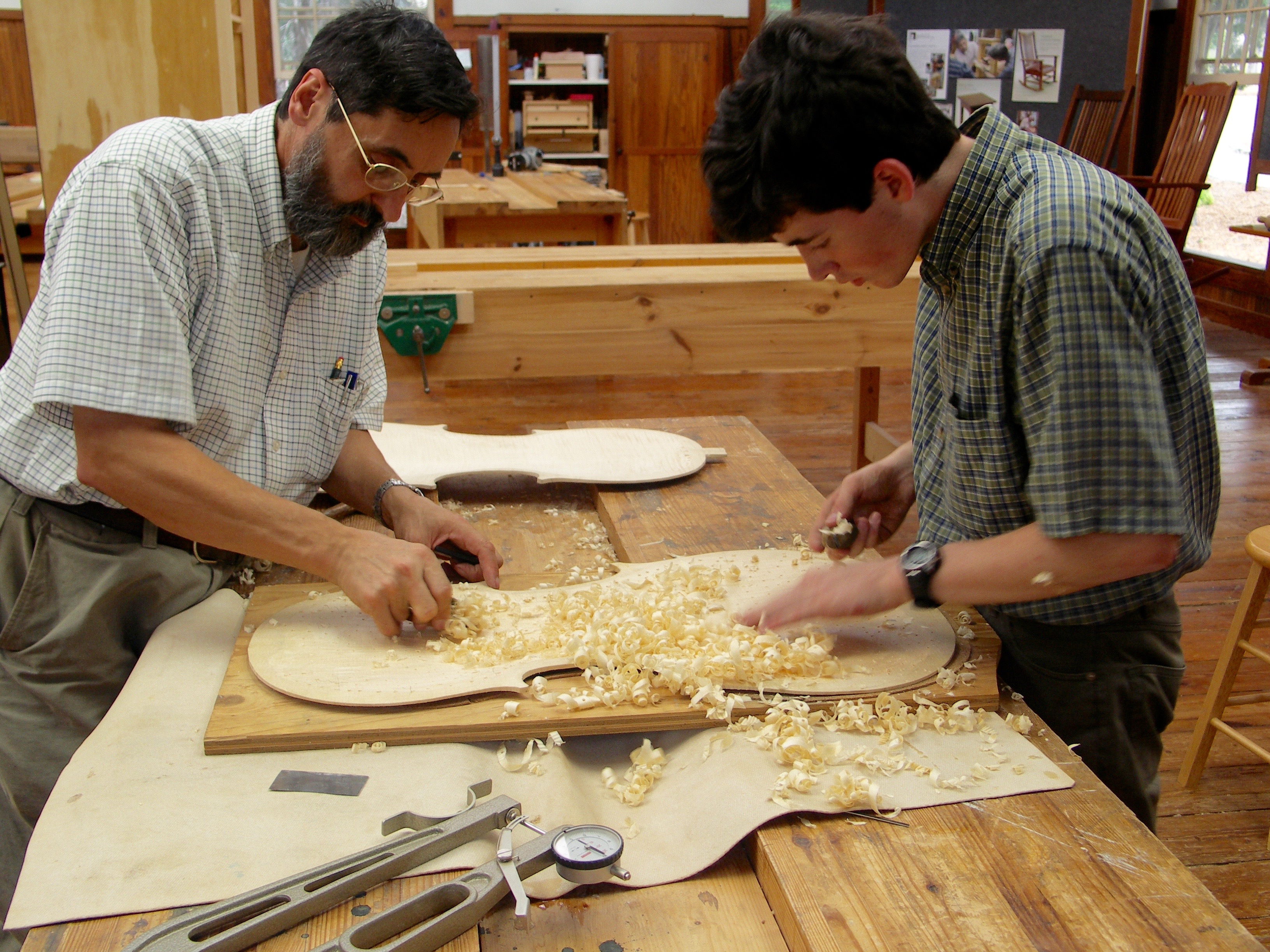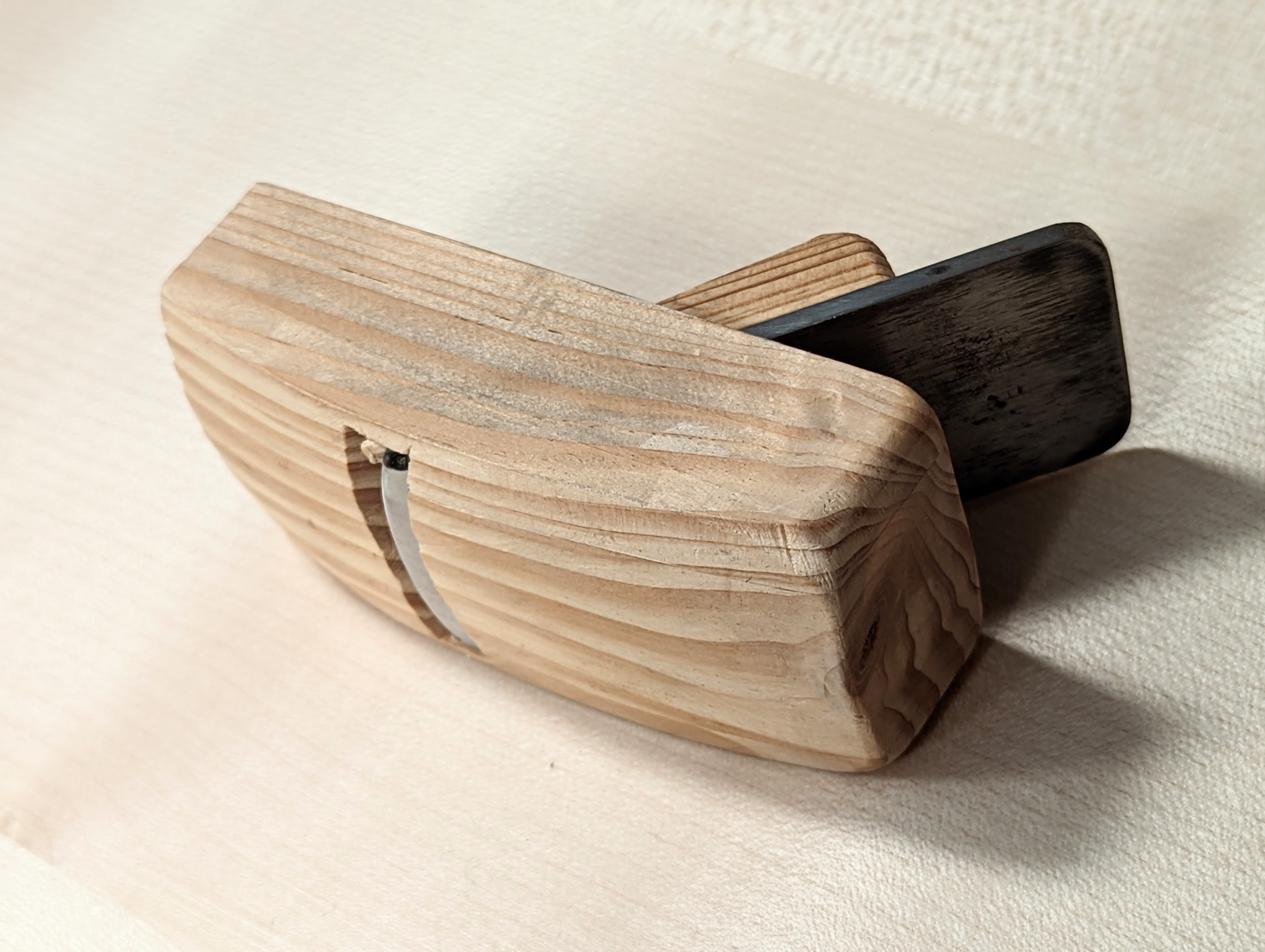 These hold valuable memories most might sweep away with the shavings, but they are deeper, much deeper than mere mementoes. The pine my hand made, round-both-ways plane developed specifically for shaping the inside hollows of Joseph's cello front and backs is still in use but my main reason for enjoying it is thinking back to when we both made his cello., Another is the end of the turned column from one of the White House pieces and the extra ebony doorknob inlaid with a tiny remnant of President Harrison's oak tree he planted back in 1889. I think I must own a thousand such things, along with tools I have pensioned off and to be used on special family pieces.