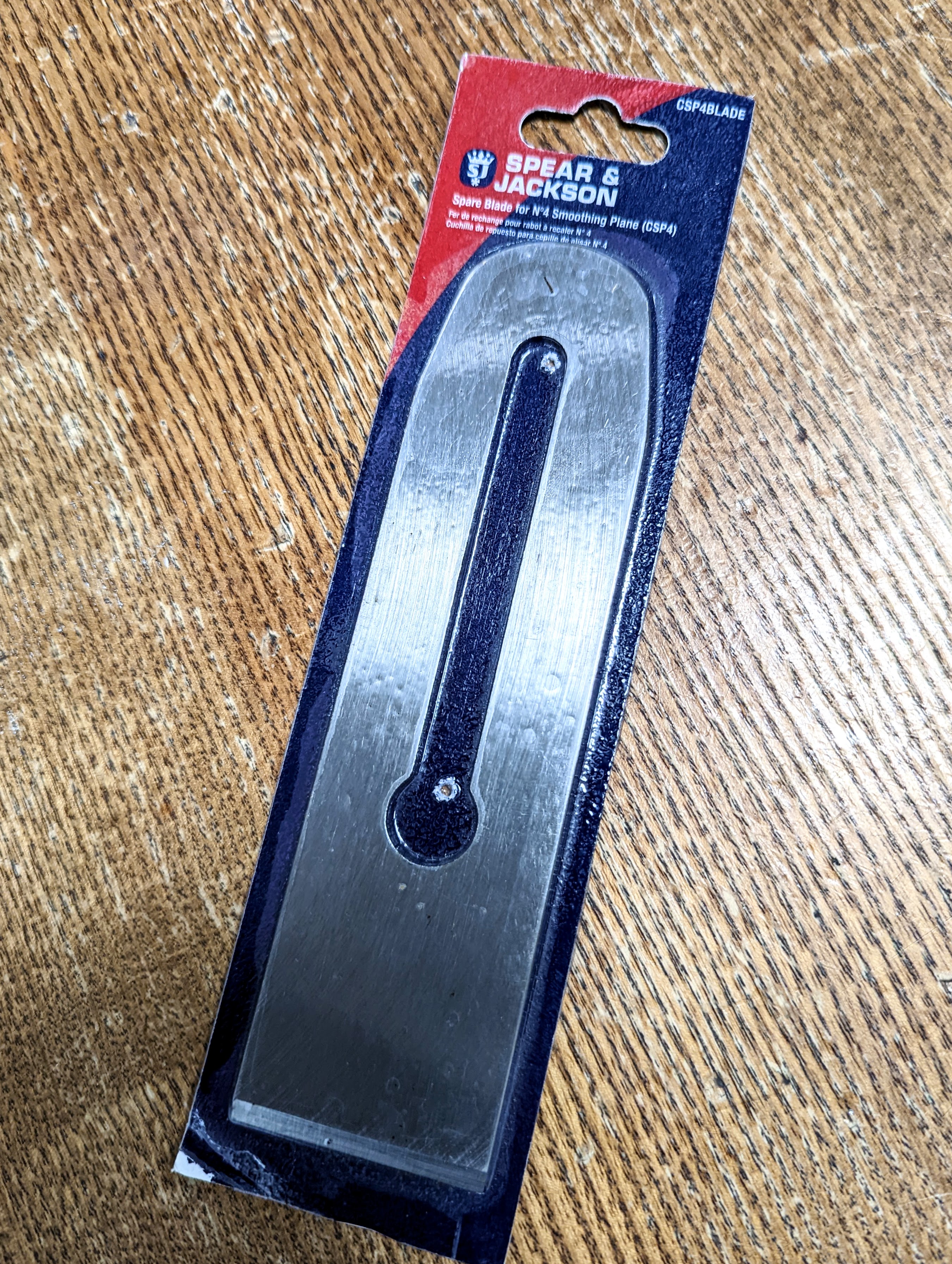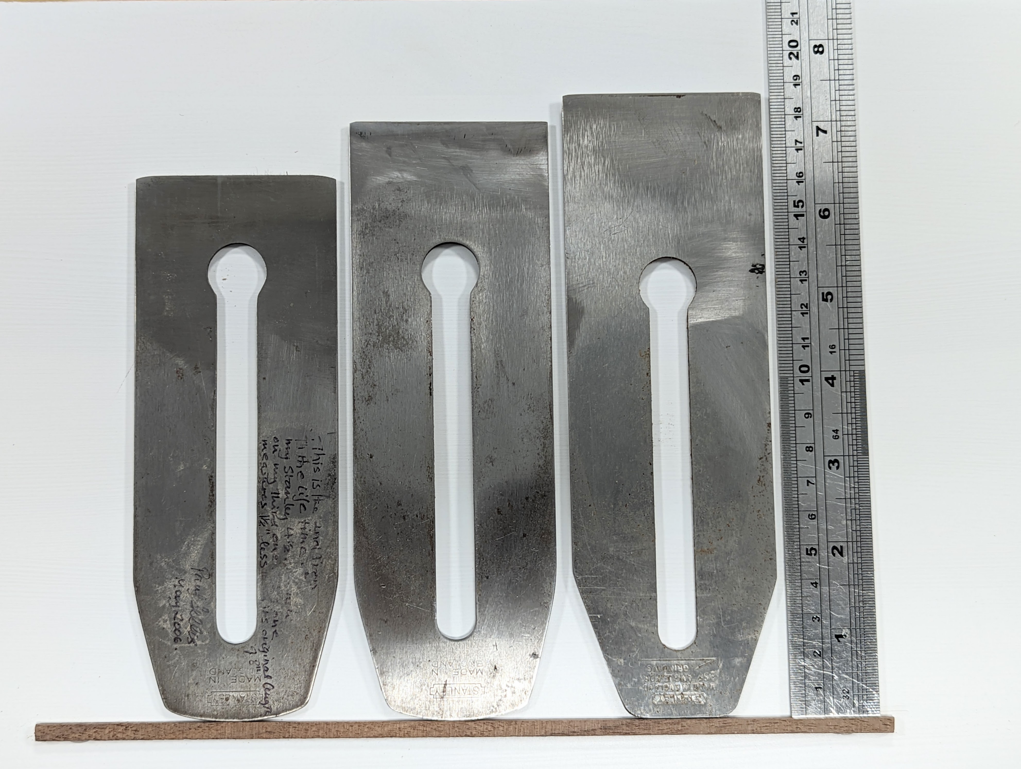 I bought a new #4 plane iron via Amazon that fits any of the #4 plane brands but is made by Spear & Jackson as its own replacement blade. The cost was £5.77 and I bought it to test it out. It was finished out fine and flat. The hardness seemed just right and was hardened for the first 1 1/4" (30mm). I am still in the test-at-the-bench phase but so far it took and holds a good working edge. At this price, it is worth buying for the steel alone as other blades can be made from it. I am thinking half a dozen plough plane cutters, spokeshave blades, knives etc. Anneal it, recut, drill and shape it and you're on your way.
