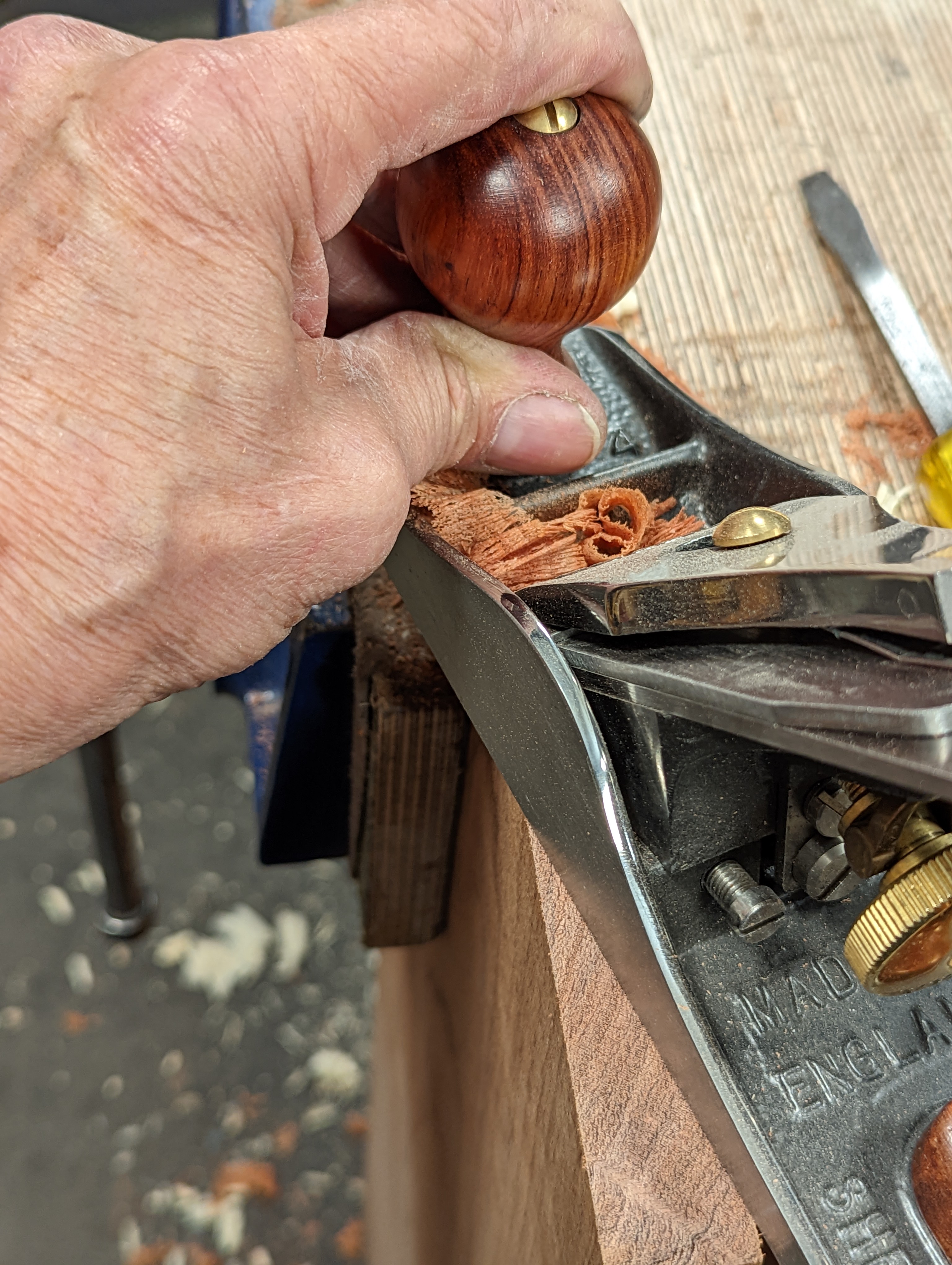 Since rehardening my plane iron I have returned it first to planing the mesquite on my cabinets and what a difference it made. None of the five planes I used held up particularly well and I include two North American premium plane makers in this too. Mesquite affects the cutting edges far worse than any wood I've ever used and know by many many times. The edges just give up, crumpling into a corrugated fracture as silica in the grain crunches the edges. I would say that it is an almost unique phenomenon to planing and chiselling mesquite but I know other less common and less used woods will be around in less temperate climates. After rehardening my now one-inch shorter plane iron the plane gave me the better service I'd hoped for with cleaner end grain surfaces many times over so for five minutes work it was more than worth the effort. After planing the end grain of mesquite many times along the tops of my doors, planing off an eighth of an inch of wood on one of the doors, I went on to plane knotted areas of sycamore with a glass-smooth success.