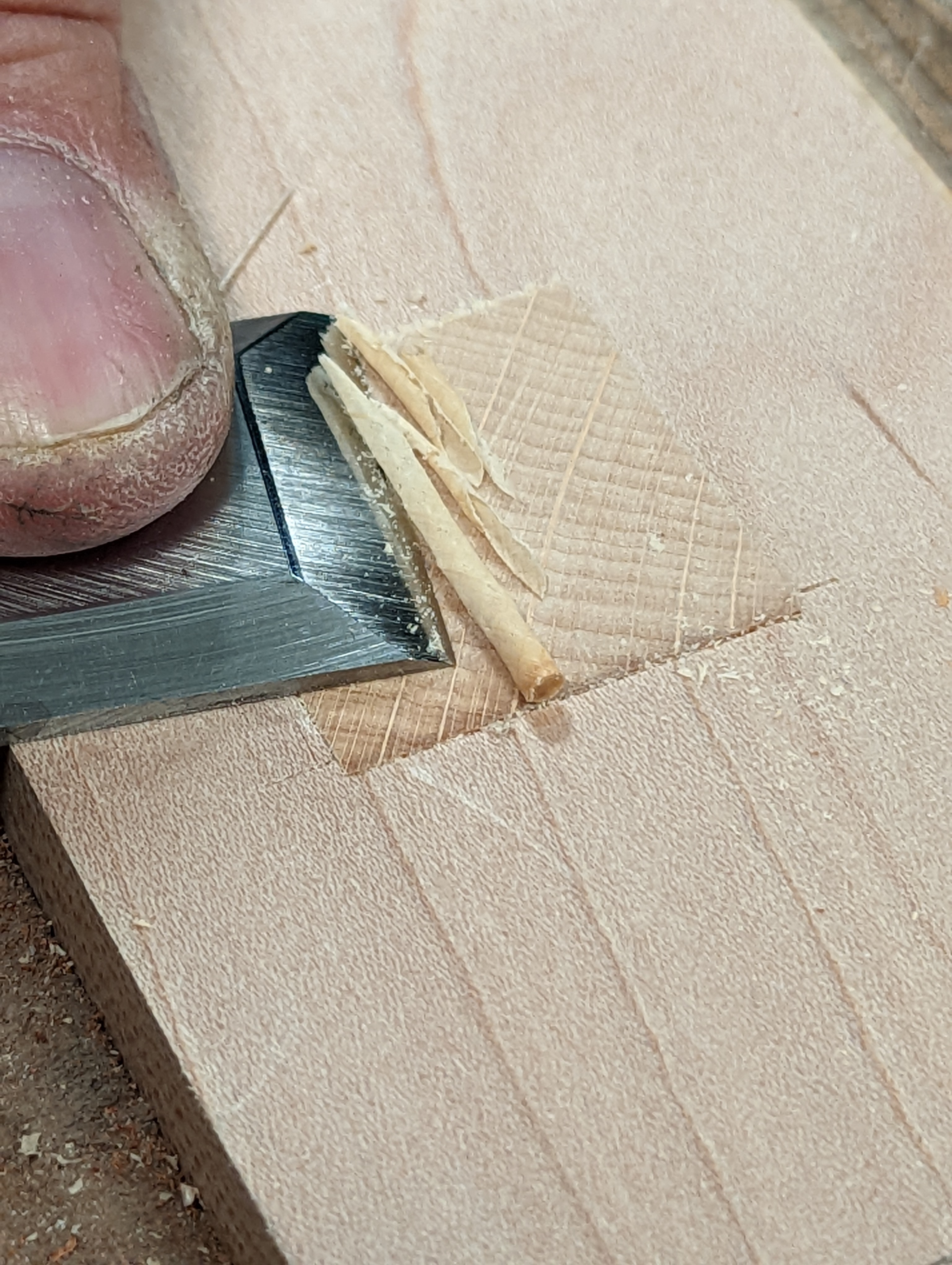 Here is a consideration you should think about. You could expect a bevel-up plane to stay sharper longer than a bevel-down version. Somehow pushing the cutting edge more directly into the wood should even out the pressure on either side of the very edge. You should also expect a better cut because of the different angle of presentation. But where the steel cuts the wood is so minimally different, in theory at least it should make almost no difference. On bevel-up planes, with a strong bevel of 30º added to a 12º incline, you have 42º at its installed bed angle. Now those usually involved in selling the planes always, always (emphasis added) say that the bevel of the cutting iron is 25º and whereas that is what they say, generally, it is a half-truth. By suggesting that the plane has a lower angle of presentation and then having a primary bevel of 25º, you might get the impression that the plane iron bevel is indeed 25º and therefore is giving a better cut when an additional 5º incline has indeed been added with a second bevel at the leading edge of bevel to strengthen the cutting edge and so in truth, we end up back at the 42º. Using a 25º bevel on any plane is not too practical: that edge is far more highly fractious and is barely viable for the high pressures and impact planing that planing always incurrs in the day-to-day. Watch for these sleight-of-hand nudges in the blurbs and sales pitch. Most sharp cutting edges are not merely 'worn' away as one hard thing wears away another, water over stone, that sort of thing, worn down, but more fractured away to result in more a broken edge across the width according to the knots and hardness hit head-on. You can see the difference when an edge is fractured away because the light reflects like glittering rather than a smooth line. So we see that a shallow bevel of 25º readily fractures in any plane or chisel, spokeshave, etc. But that does not mean we never use shallower bevels. Not at all! Where shallow bevels come into their own is when we use chisels at ultra-low angles in cuts and under relatively low and steadily applied pressure we refer to as paring cuts. This is where we lay the chisel as low as we can to the wood surface we need to pare into.