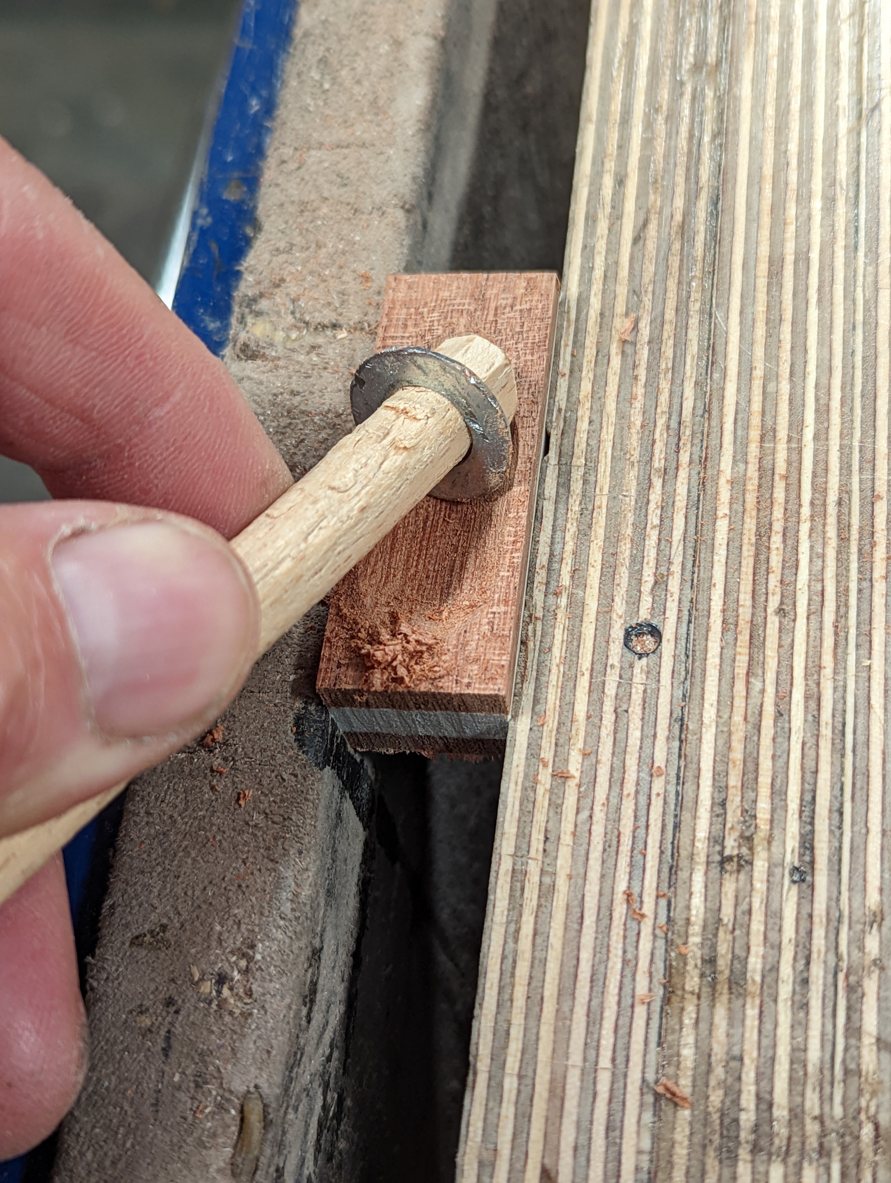 But I did something even more. I drove a square stick of wood through the washer hole which gave me a handle and I stopped just before the end with the bevel on the far side of the new handle. The step created gave me stop to pull against and I had a very decent tool to work with.