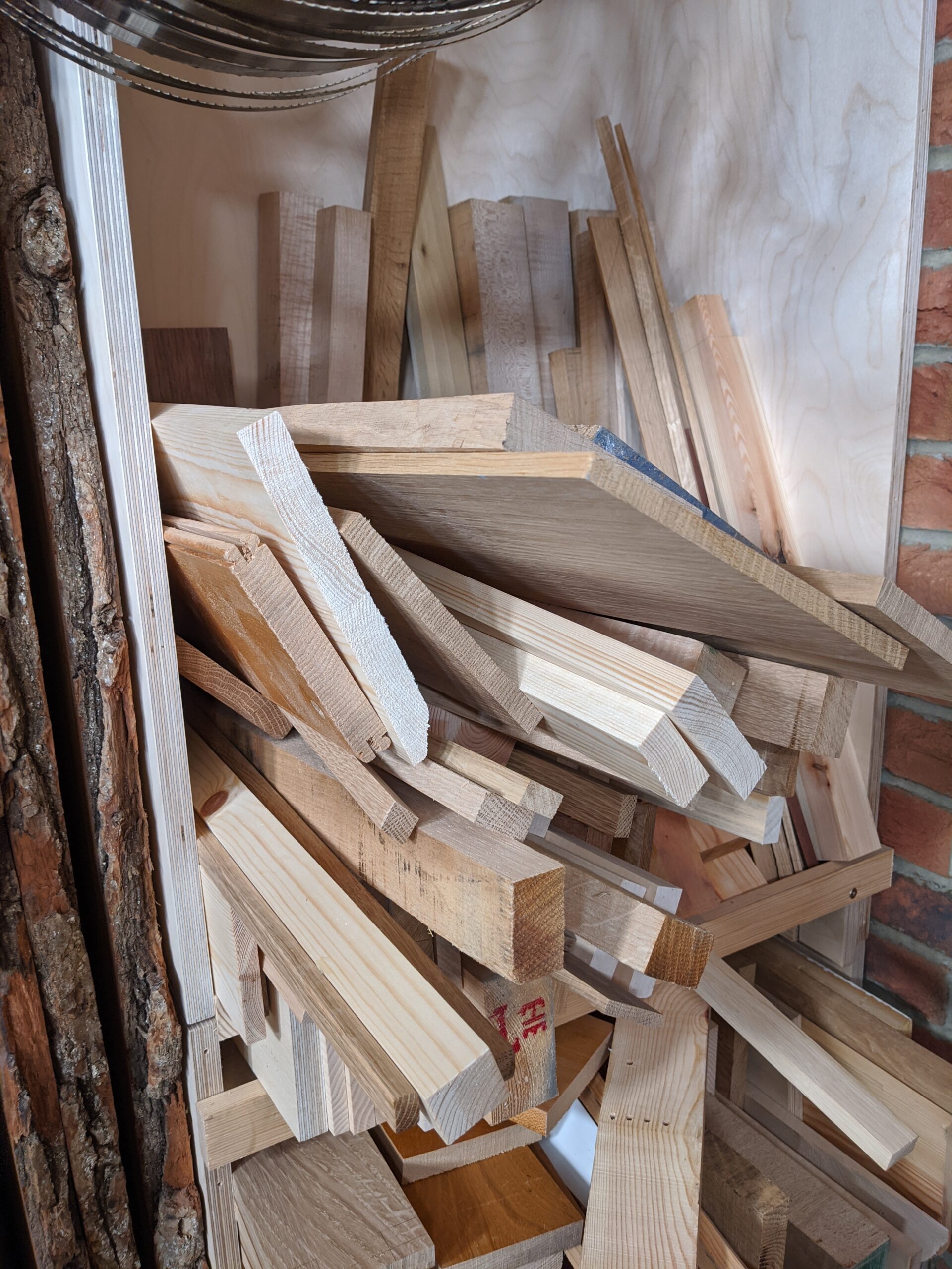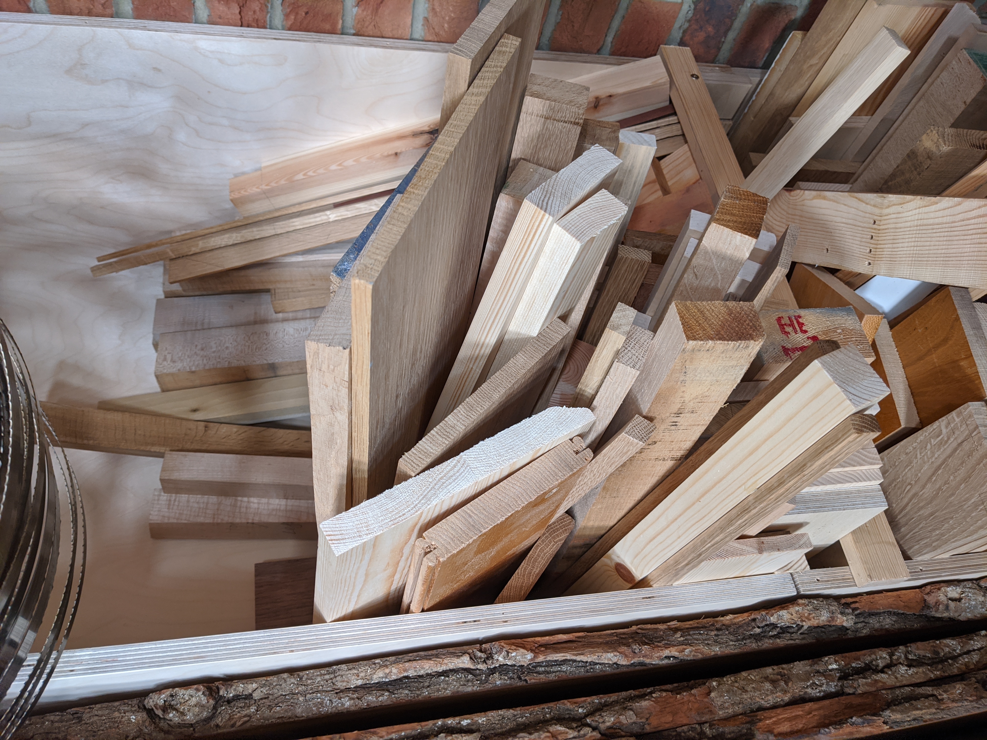 For the slats, I searched out all of my strips and pulled them from every corner of the shop. All in all there are108 at 3/4" by 1/4" and I hand-planed all four faces and each edge to edge-join and glue each to the next -- 416 surfaces in all but then all the front meeting corners are bevelled at 30º to form a narrow Vee to look like tambour. In the mix of woods there are woods retrieved from the Texas deserts I once lived in and near to, parts of my dismantled roof here in the UK from last year's remodelling, a piece of spruce from a stud and then a piece of curly maple offcut from a violin now finished and sold. The walnut came from the wall-hung drinks cabinet I made last year and then the meranti was from the builder's skip in 2019 when I made the spice rack during COVID lockdowns when I isolated at work for six months so I could keep filming and safe.