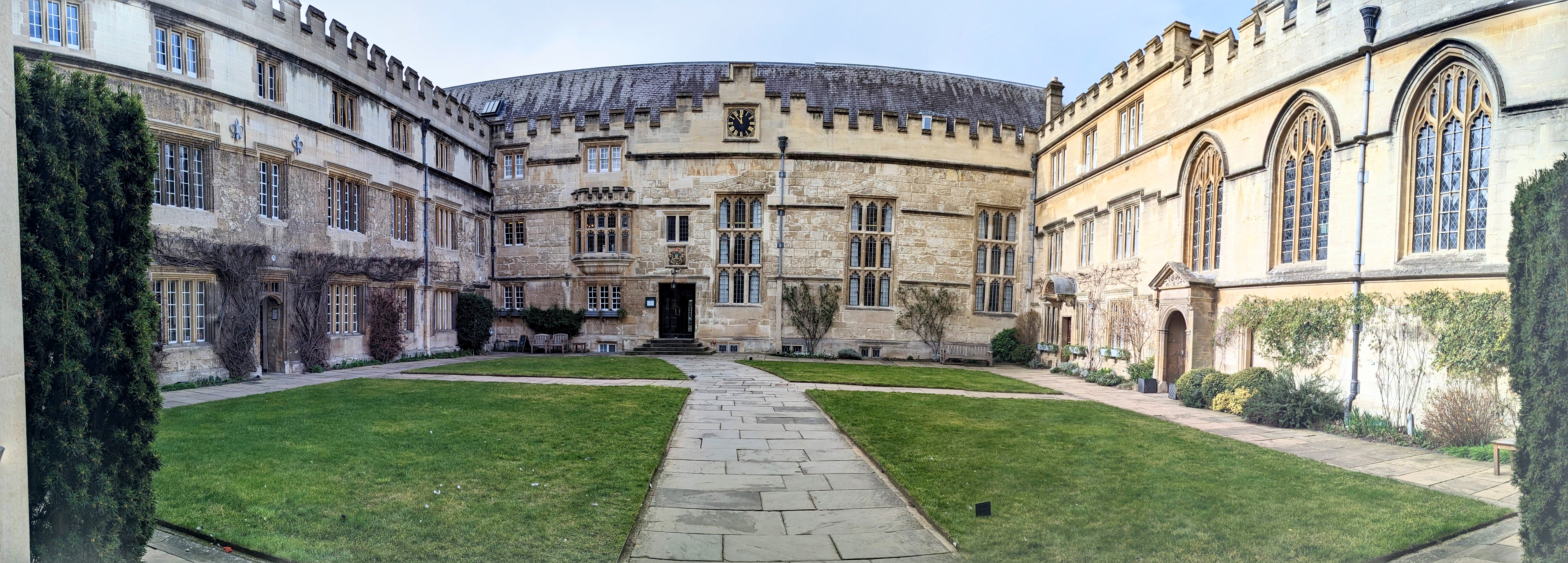 The outer walls belie the interior blocks comprising Oxford colleges. The University has 44 colleges which include five permanent private halls, each founded by various Christian denominations and all of which retains their religious character. These colleges are small, multidisciplinary communities operating independently but under the headship of Oxford University. Each has its own gathering of students, academic staff and administration.