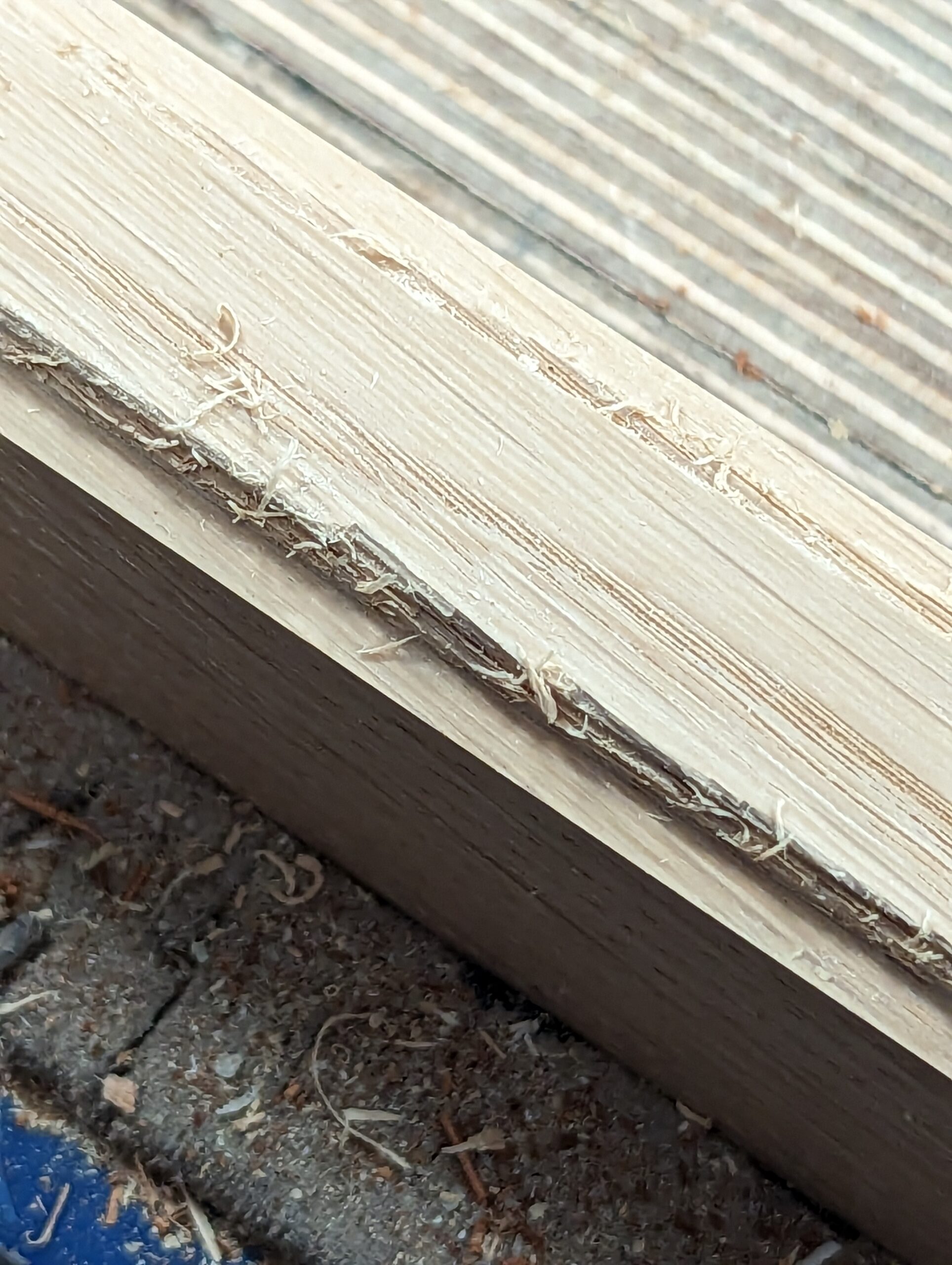 We tend to forget how a cutting iron on rebate and plough planes deteriorate after each sharpening. It's the same with chisels and indeed saw teeth. After a period of use, the very corners of the cutting iron fracture much more quickly and more than along the corner edges. These corners to the cutting edge are critical because when and as they wear (which is actually fracture and break-off) the internal corners of the wood remain uncut.