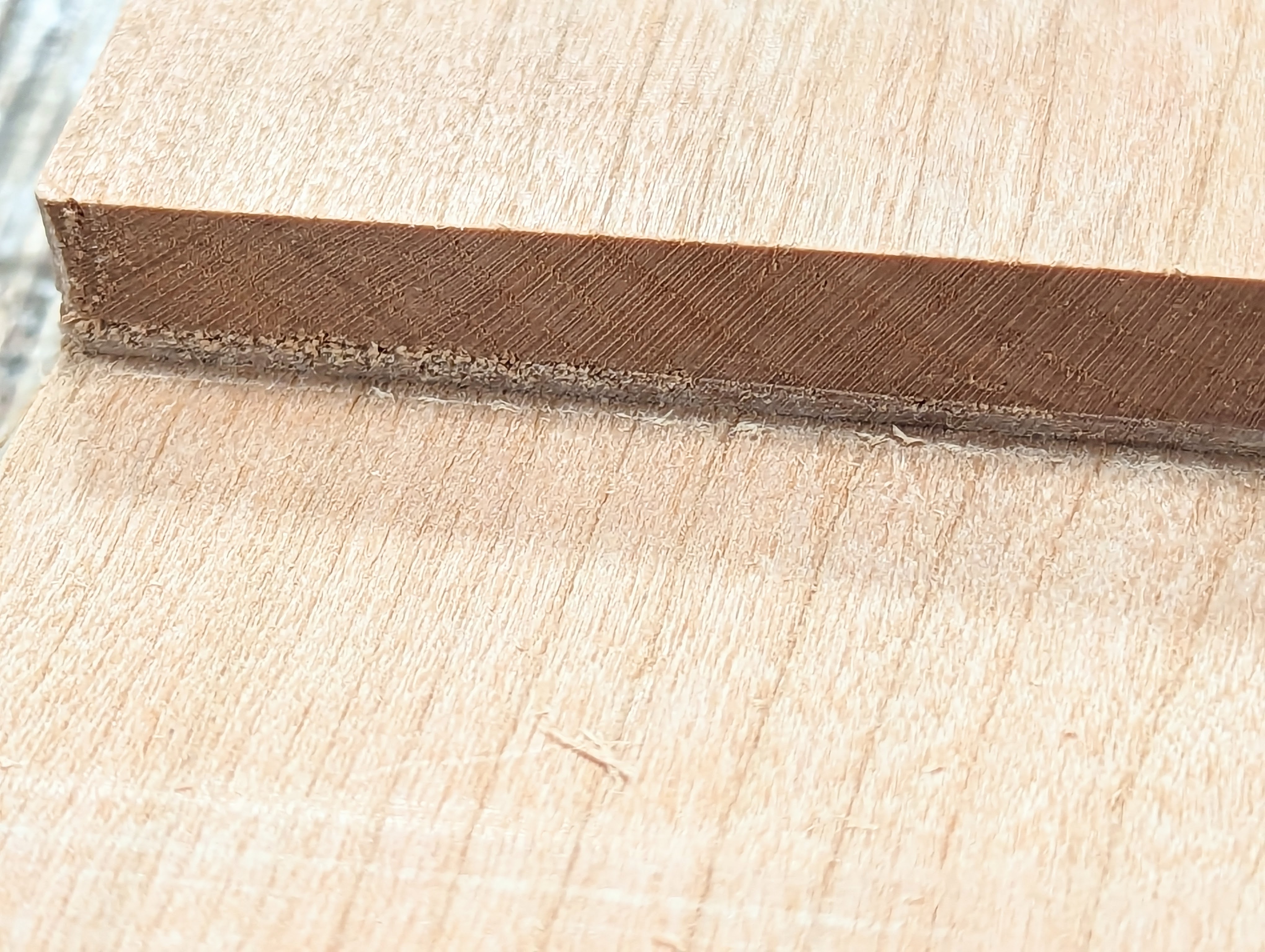 Finally, remember that deep cuts are possible with plough planes because of course we are usually taking only a narrow cut somewhere between 3/16" and 1/2". Because of the narrowness and our strength, we can indeed plough deeply. The problem here is the top face of the cutting iron is effectively ploughing 'under' the surface wood. This then leaves the surface fibres 'uncut' and lifted from the face of the wood. It causes corner fracture to both plough planing and rebating. Best to start out with shallow cuts for the first several strokes and then deepen for faster cutting.