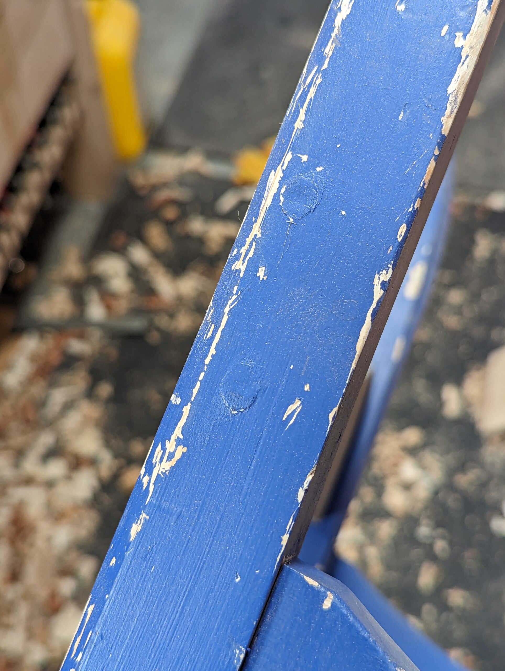 I painted the stool blue with a white undercoat for appearance. I used two screws to each rail and predrilled every hole with stepped holes so that nothing was forced, over-drilled or oversized. I can drill slightly undersized by a fraction so that the screw employs an additional friction hold as well as the threads. I hasten to add here that I m not saying the end-grain screwing is as strong as the side-grain screwing, I am not, but I am saying we should not shun this as a viable option in some if not much of our work. It will depend mostly on what we plan to use the project for. And remember that we can compensate further by using longer screws where the wood allows for it.