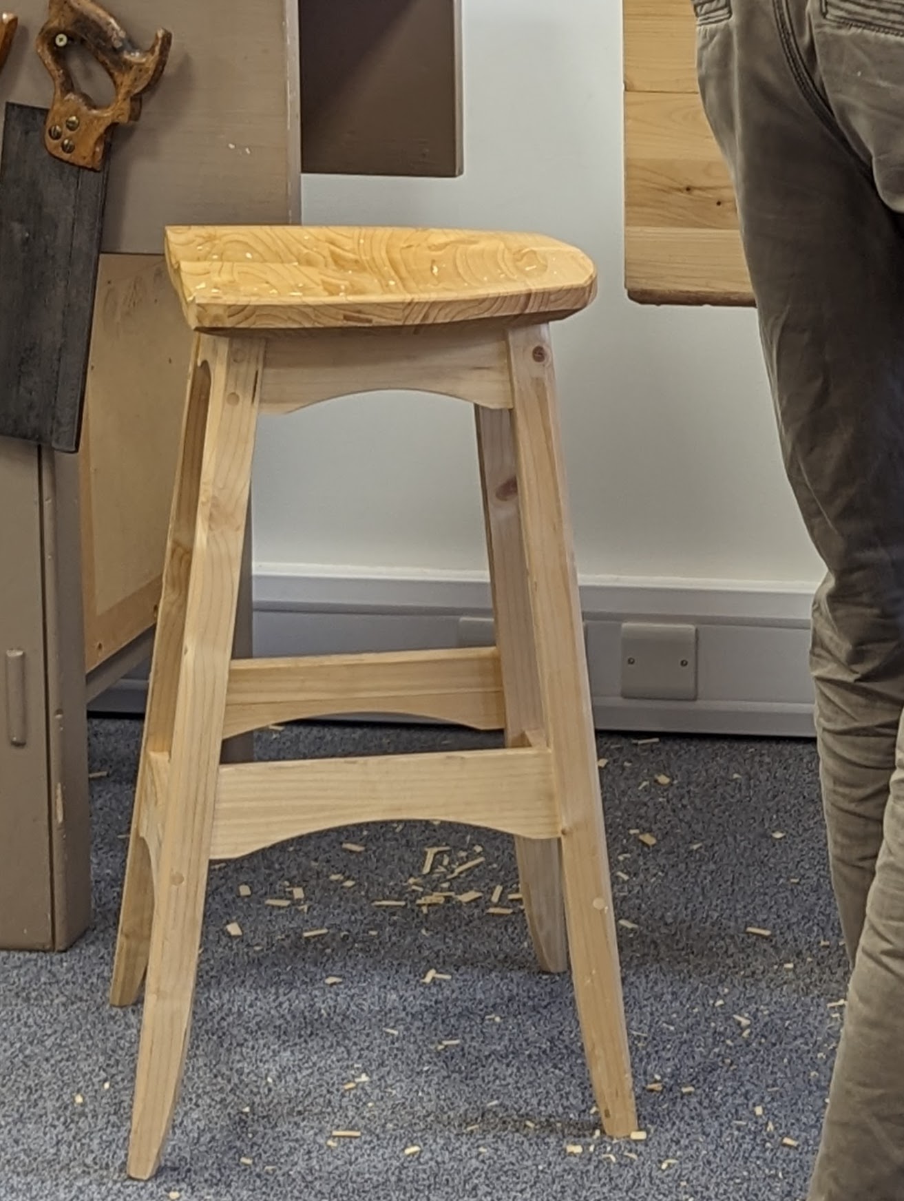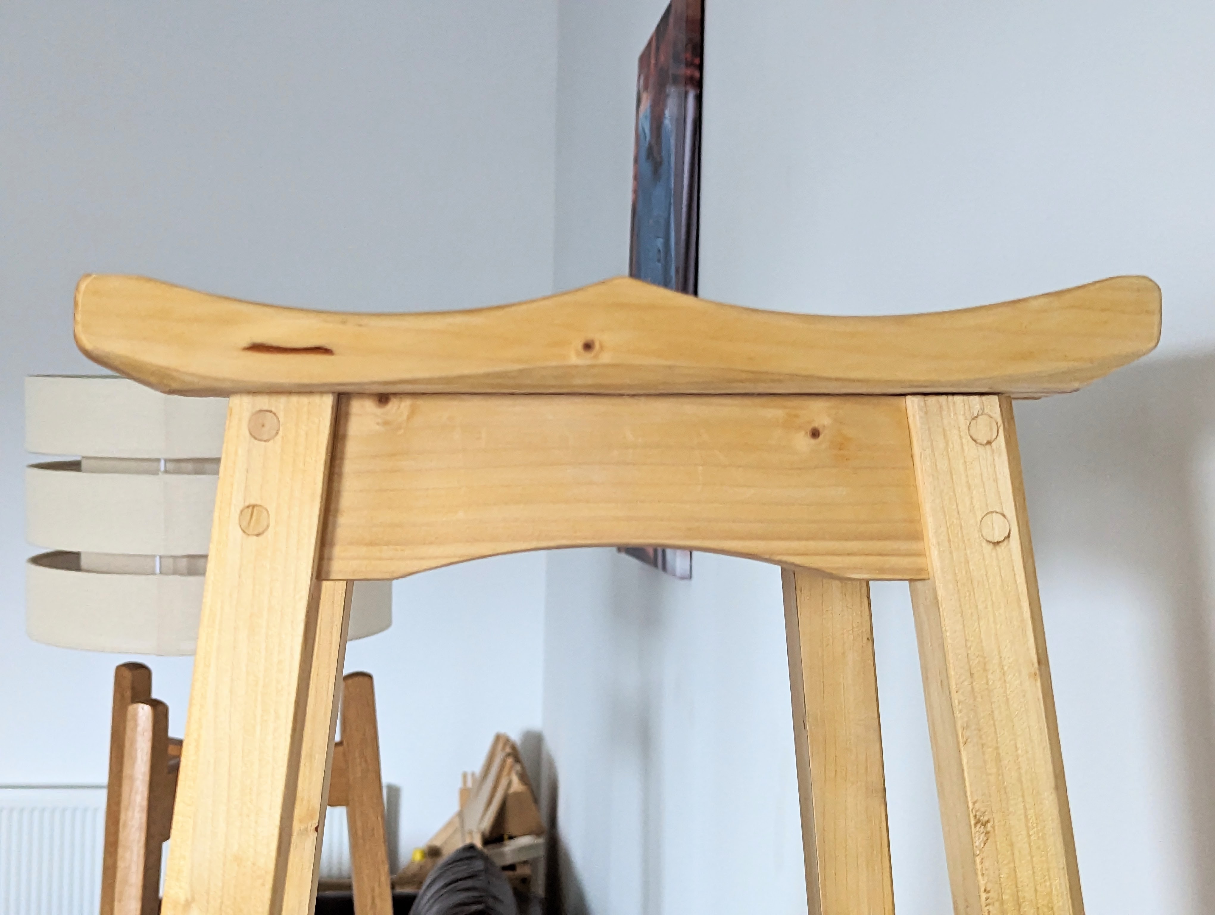 I think it is twelve years ago since I made this bench stool. Though I never actually intended to use it, I have indeed used it every day since it came together purely as a prototype to test for angle, stability, height, etc. It became one of those 'cobbler's children' things. This stool version was made from two two-by-four spruce studs so very soft and not particularly good wood for resilience. Had I listened to the naysayers I would not have had twelve years of use from the stool. I'm guessing that this stool could just about see me out if I do indeed I live using it until I am 100. Who knows?
