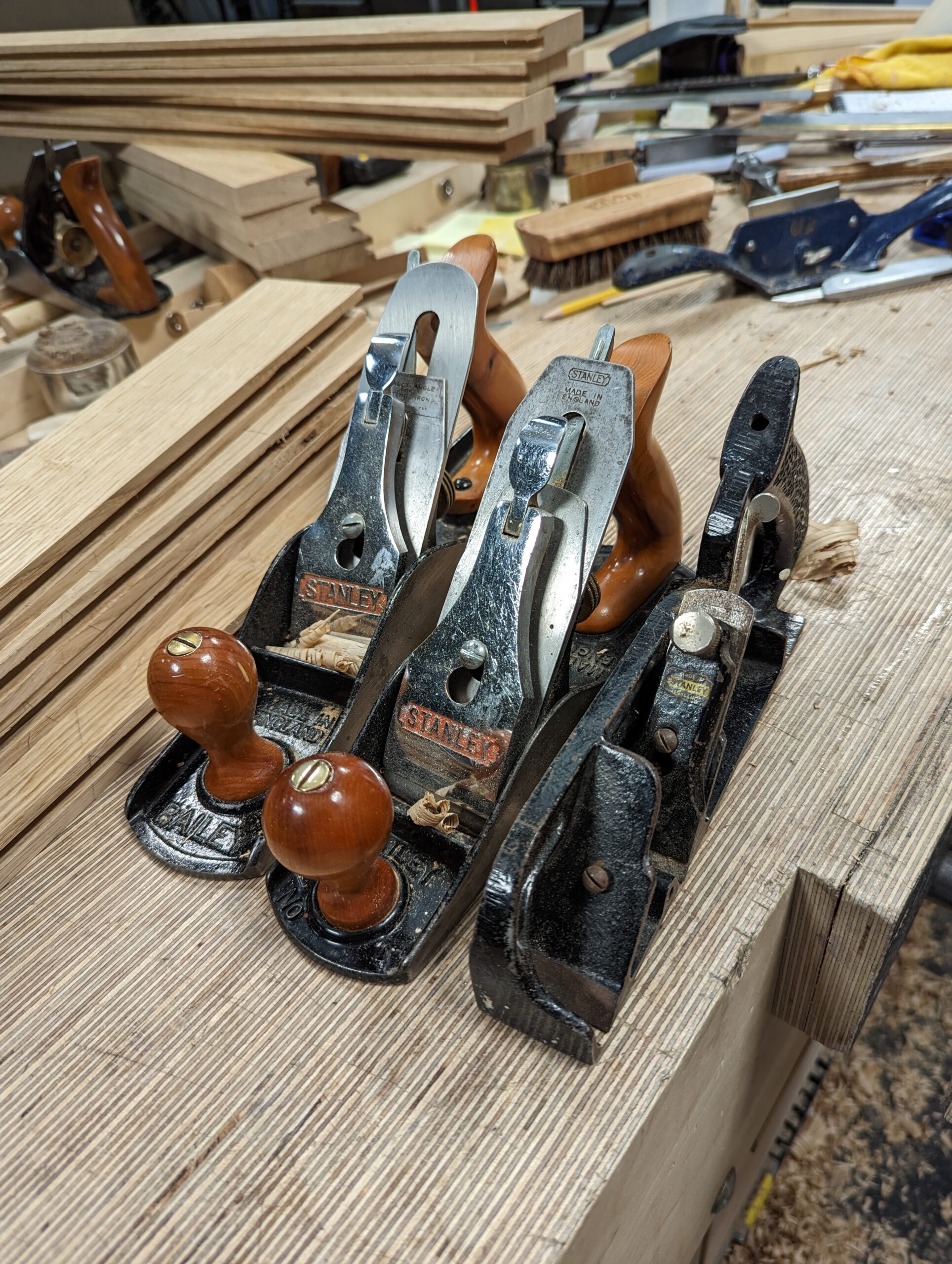 My most used planes are my #4 and #5 smoothing and jack planes respectively. Two #4s mean I can split my use time between two and have a refining set of shallower depth on the one and an alternative deeper set to the other. It's always the same way; yew is for fine work, stained beech for deeper cuts that tackle any remaining defects like slight cups, bows, twists and crooks. My #5 is another refining plane. I should say here that my scrub planes go ahead of these and do all of the donkey work to take out 95% of wood defects. They must be used carefully as by nature the blade protrudes much more heavily than refining planes and this being so any inclined grain pockets rising against the direction of the cutter will rip and tear. I have grown accustomed to sensing grain through the plane itself in an instant and can flip it around to a pull stroke in a heartbeat and before too much damage-by-depth takes place. That said, sometimes it is beneficial to go against such grain as these can maximise the removal of material and keep the plane pulled by the grain to the surface. The trick is to know when to stop and turn the plane so that enough wood remains to refine the surface through any subsequent strokes with the plane.