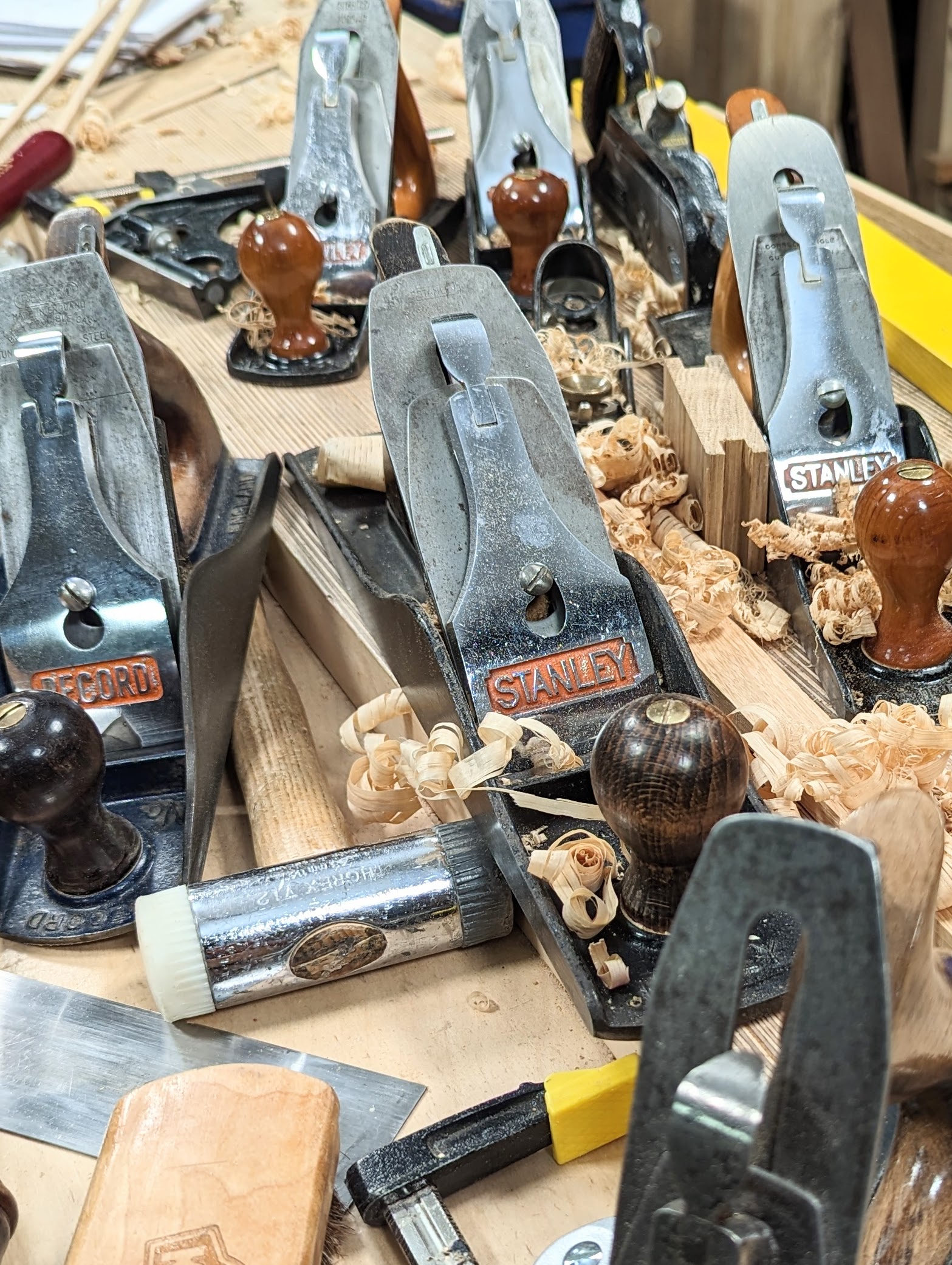 It looks excessive and might be for some but it's not in the life of a productive maker. Woodworking with hand tools in the life of a productive worker must be strategised throughout. Strategic planing soon becomes a way of life when you are a full-time maker but anyone can adopt the practice to make them more efficient and the sooner you understand the reasoning the sooner you will save time. For me it was an evolving process and it been for almost six decades for me to arrive. You don't need to wait. Nothing's changed except my more creative knowledge of how best to work with each category of tools: that's planes, saws, chisels, hammers and so on. Strategic planning is not something I plan but something I practiced according to need decades ago. This is what gets my work done and I want the instancy from each tool chosen and especially the plane picked up, worked and put down in a position ready for action when I need it. This is less about how they are placed generally on my bench. I place three in order and from left to right know where the #4 scrub plane is in relation to my other #4s. If it's not in its bay (a sloped tray that takes three planes side by side) I can tell by two things which plane is which of two #4s I use all the time in wood prep. The handle on my adapted-to-a-scrub version #4 has a slightly larger handle though I doubt you could tell. It also has identifying pinpoint pin knots to its tote. Three of my planes have yew handles. This sets them apart from the rest anyway. Identity is everything.