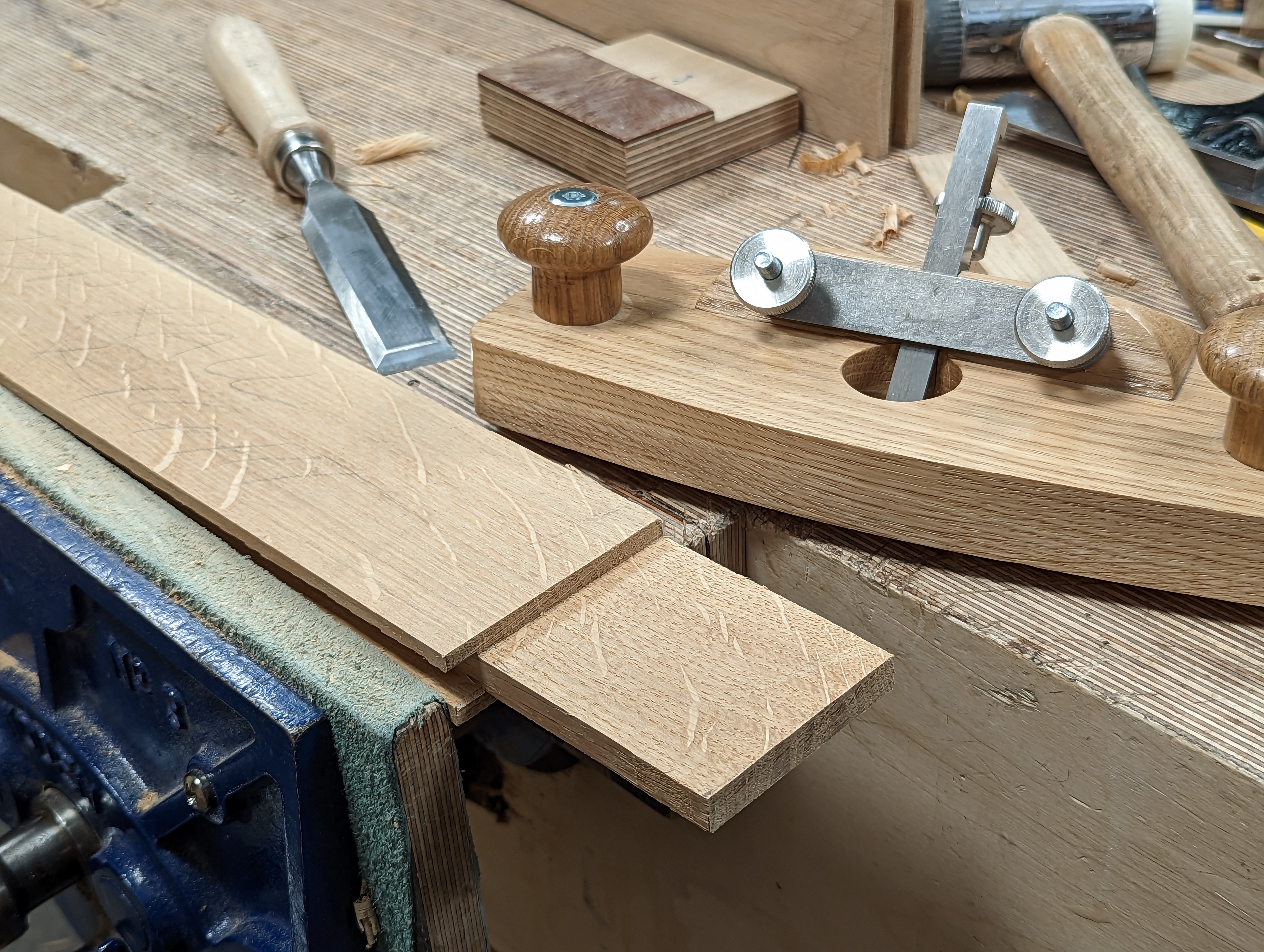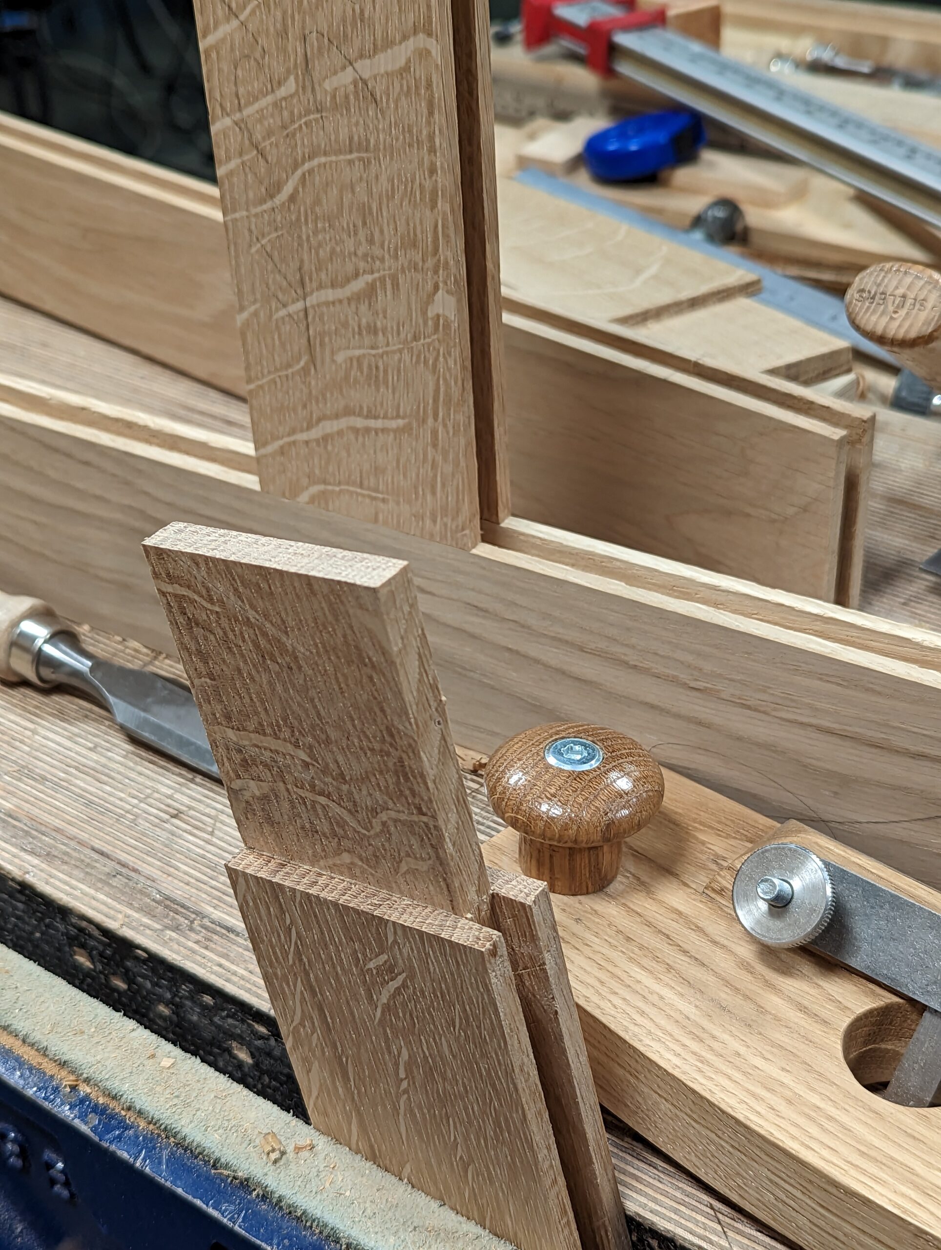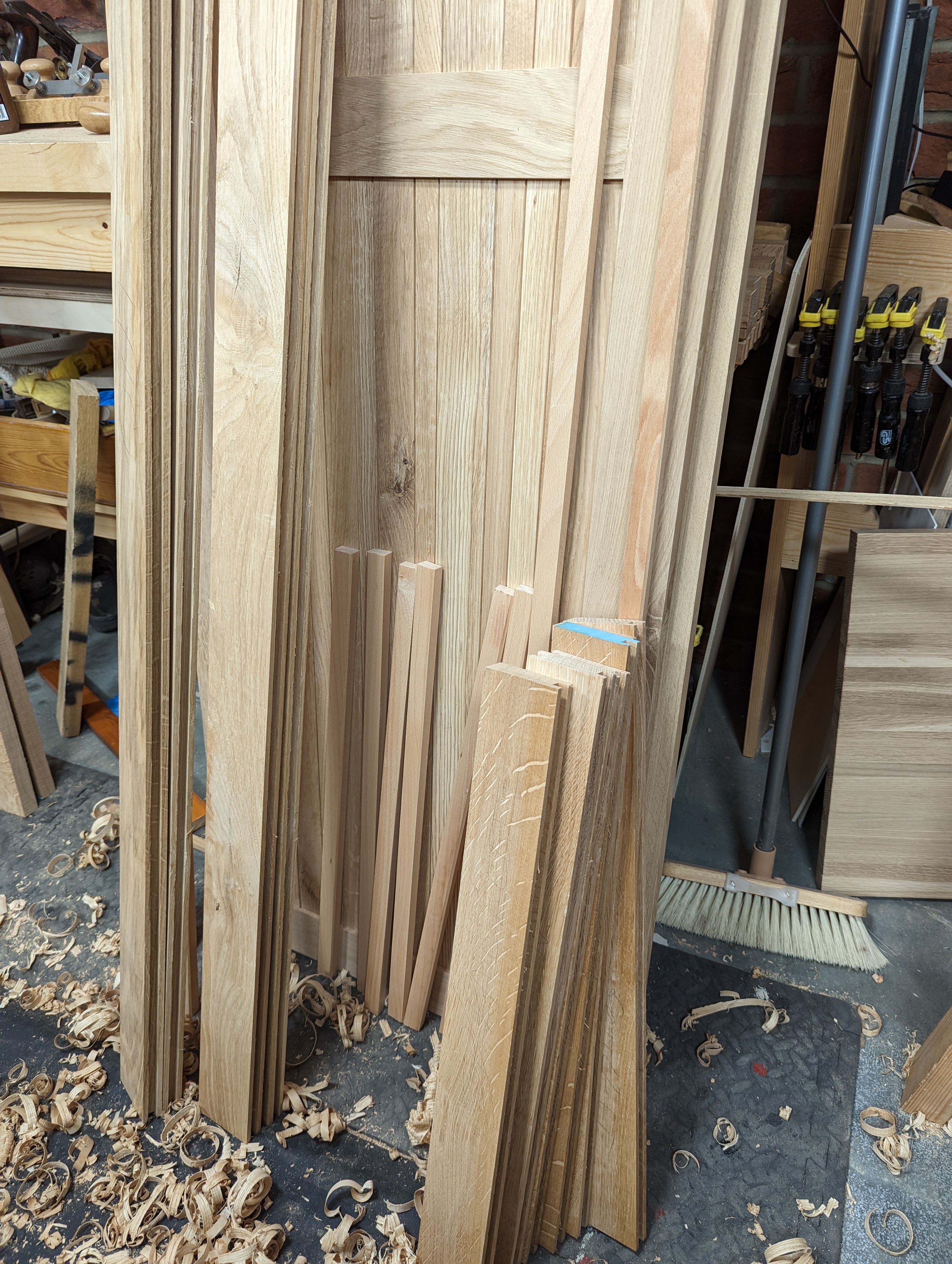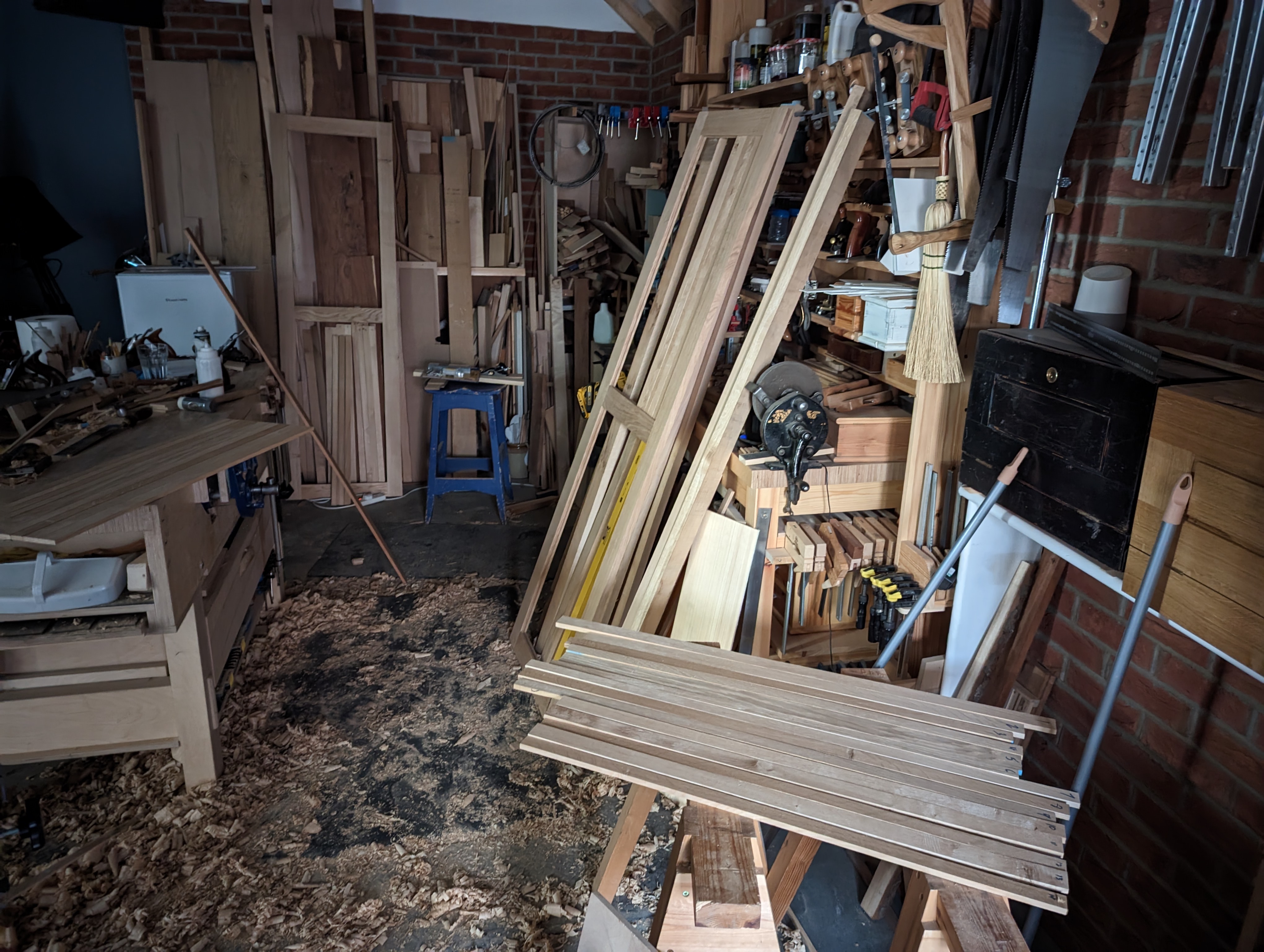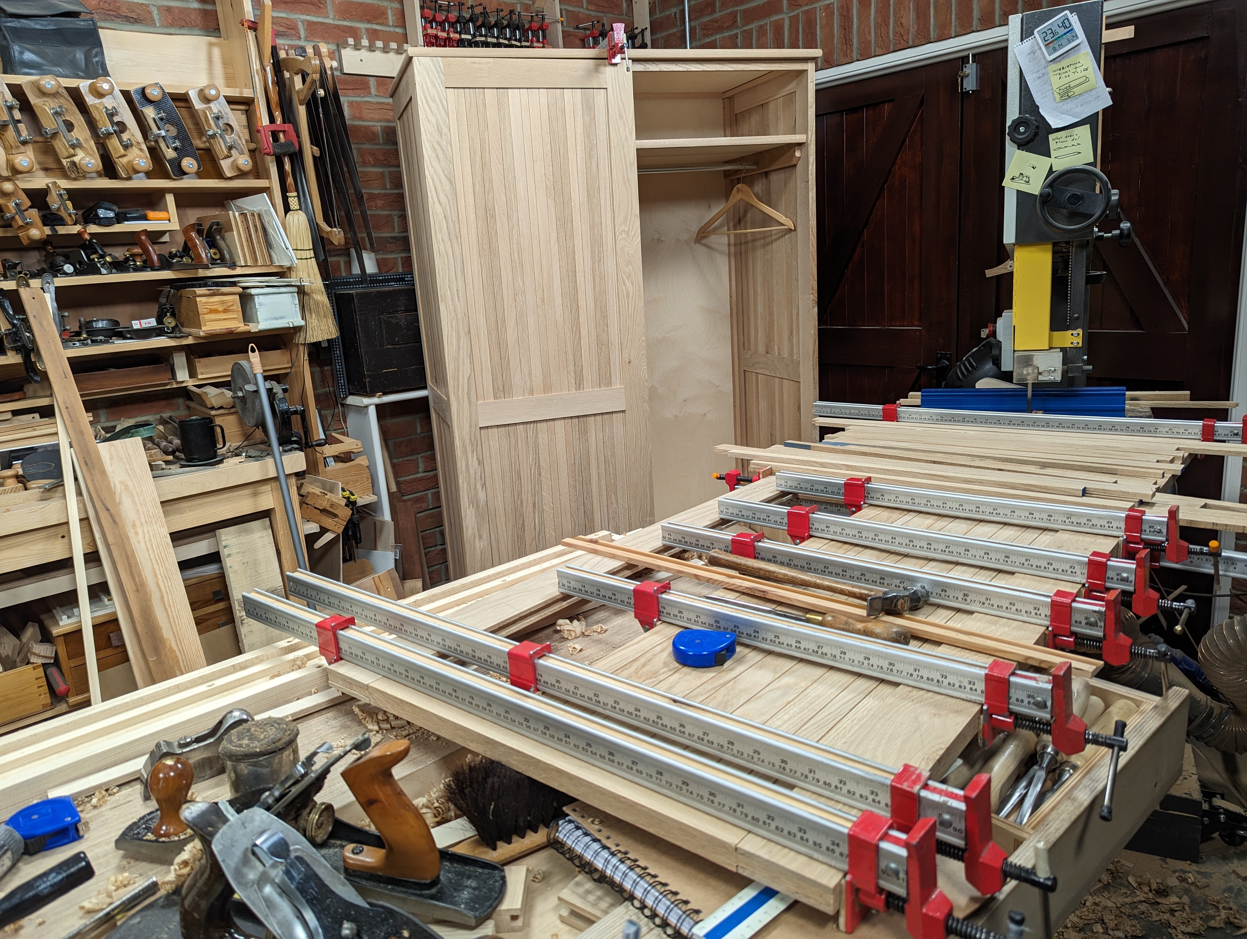 Up to now, I have ripped 200 pieces of oak on the bandsaw mostly but then I have hand planed the four faces to each one using a hand plane. If I said it was easy I would be lying. But I will say that the first roughsawn surface from the mill, with its cups, bows and twists didn't put me off. The workout it gave me could never be achieved by going to the gym dressed in fitness wear and showering to engage with the world. I don't have much muscle but what muscle I do have seems always equal to the task. I usually plane steadily for between an hour or two when I am preparing roughsawn wood ready for final sizing and measuring for joint-making. I do this without much of a break as there is a certain flow to the work that I don't like to interrupt or be interrupted. It's as much to do with the alignment and synchronising of the planes I use as anything else. Four or five planes is common to me. The two scrub planes, adapted #78 and #4, sit ready for roughing down the rough wood alongside two regular #4s and #4 1/2 for finishing and refining stgrokes but then I also like the two jack planes as #5 and #5 1/2. These come in for straightening longer lengths mostly with the wider 4 1/2 and 5 1/2 used best on wider surfaces. But do not forget that I can and often do use just my 4. It's just that on large projects like this wardrobe I must go the extra mile to be efficient with my time, my personal physical limitations and so on. All of this is what gives me the mental acuity such work demands of me. Thankfully, oak's one of the easiest woods to hand plane and saw with the different handsaws. Even so, I rely on my bandsaw for the long and wide cuts. Western woods all plane quite well with a sharp plane; ash, cherry, walnut, all the maples and so on all work pretty much the same but the one ingredient that should never be neglected is sharpening. To plane so much wood by hand means sharpening fifty times not ten. This work and the way of it demands my whole being to engage with it so I never allow anything between me and the work and that includes never wearing headphones, listening to other things in short and controlled measure and disallowing the luxuries others seem always to be distracted by. I work isolatedly with my wood and the tools–I never allow myself too much entertainment beyond my working.