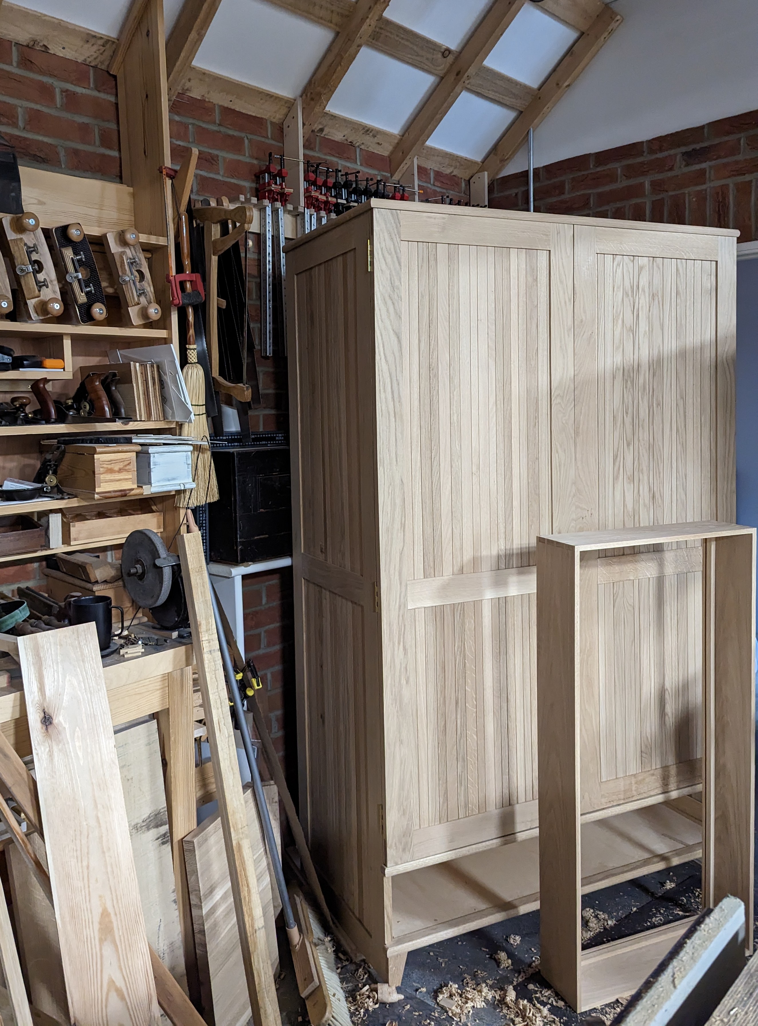 The large case now stood square and steady surrounded by shavings I'd left to remind me of the joy of work. In the still evening when the day closes on the workshop and I glimpse my day's work once more I always feel the certainty of hope even in these highly troubling times. Beneath the darkness now enclosing my days work I consider the daunting task I faced in the beginning when bords of oak would be changed to 200 pieces all to become fitly framed together as a carcass. Each day's building ended with the same feeling of contentment coupled with fulfilment. Such perfect closure is not the way for every working man and woman so I look twice and with respect to the decades of closing the doors on my perfect days.