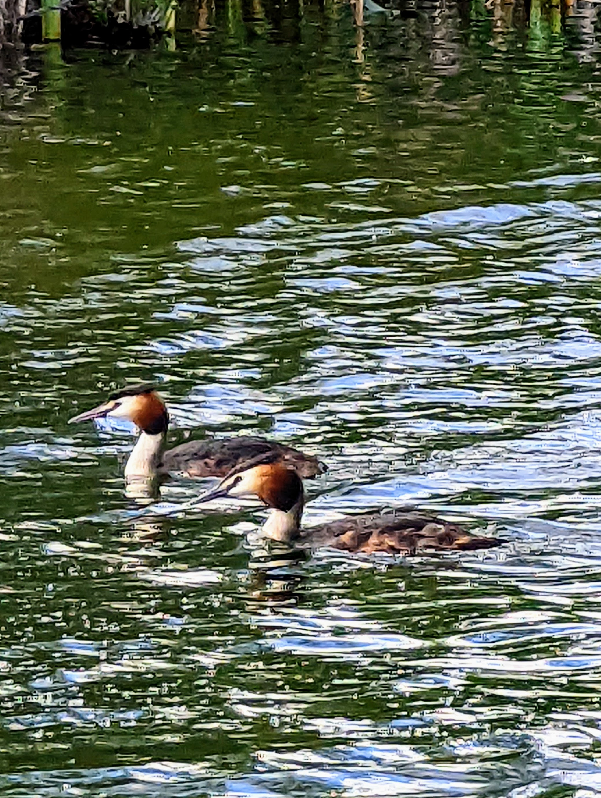 Great Crested Grebe dip and dive throughout a 20-minute break from driving if I am careful to position myself and stay still. They often travel 20 feet underwater and surface elsewhere. There is an exchange between the two, a shaking of heads into each other's faces and then the retrieval of sludgy underwater growth as part of an assertion.