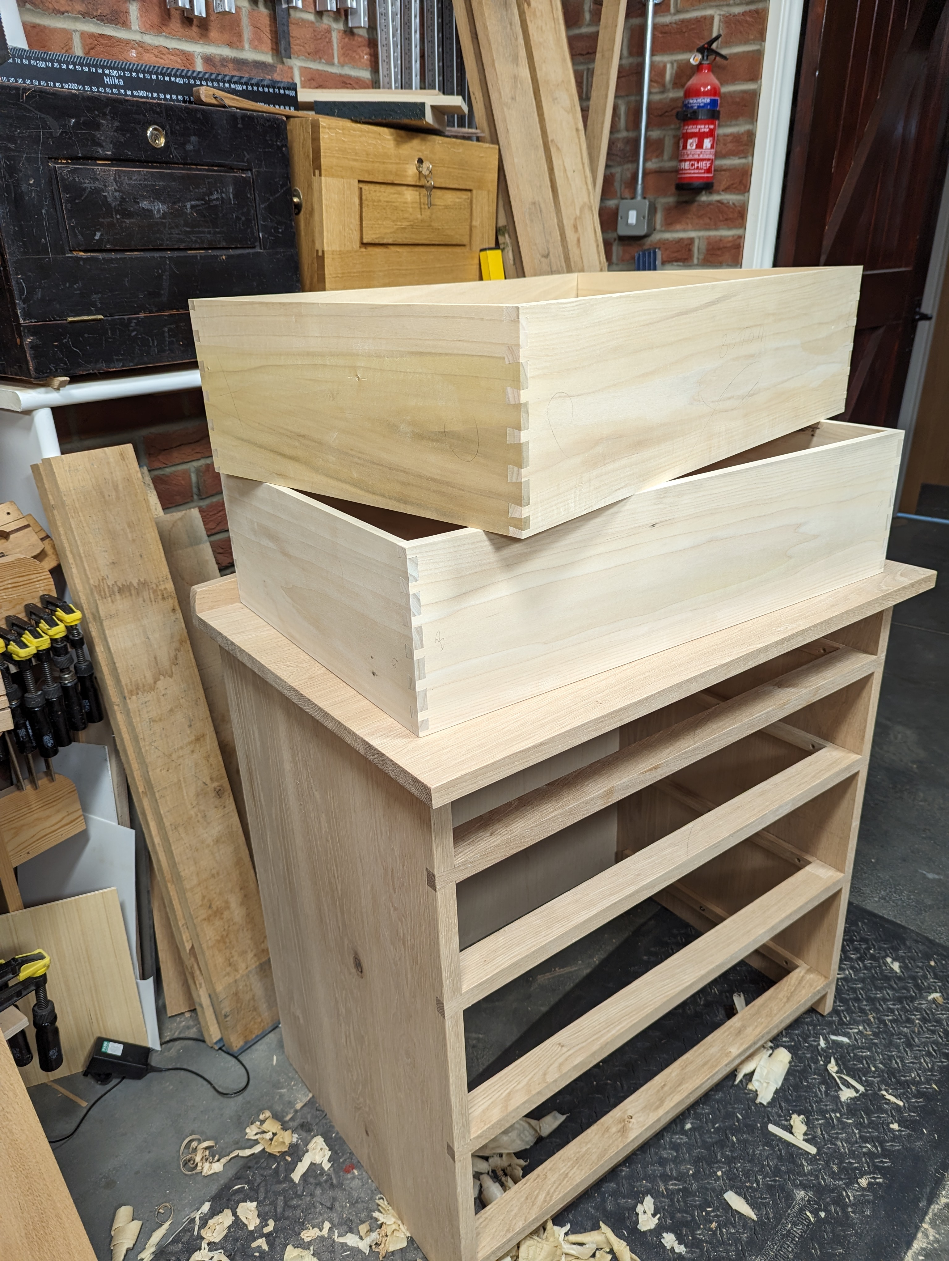I am on the last drawer now. In this, the drawer-making has taught me much. I can take the side from one corner of a drawer and swap it for another corner and it still fits. In fact, I can take for corners and swap each one for another and even turn them end for end or upside down and they will each fit the other without gaps. They are all hand-cut. How is this even possible?