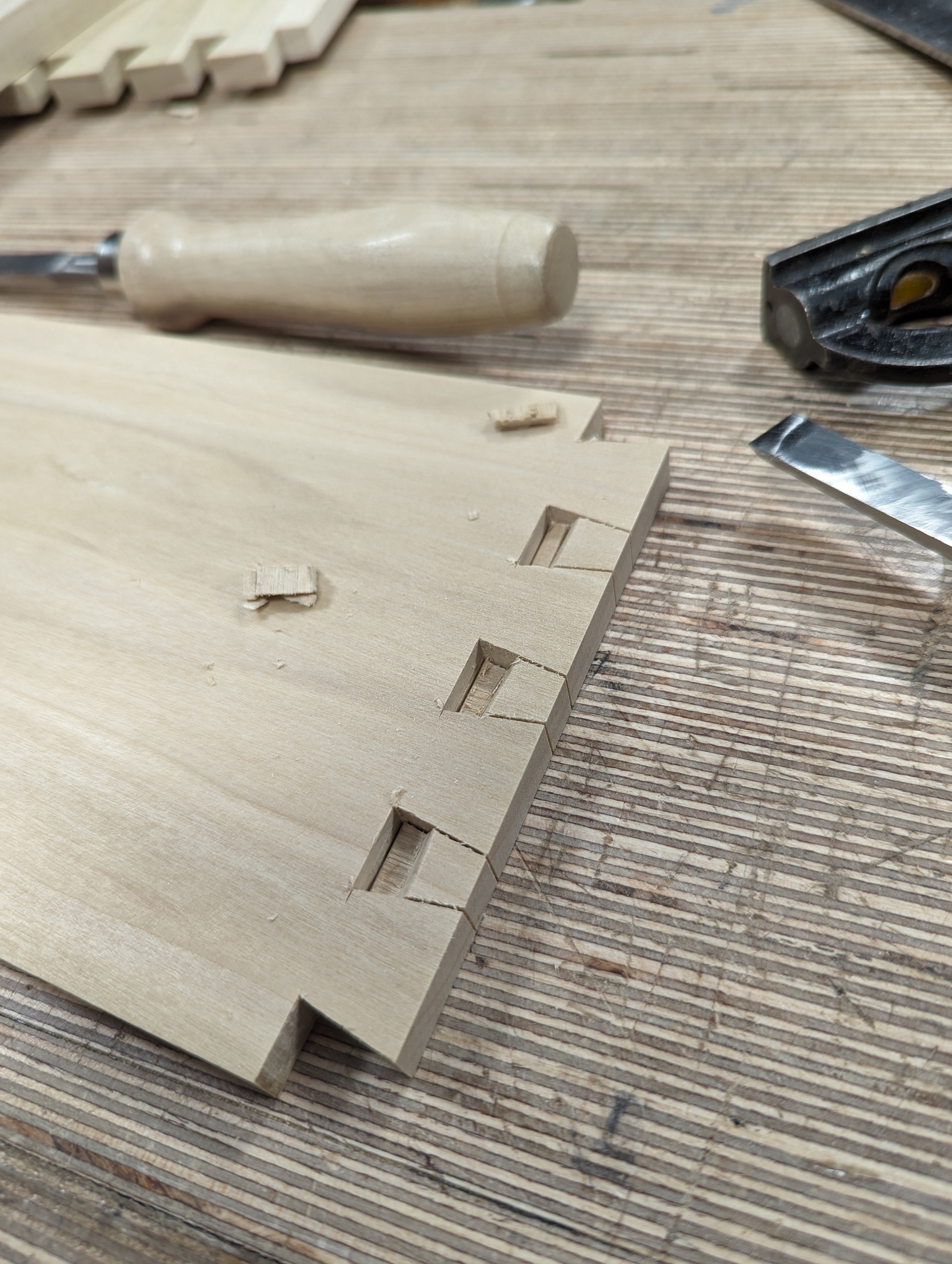 It was setting up the plough plane to cut the grooves that really struck me the most. I had timed myself in cutting the four corner dovetails and realised how quickly they came off the saw. I made two eight-inch deep drawers with dovetailed top to bottom to each of the corners in less than two hours. All eight dovetails came straight off the saw with no paring to fit and they all fit as close to perfection as was humanly possible. I once watched a close friend and colleague make dovetails for a similar chest using a power router and a dovetail jig. Stan was not used to setting up the jig and that took him quite a while. This man had never made dovetails with a power router and jig before and it was his boss, Kevin, that forced him to do it. I think the issue was that Stan was not a fast maker and each piece took him a long time to make. But another truth was that Stan's work was always impeccable. No one could ever find even the smallest fault in it. He never used the machine to make his dovetails after that simply because the end result looked machine-made and the dovetails were not as perfect as the hand-cut ones.
