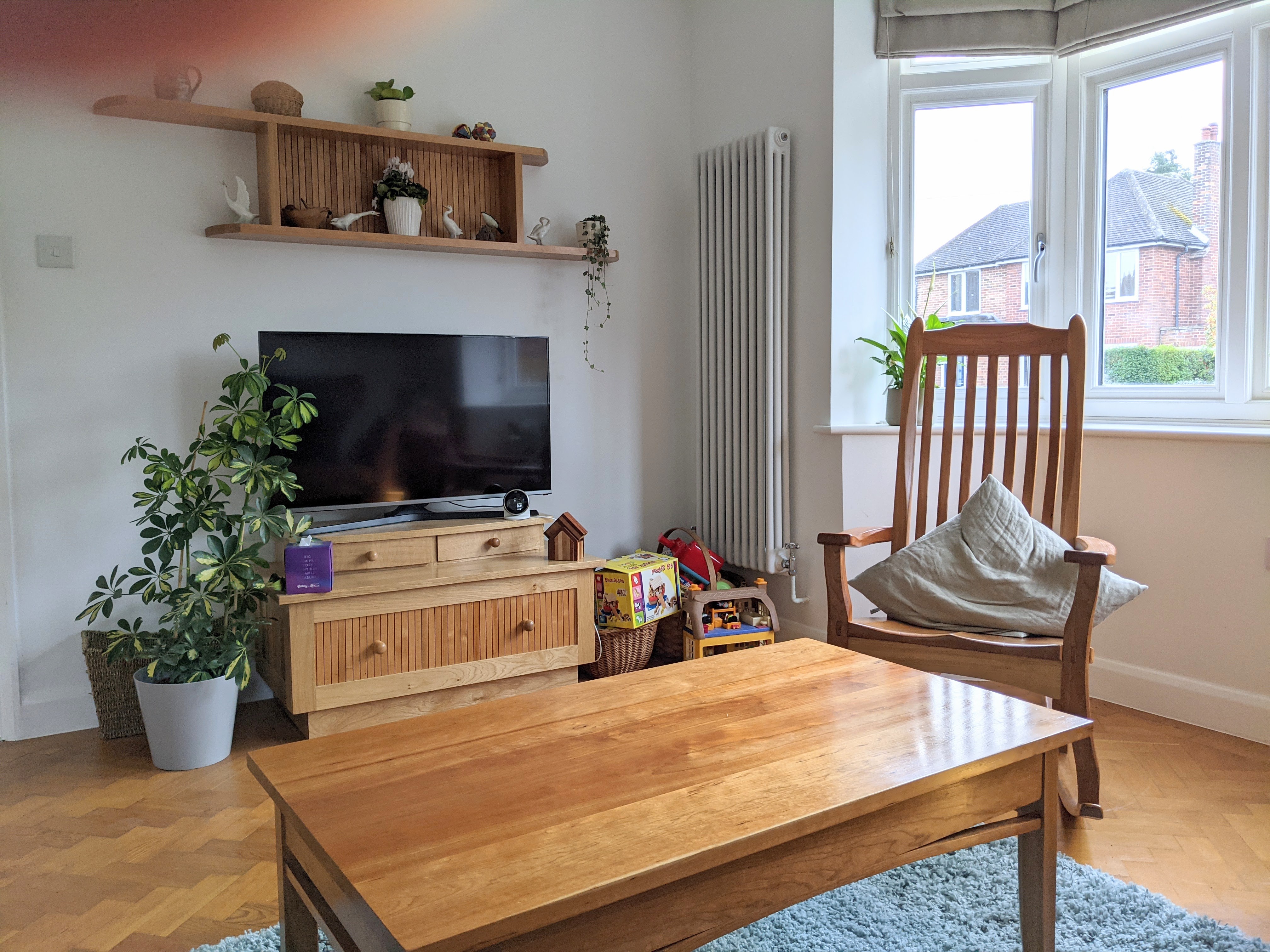 The TV stand is invaluable to the Sellers' home now. The deep drawer is ideal for storing toys, games, puzzles and blankets. The design is unusual in that I liked the idea of tambour strips for facings and such rather than a simple flat front from a solid piece.