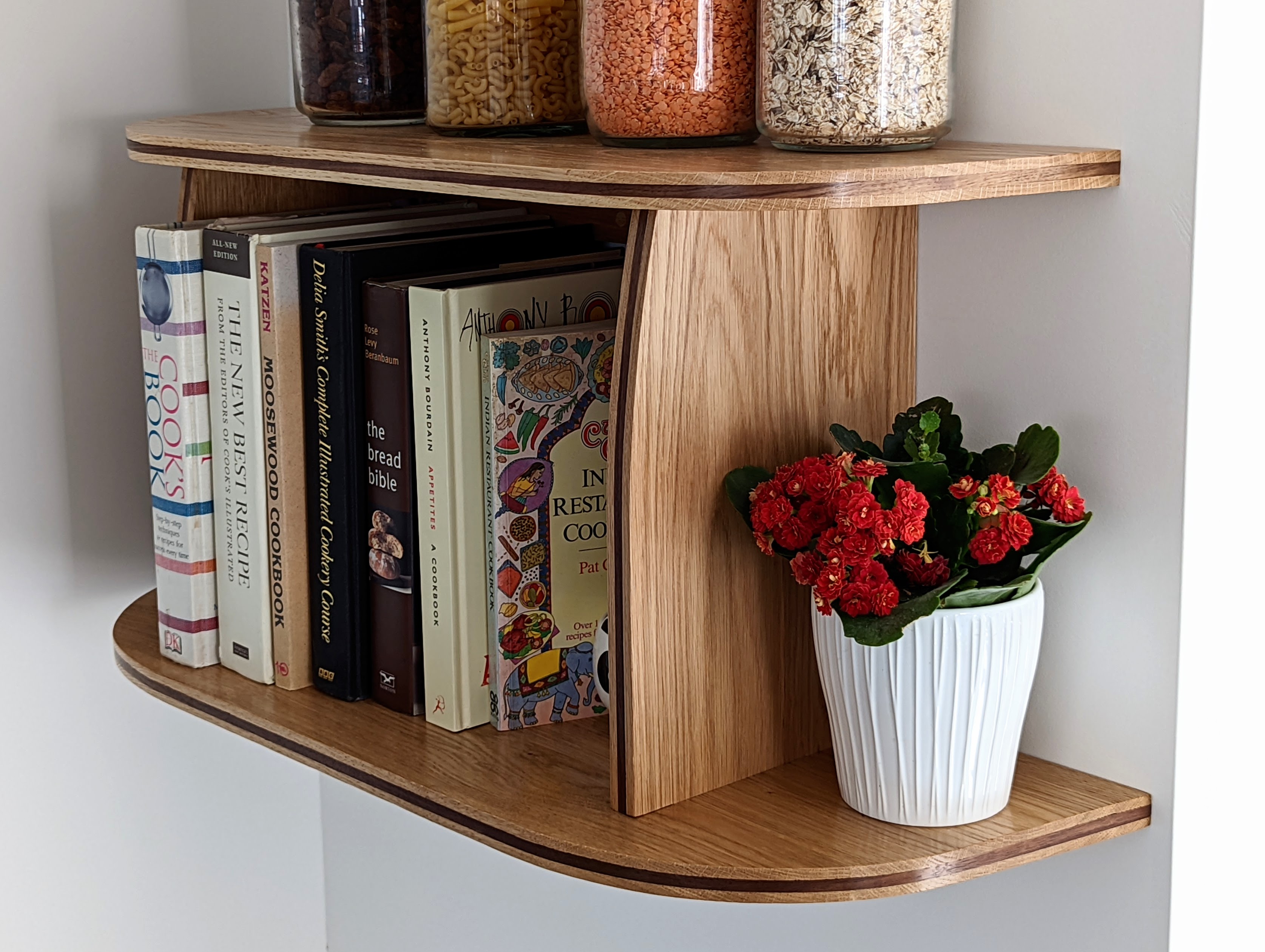 There are always corners in any room that benefits from small wall shelves like this and what better use than for those special family cookbooks? In this unit, I used sliding dovetails for their intrinsic strength and minimalist look.