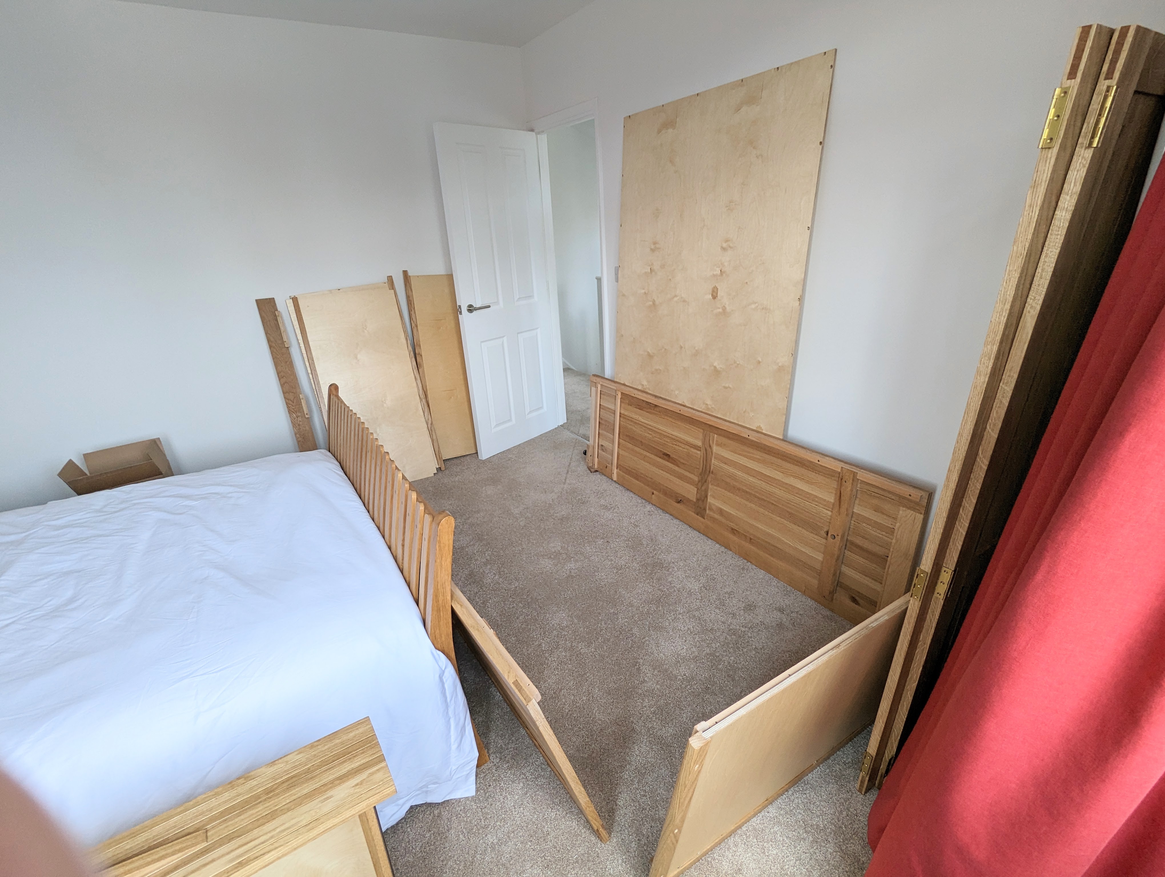Moving on into the upstairs and thinking of kingside beds and wardrobes can be a little daunting but the challenge for me was making things that could be moved singlehandedly by this 73-year-old man. So between making and moving, climbing stairs and installing, I had my work cut out and remember that the only machine I used on all of these pieces is a bandsaw and no I did not buy machine-planed stock, only rough-sawn.