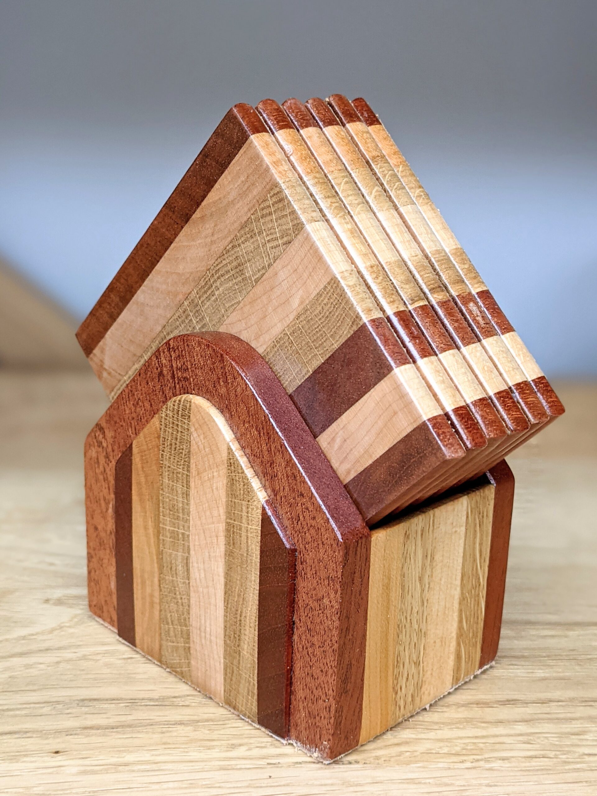 I like coasters even though many finishes are liquid-resistant including spirit alcohol, They make really good gifts for friends and relatives. I usually make several sets like these by ganging up the laminations and then crosscutting the length on the bandsaw. Planing the end-grain versions needs a truly sharp plane but the long-grain versions plane easily. I made it hard on myself on this set by combining end-grain with long-grain side by side.