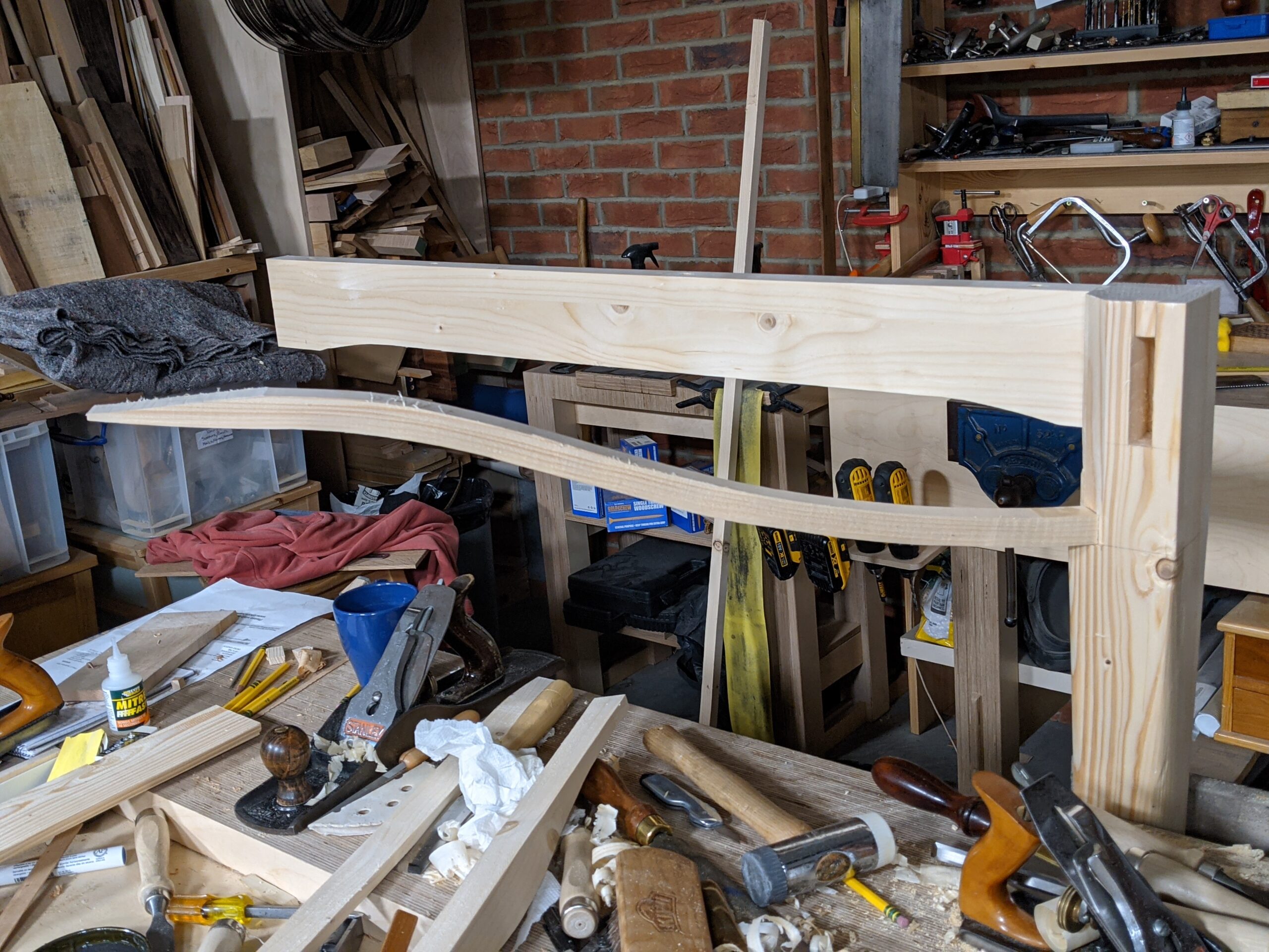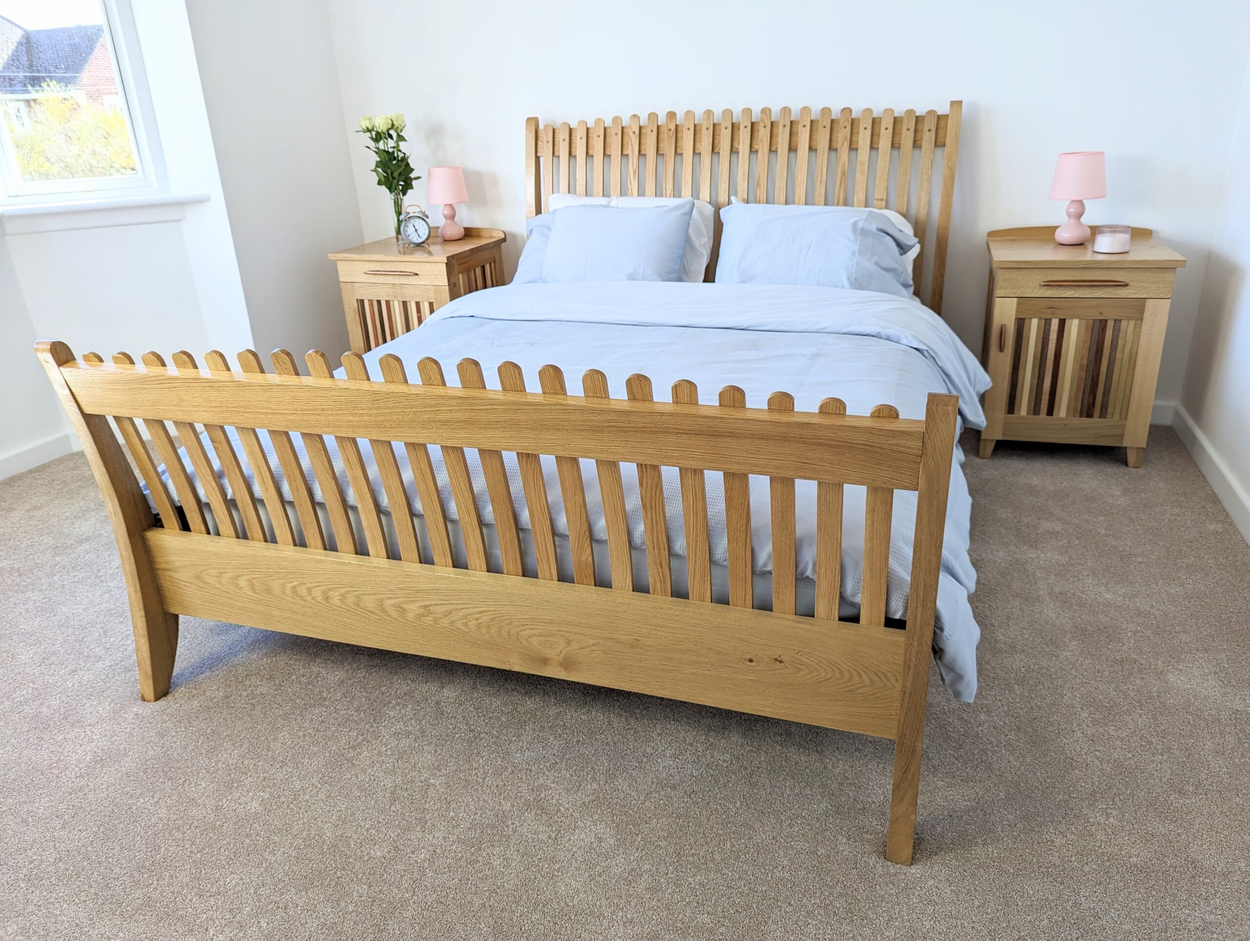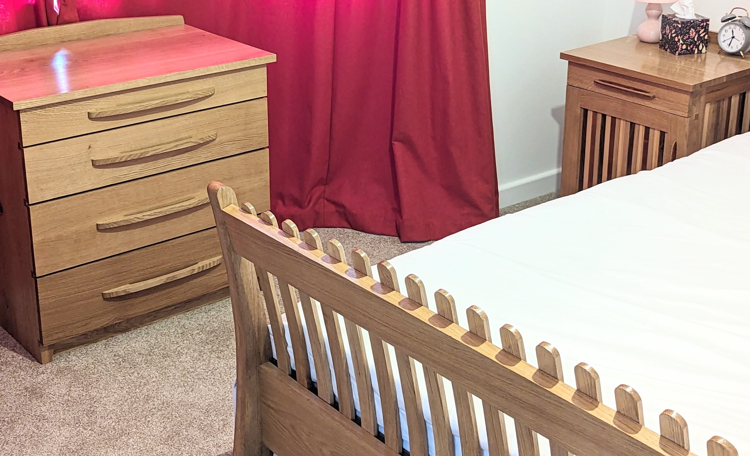 The first major piece for upstairs was the kingsize bed in solid oak. The good thing is that all beds are made to be dismantled and this one was no different. I used bent laminations to give it pleasing lines yet I kept the design simple and not overwhelming to anyone. It's also scaleable so it would make a great design for any child or single bed too.