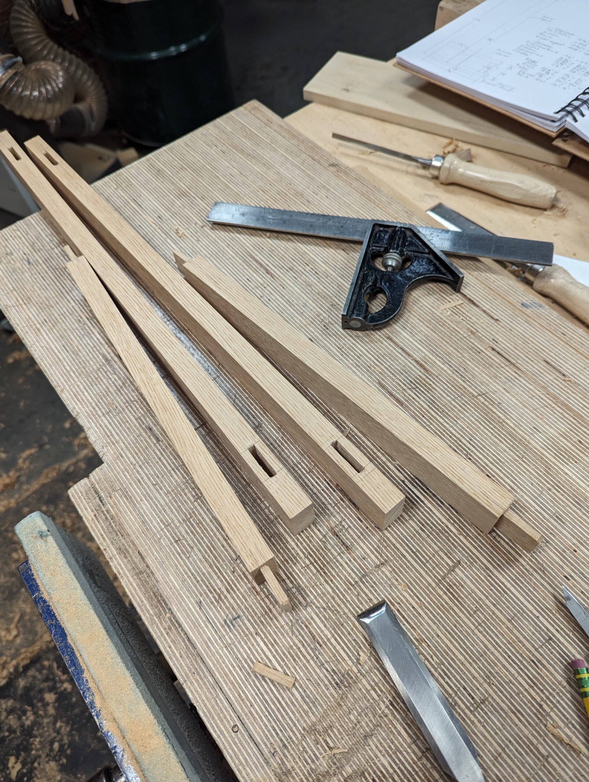 This week I timed myself cutting four mortise and tenons to make a second oak mirror frame and the four corners took me a total of one hour so fifteen minutes apiece. The shoulder lines and joints needed no trimming or fitting nor did I use a shoulder plane because the shoulders off my knifewalls guaranteed perfect seatings to each one and on both sides of the shoulders. But it would be wrong for you to assume that you have to make 30,000 mortise and tenons to get excellent results. Following certain patterns guarantees that you will get them pretty much straight off after a short period of practice on scrap wood. What was it I can't explain? Oh, why I still enjoy doing it. There is a premise that I have used since I got the revelation of it for teaching others. With ten hand tools and three joints, you can make just about any piece of furniture you need.
