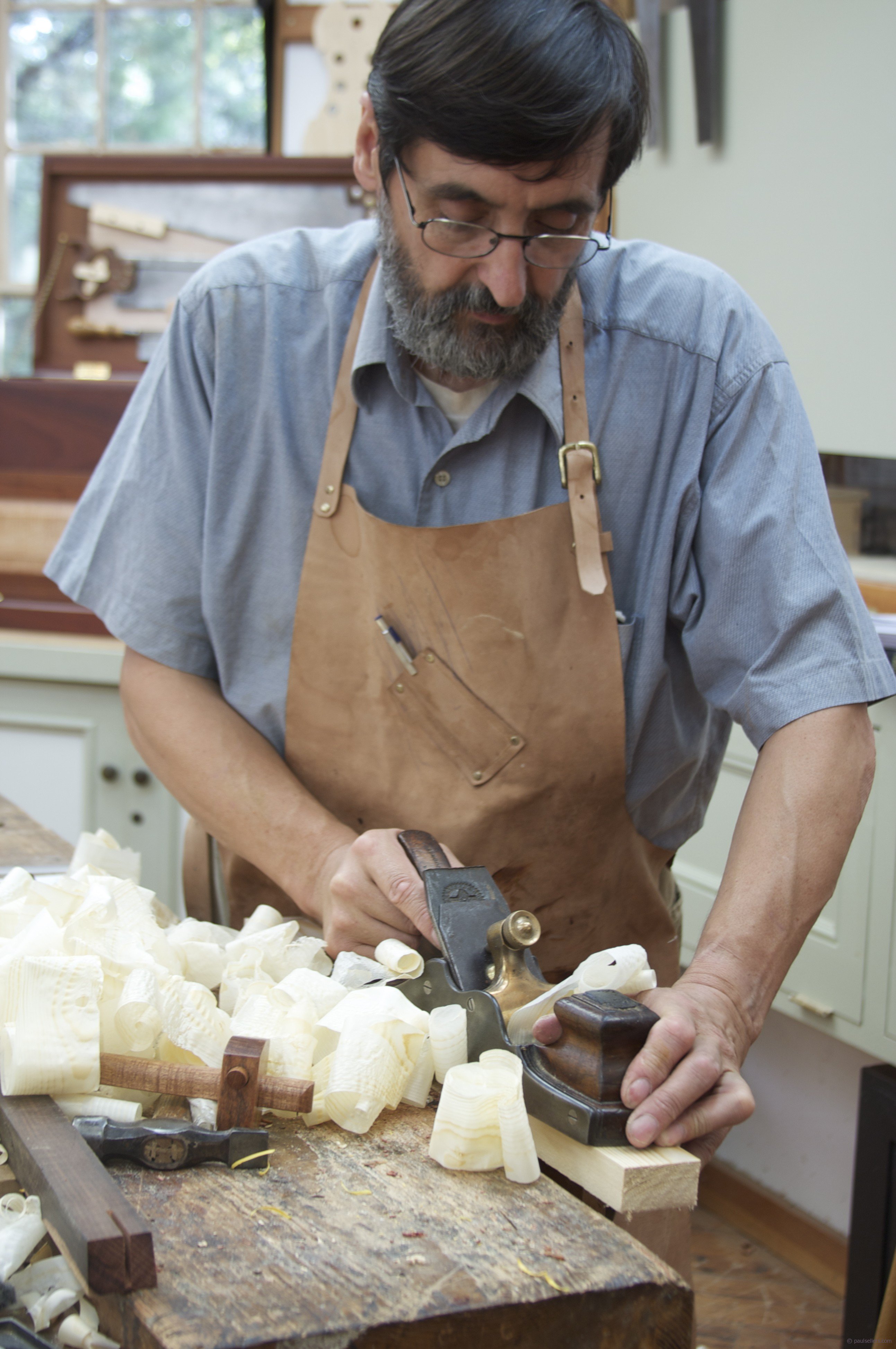 I conclude now that my adopting and enjoyment of using and advocating the British-type wooden bench planes have absolutely nothing to do with nostalgia or antiquity, a stubborn refusal to go with the times or any such thing. It has to do purely with functionality. I think if I put one of my wooden planes in your hands and set you up at my bench you would see exactly what I mean. Once you understand how to adjust them, the speed in experienced hands equals that of those with the adjustment mechanisms on any of the modern metal-cast planes. The men I worked with as an apprentice adjusted their planes after sharpening in a matter of seconds. During use, they could bump the heel of the plane to withdraw the cutting iron by a thousandth or bump the toe to reset it by the same thou' of an inch and get on with the job of planing. This was done on the end of the bench or the side of the vise. I know, we dismiss them because this sounds, well, too crude. But you must remember these planes survived through a 200-year span of woodworking history and more, a period when some of the finest and most creative woodworking of any kind existed. Infil planes with cast metal soles and sides came into being but were less used by most woodworkers than the all-wood versions because of weight, cost, high friction and so on. They never went longer than a Jack plane because the weight would have been impossible for most men. That too tells you something. Also, it's well worth remembering that all metal planes distort in exchanges of temperature. Rarely do they remain true and flat and straight.