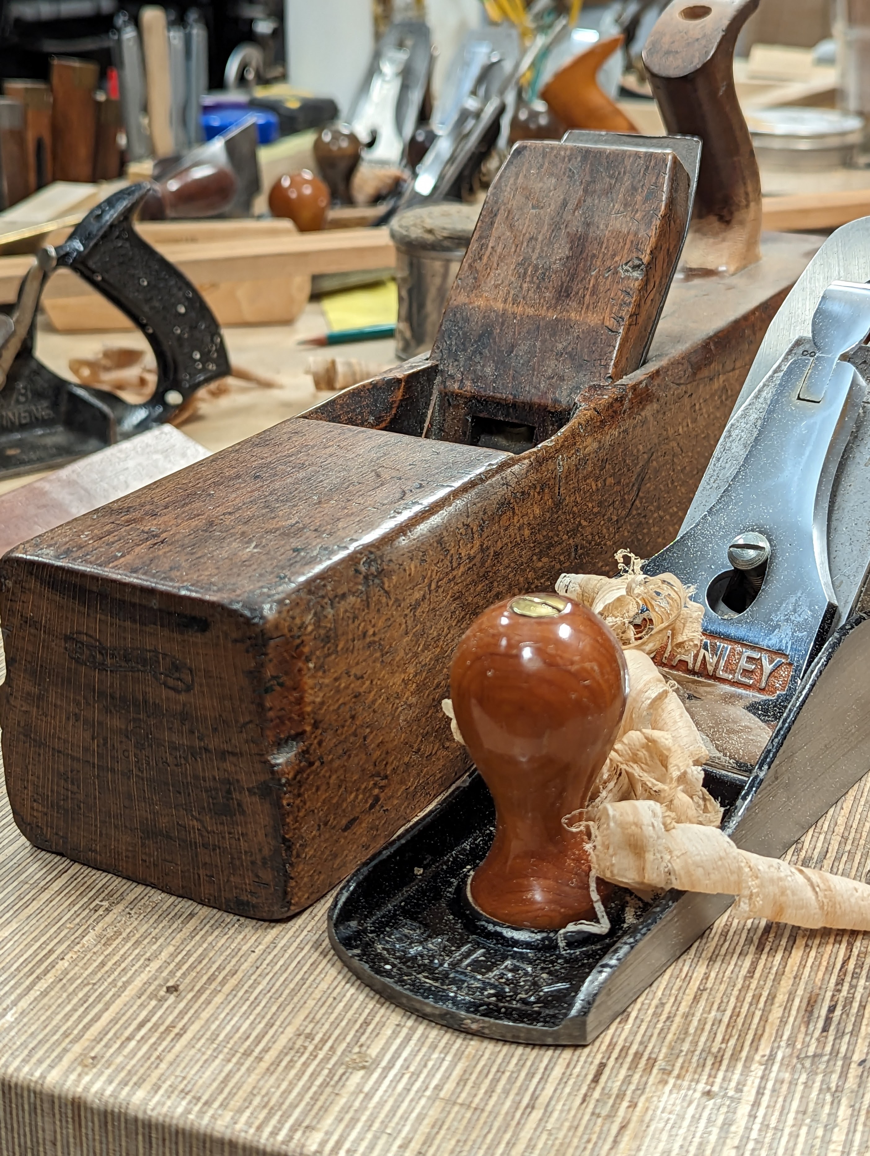 The British wooden planes I currently own all have laminated steel cutting irons that have good edge retention and take a keen edge too. Just as good and equal to any modern versions I have ever used. I think that this might well be because they were hammer-forged under the heavy tonnage of trip hammers rather than just rolled steel. I might dare to suggest that they are at the very least equal to any named cutting iron you care to name including those made by the so-called premium plane makers and they keep going over an extended period. The Mathieson one I am using above and my Marples ones all just keep going. Aside from that though, those who do believe we've truly bettered the bench planes with all metal ones usually say such things in ignorance rather than experientially. Even though it is slightly possible that they used a half-decent wooden one it's most likely that they never put enough into it to match their skill levels to the masters that owned and used the wooden planes. Gaining mastery in using any hand plane as the ancients in our craft did takes time and most people these days are time-poor so I understand the reticence to try something just for the sake of it. You don't just pick up a wooden, UK-designed 18th-century beech plane after relying on all-metal ones and own the experience. These old masters truly mastered the working of them. They sharpened and reset them with incredible speed, using the bench itself to nudge the cutting iron in and out for depth of cut and then tapping the plane or iron for sideways for lateral alignment in split seconds as they went on with their planing tasks. No matter how good you are with an all-metal version, mastering wooden ones of the British type (which includes those in the US with a few slight modifications) takes time but once you have it the methods belong to you and so too the joys of using them. Woodworkers may be free to give a negative opinion on using wooden planes as some kind of entitlement but it's really only worth anything if indeed it is based on fact.