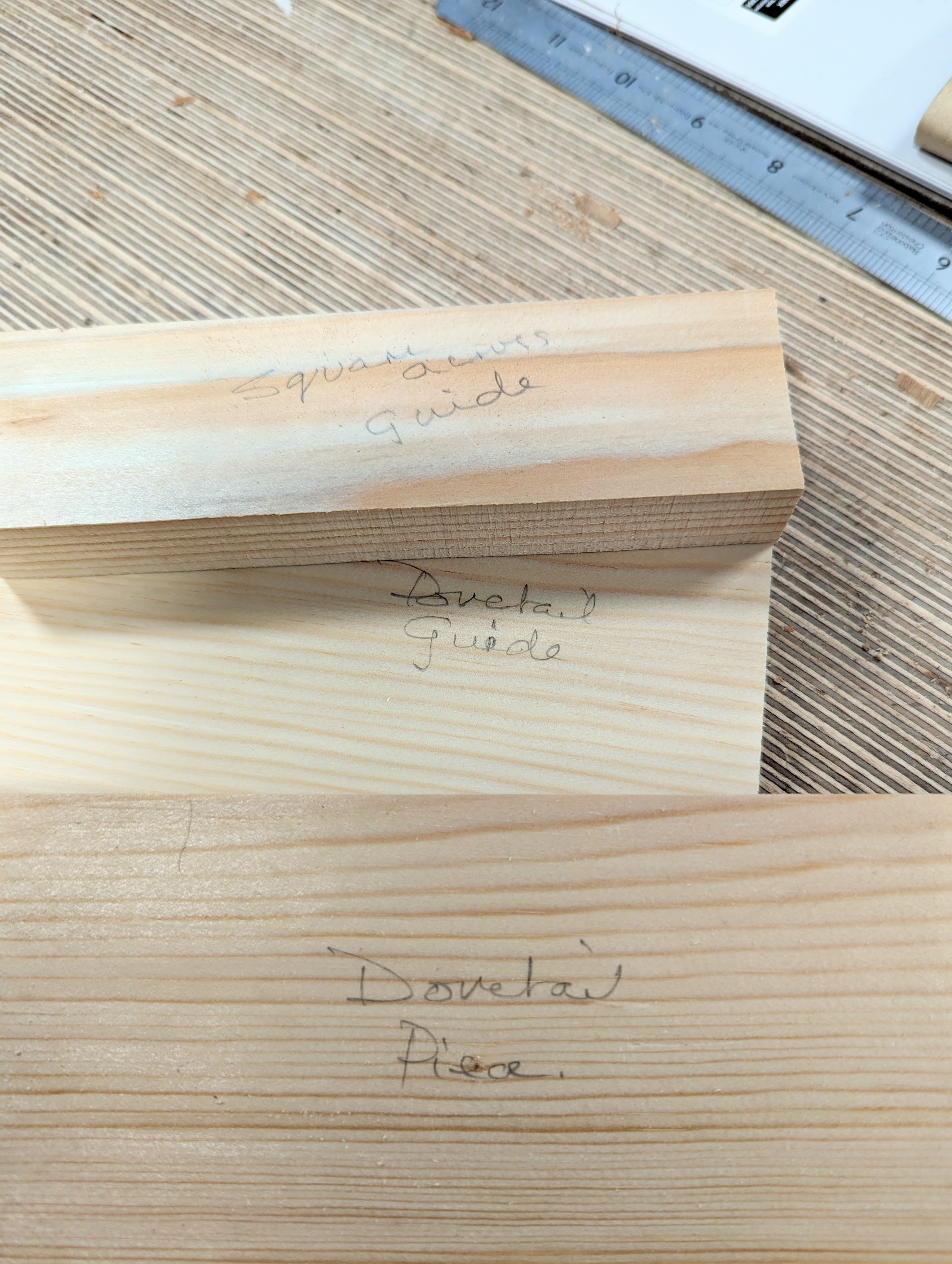 Use the dovetail guide or a sliding bevel set to a 1:7 ratio for laying out the guidelines on the guide piece.