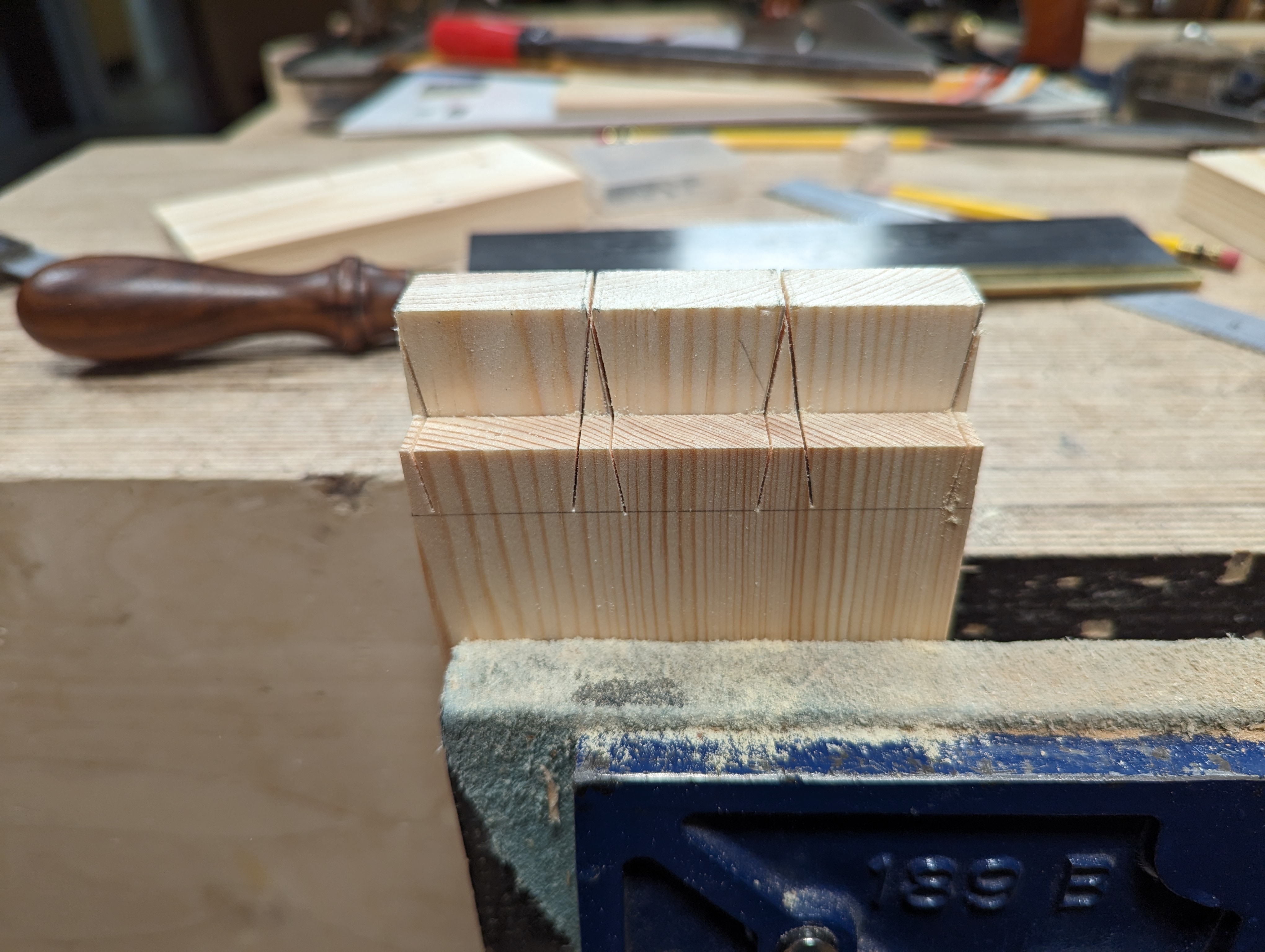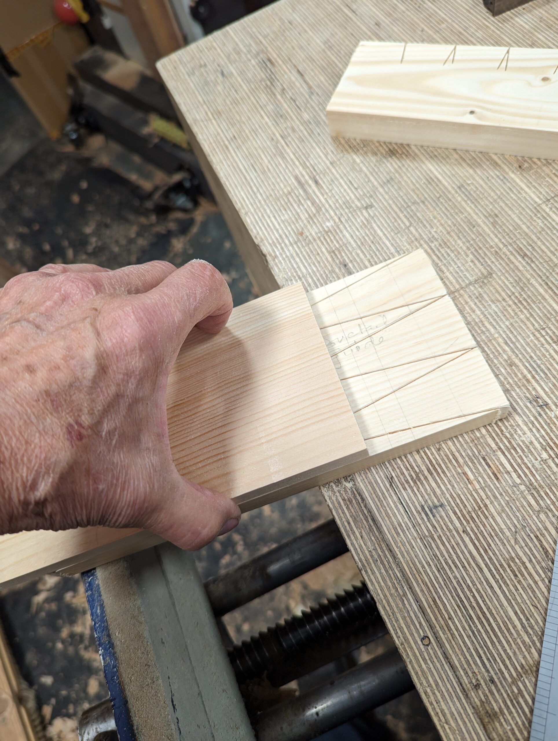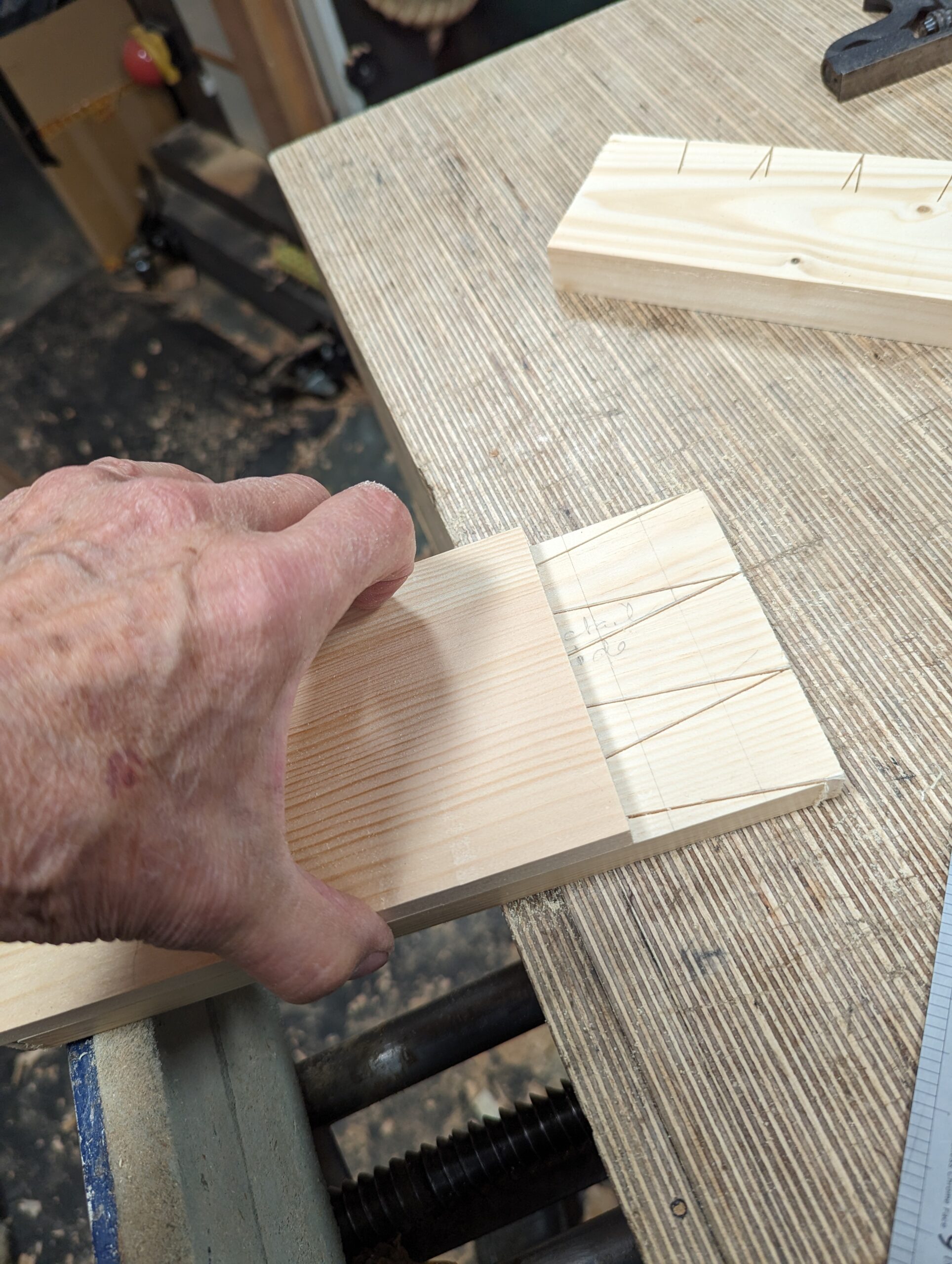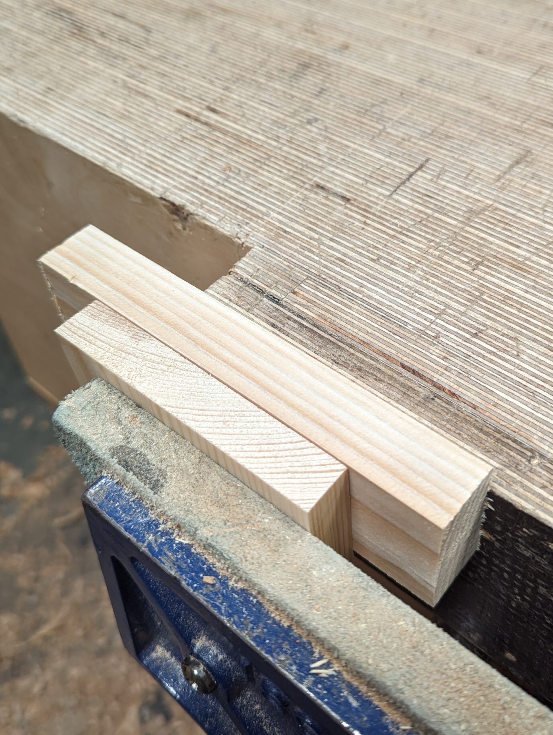 I clamped my two pieces into the vise level with one another. The sacrificial square-across piece is at the back.