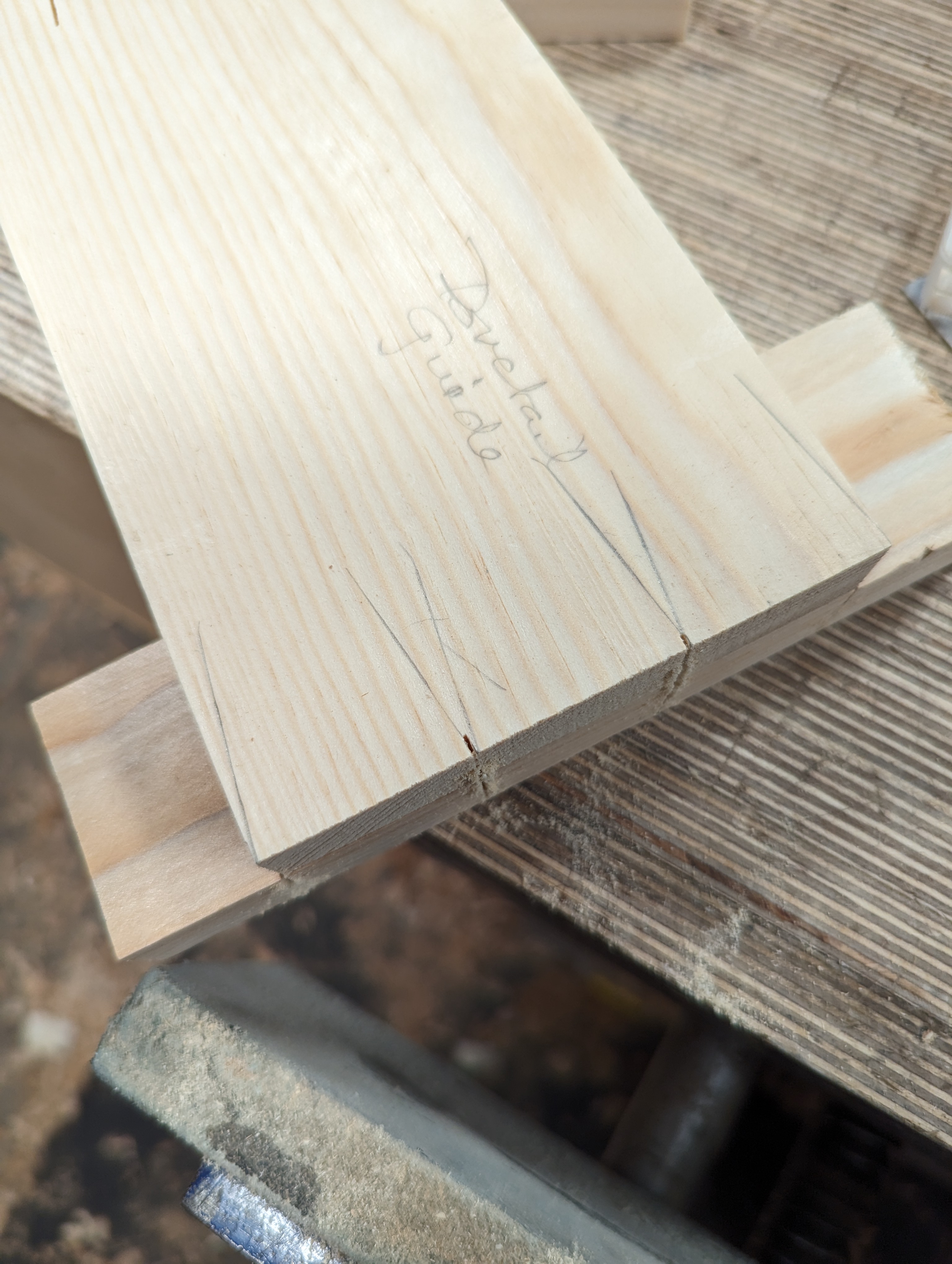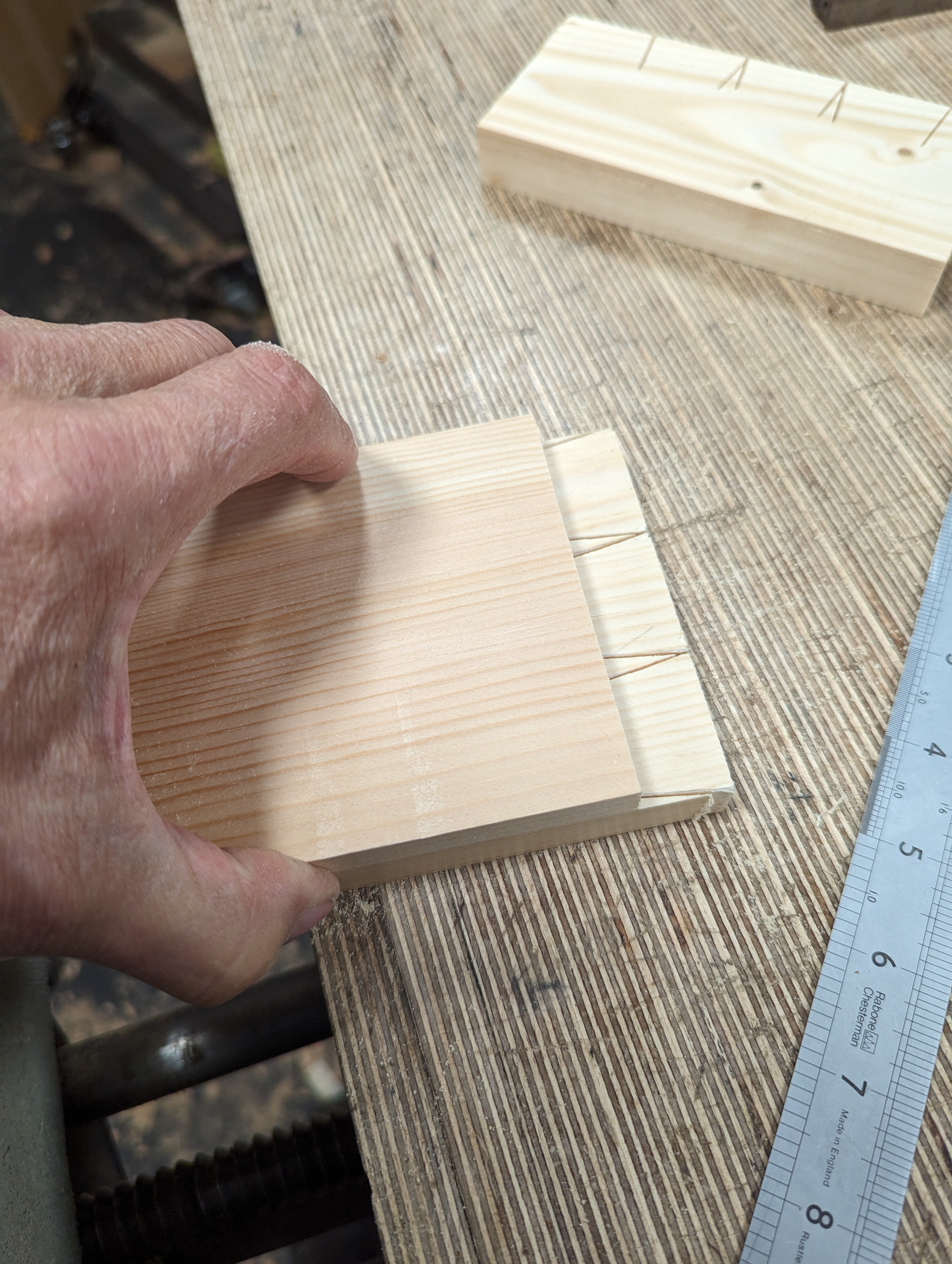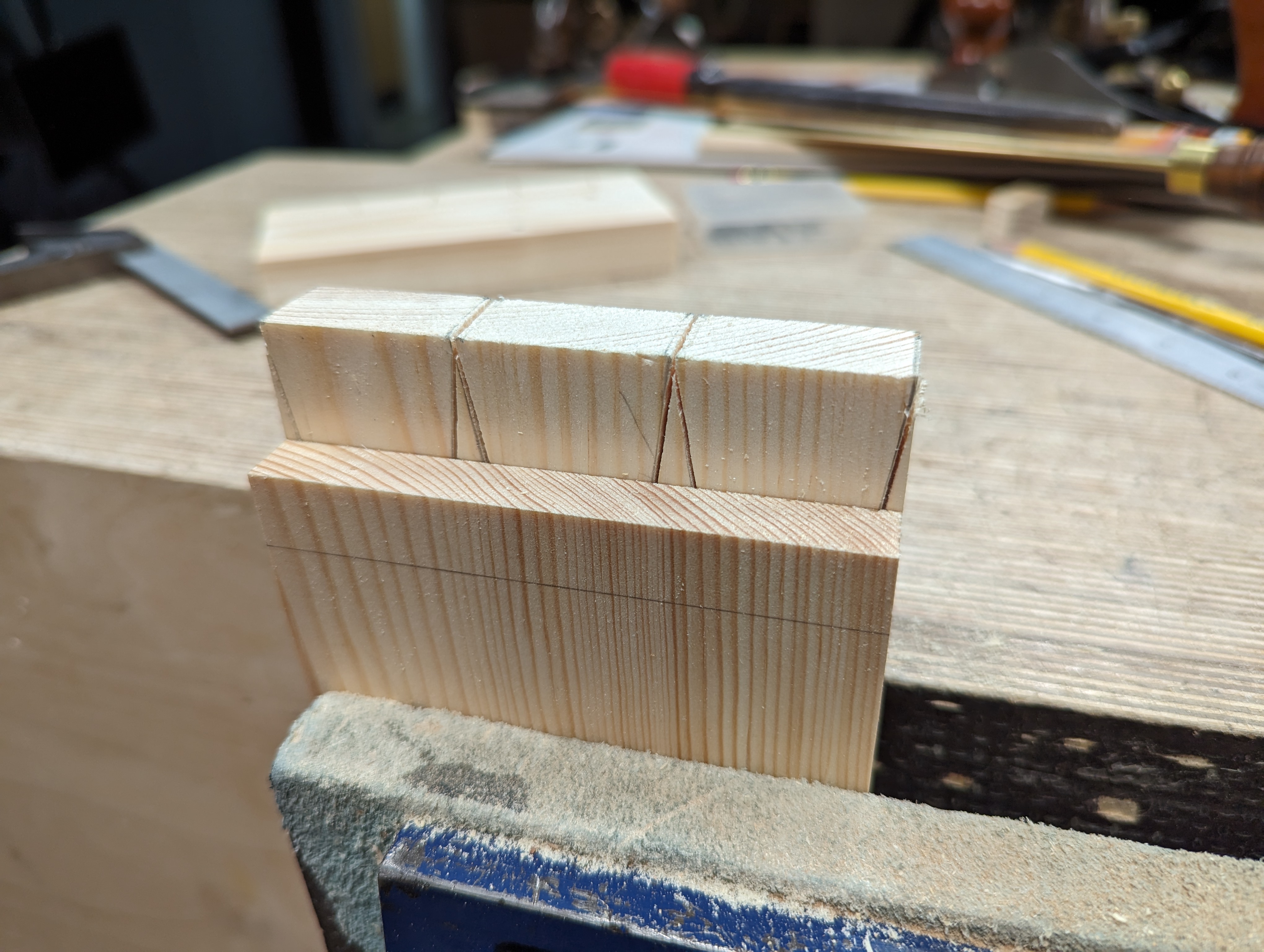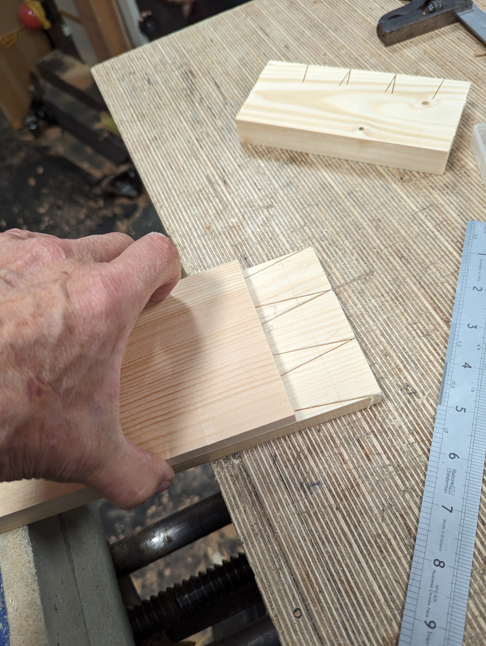 I clamped my two pieces into the vise level with one another. The sacrificial square-across piece is at the back.