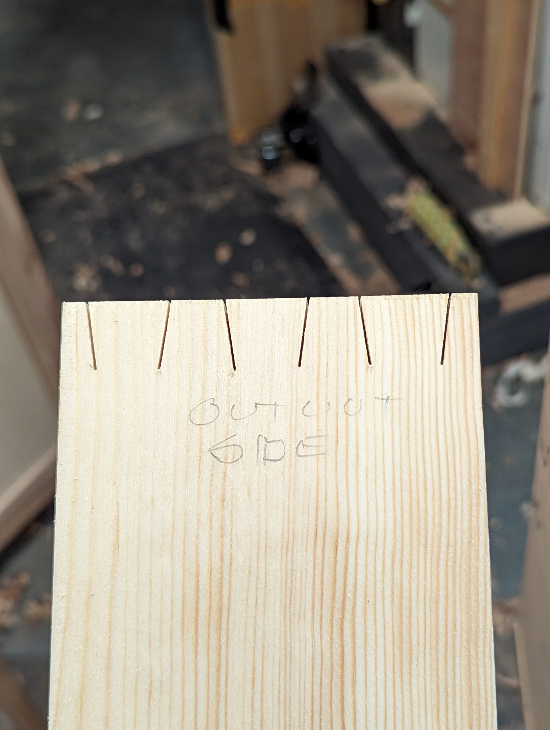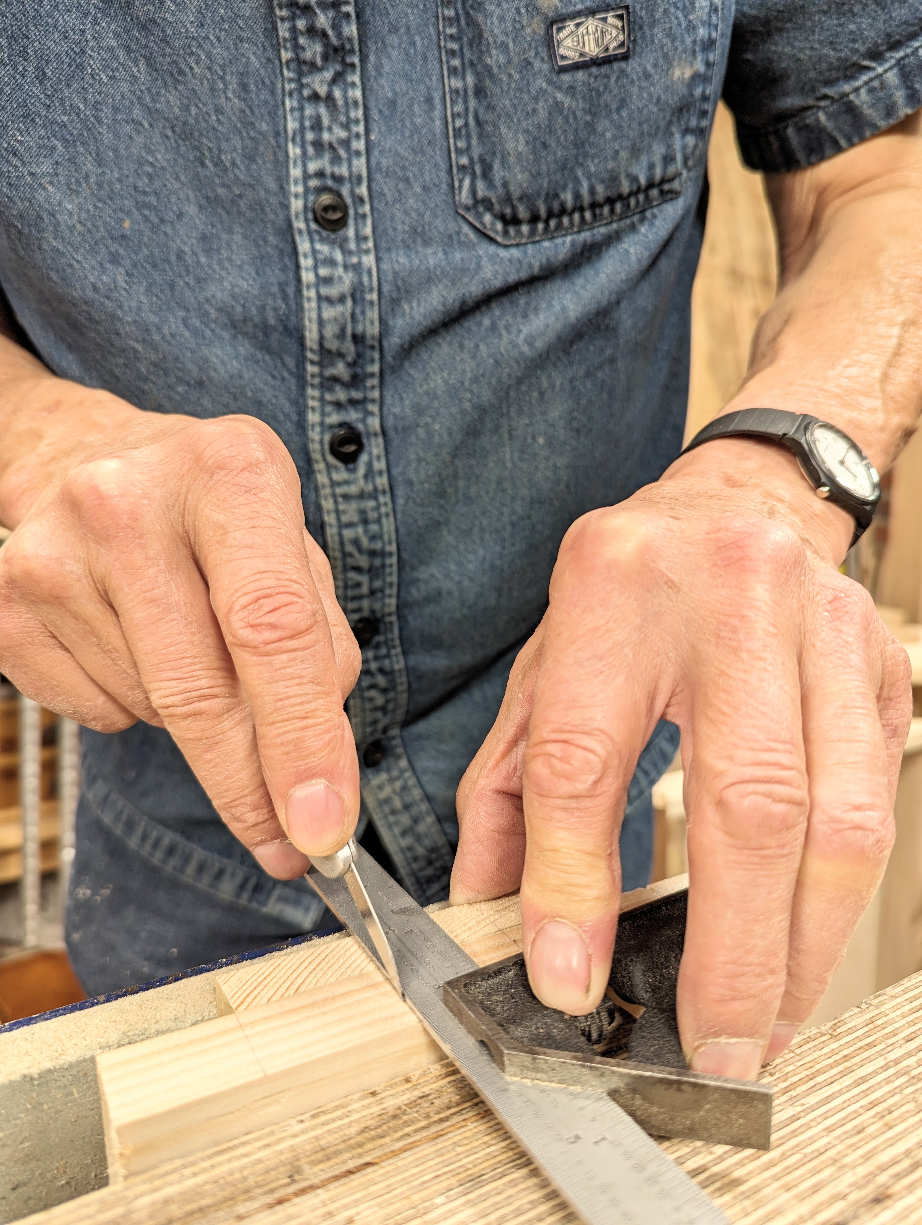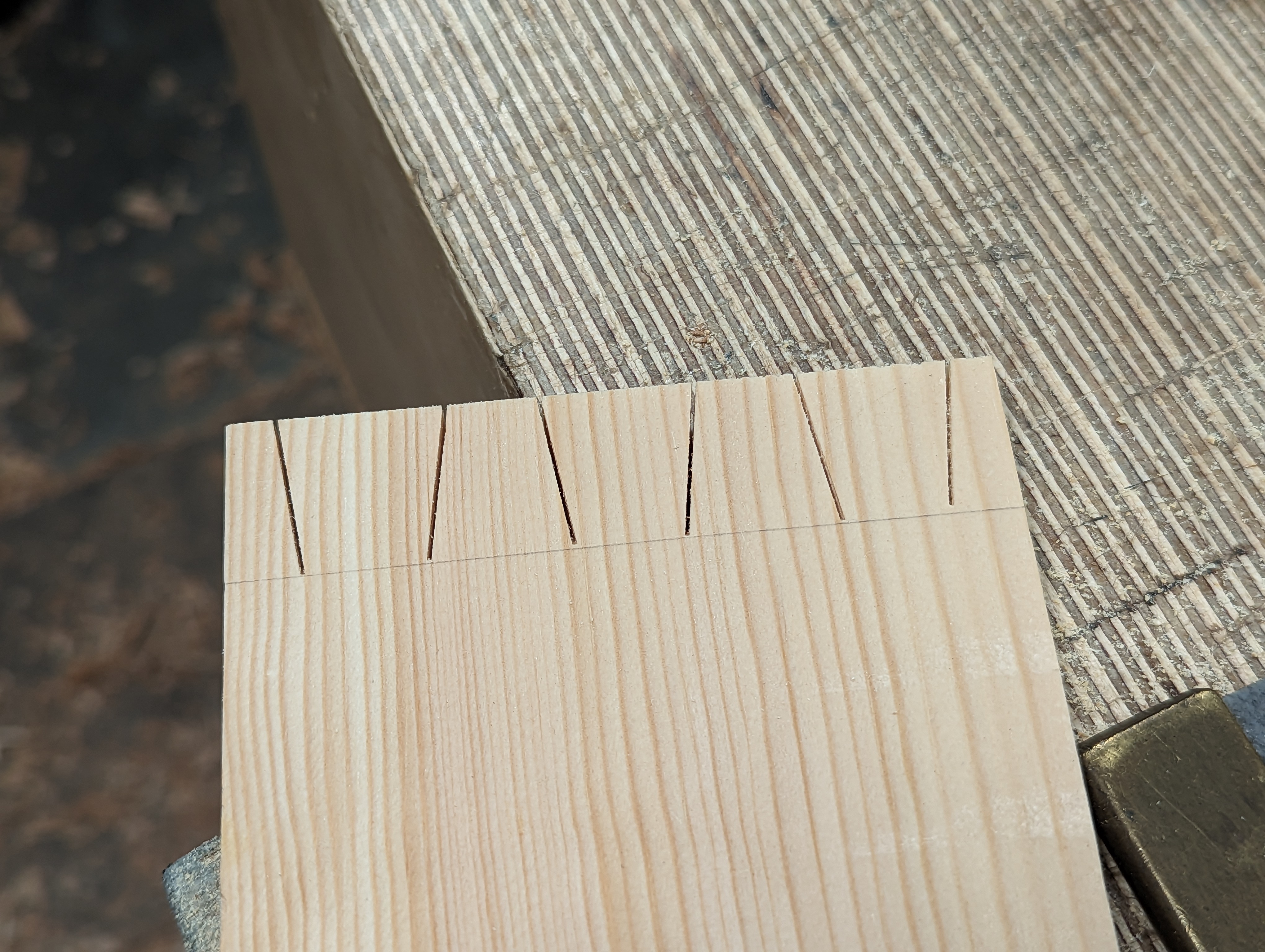 Align the end of the workpiece with the distance line according to the width of the dovetails you want. In this case, I went for the 1/4" pins with half pins of 1/8" on the outer edges.