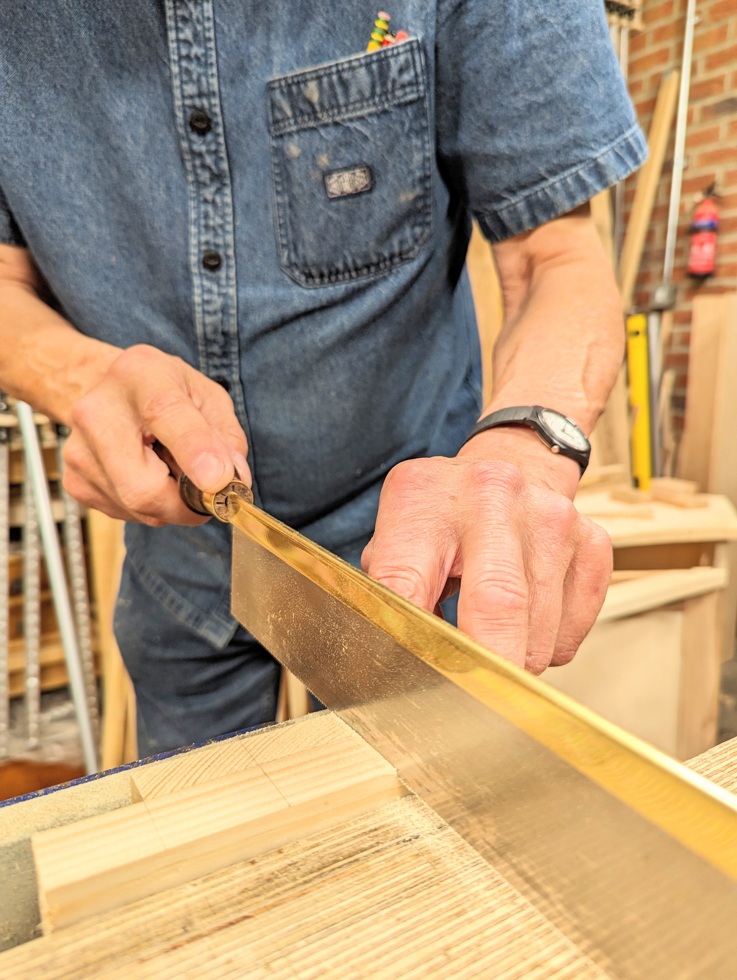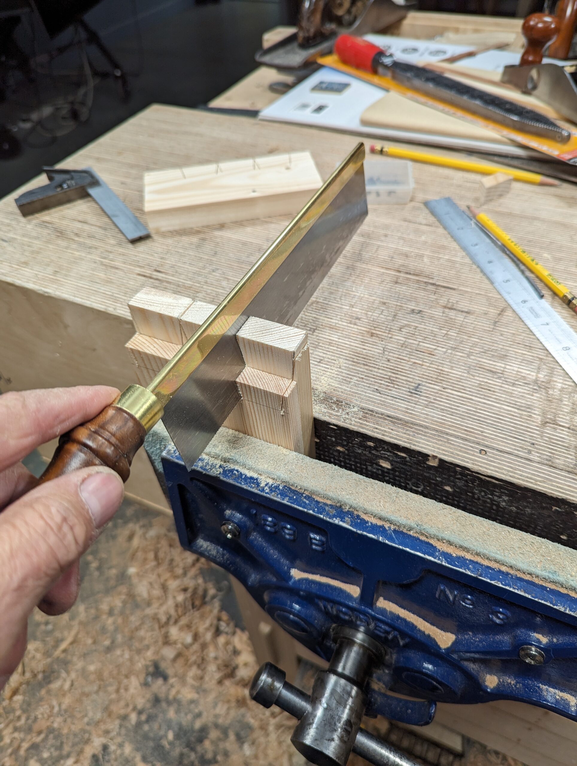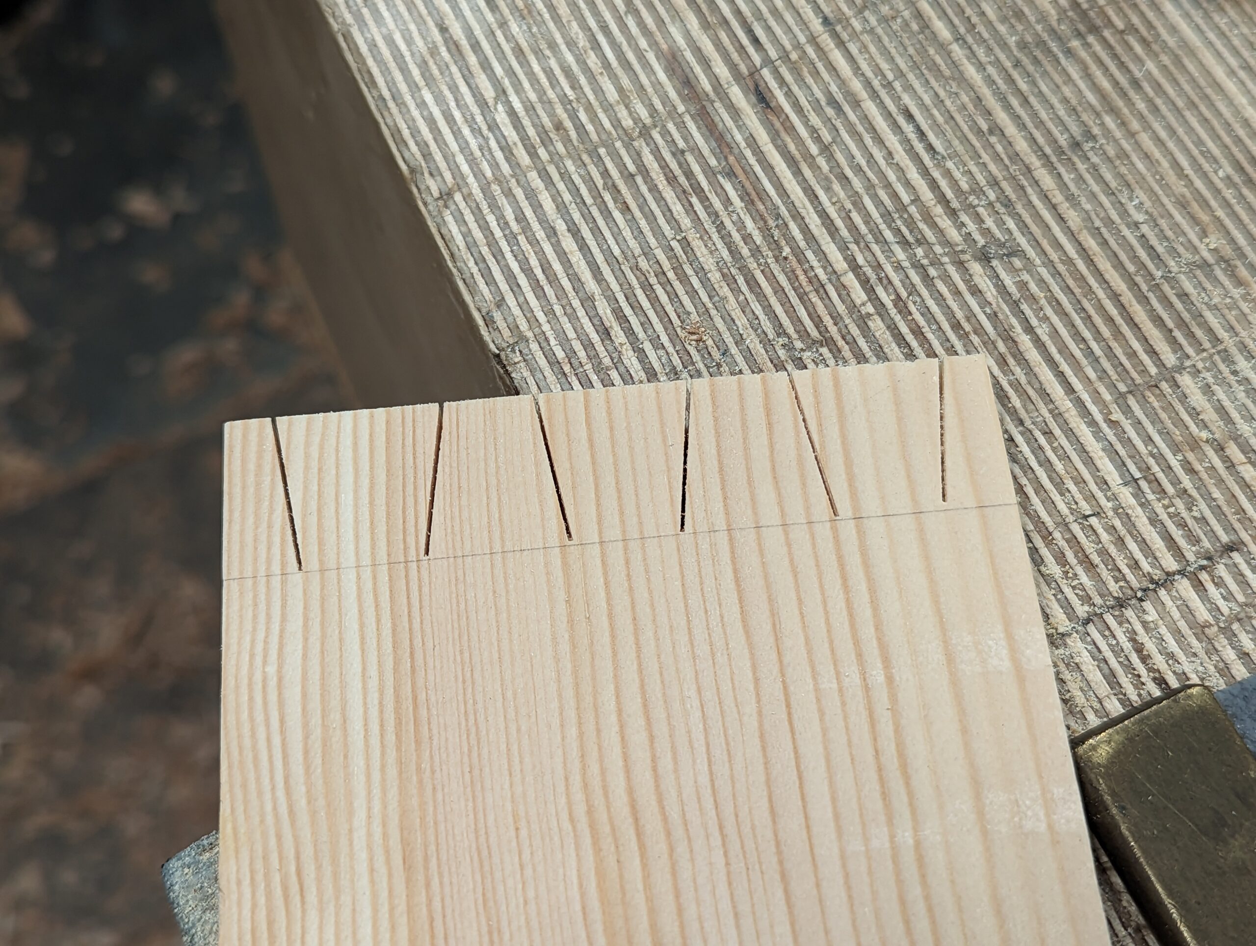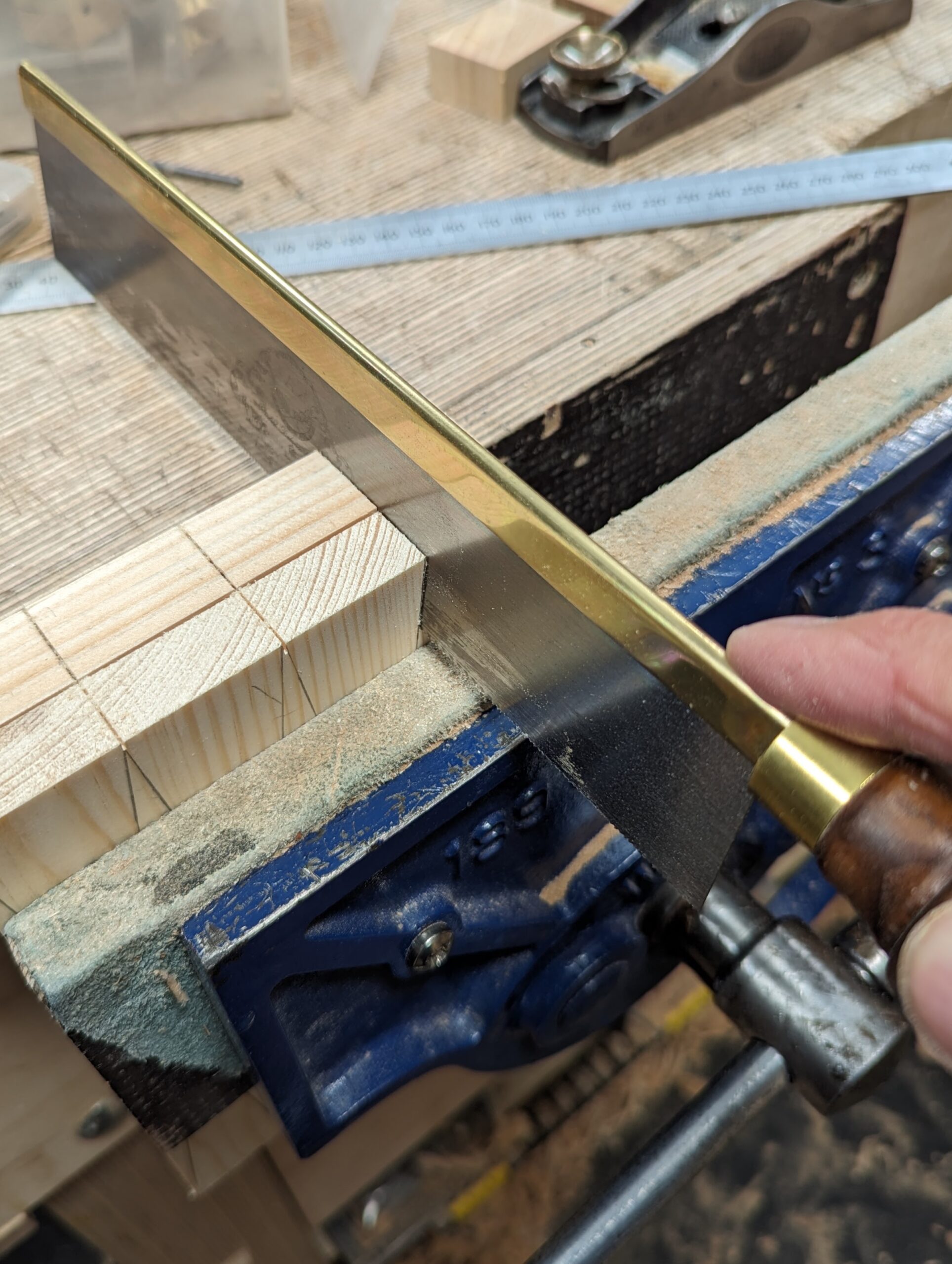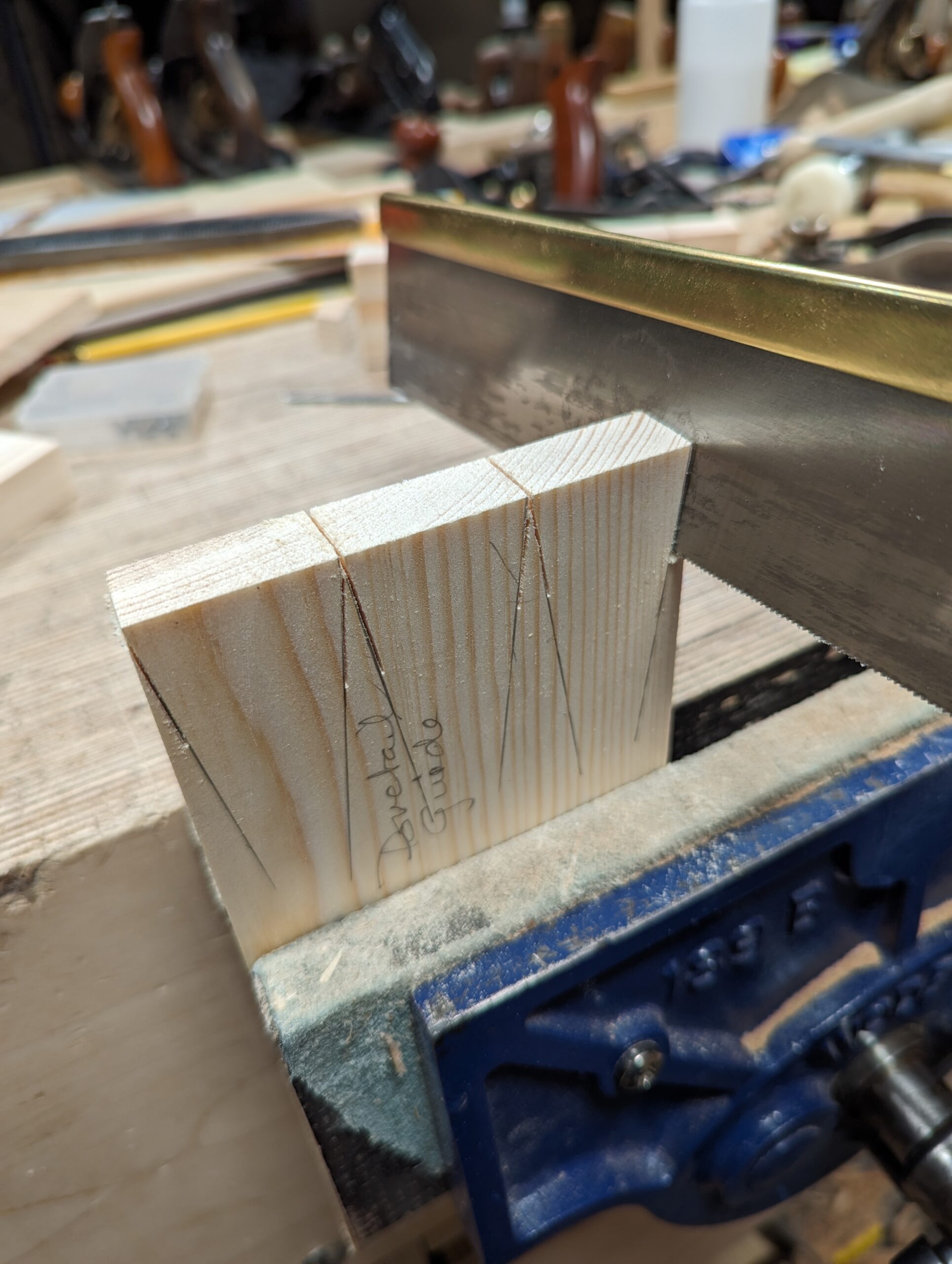 It works really well with Western saws because there is zero of the flex associated with pull-stroke saws. This also preserves the cuts in the guide for future use so I think I could get about a hundred dovetails off the one guide. Also, worth doing, why not make three or four guides from this one when it is so brand new?
